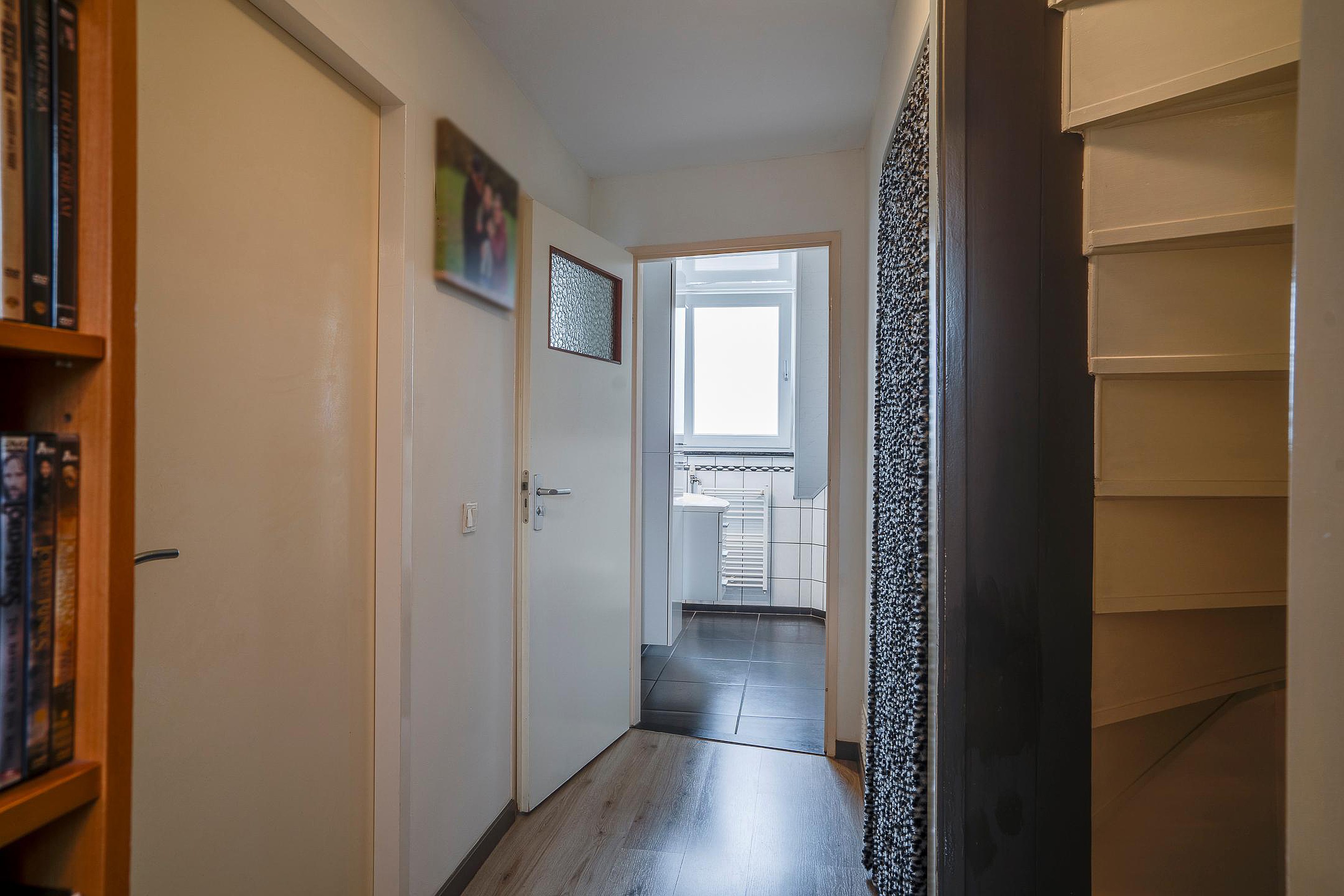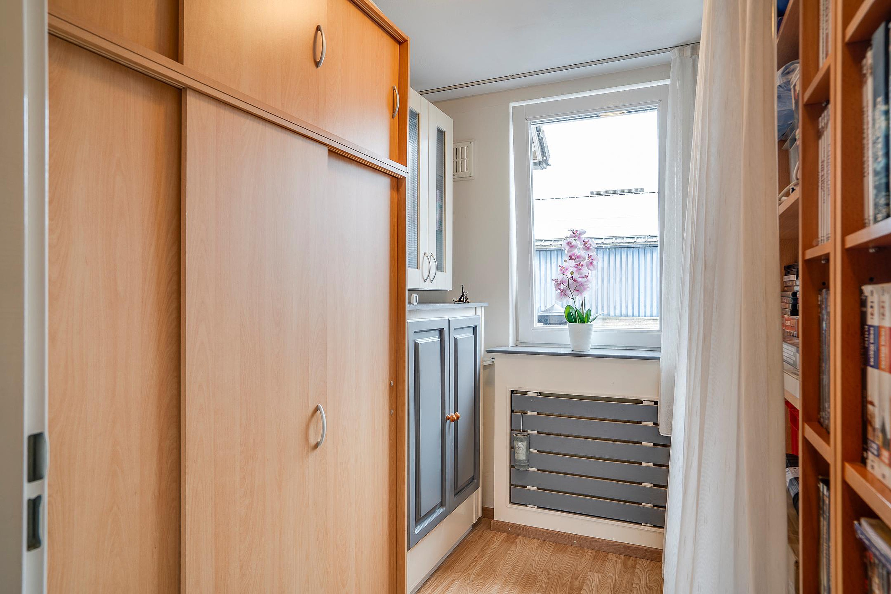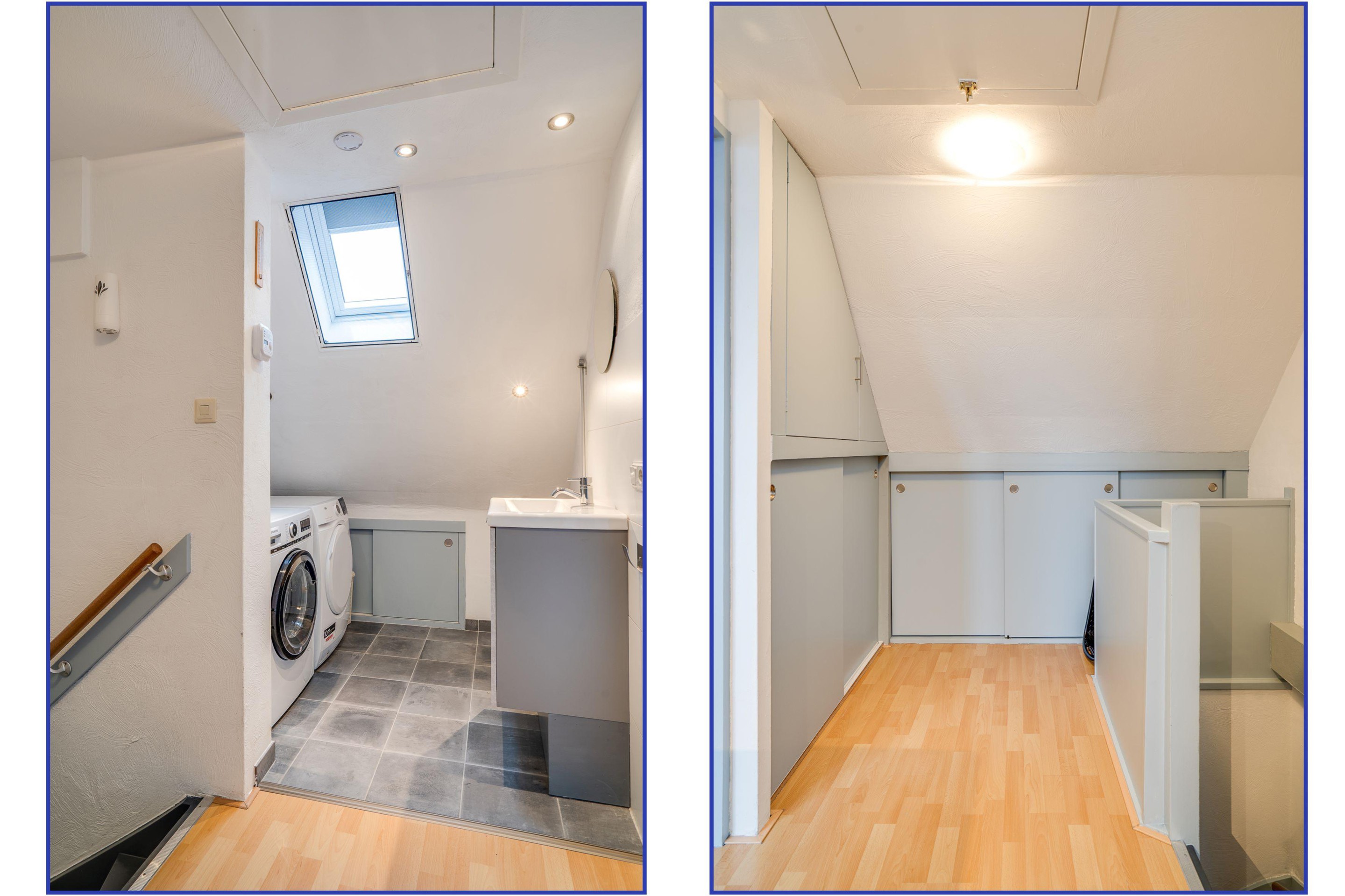 Op de overloop, voorzien van een dakraam en een wastafel met spiegel, bevinden zich de gehuurde Remeha CV-ketel (2019), de aansluitingen voor het witgoed en de toegang tot de vliering voor extra opslag. Achter keurige schuifdeuren is bovendien extra bergruimte gecreëerd, waardoor alles netjes en overzichtelijk kan worden opgeborgen.