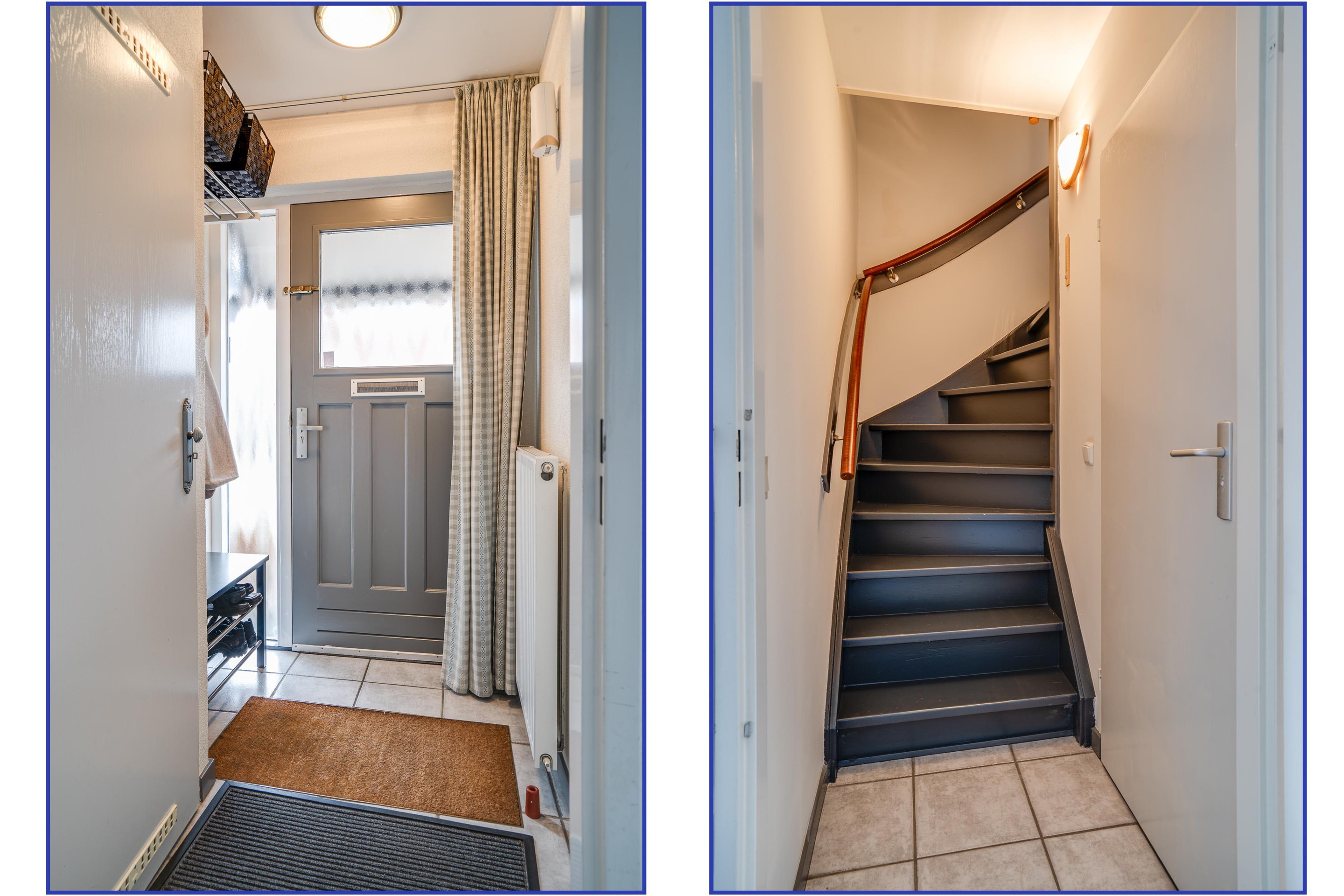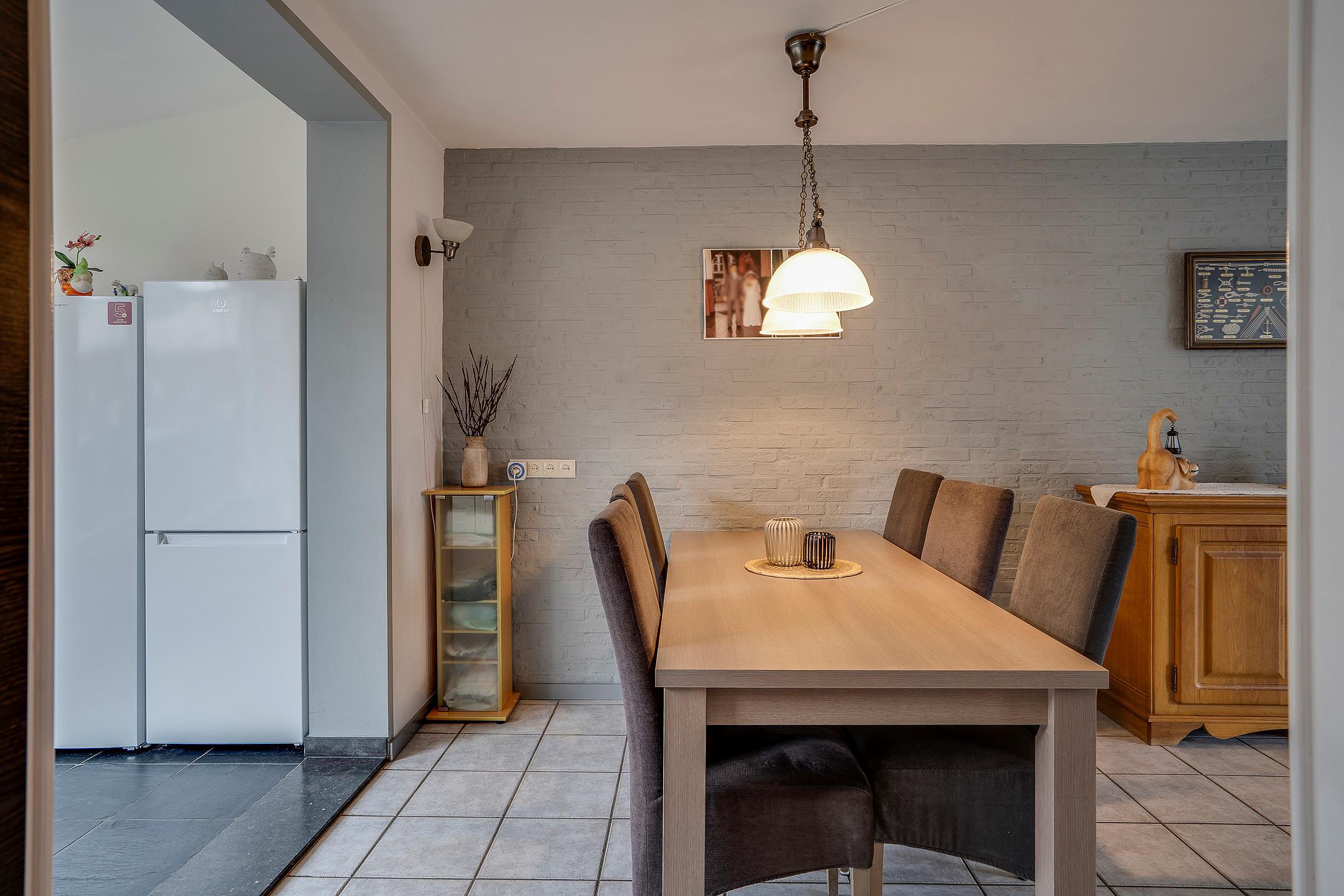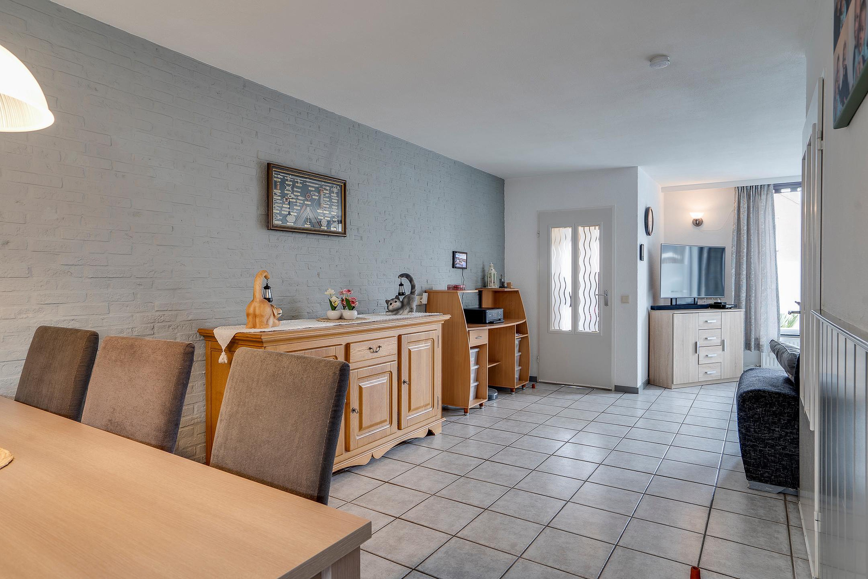 Bij binnenkomst via de voorzijde stap je de verzorgde hal binnen, sfeervol afgewerkt met een lichte tegelvloer. Vanuit deze ruimte heb je direct toegang tot de woonkamer, een praktische garderobe en de meterkast.
