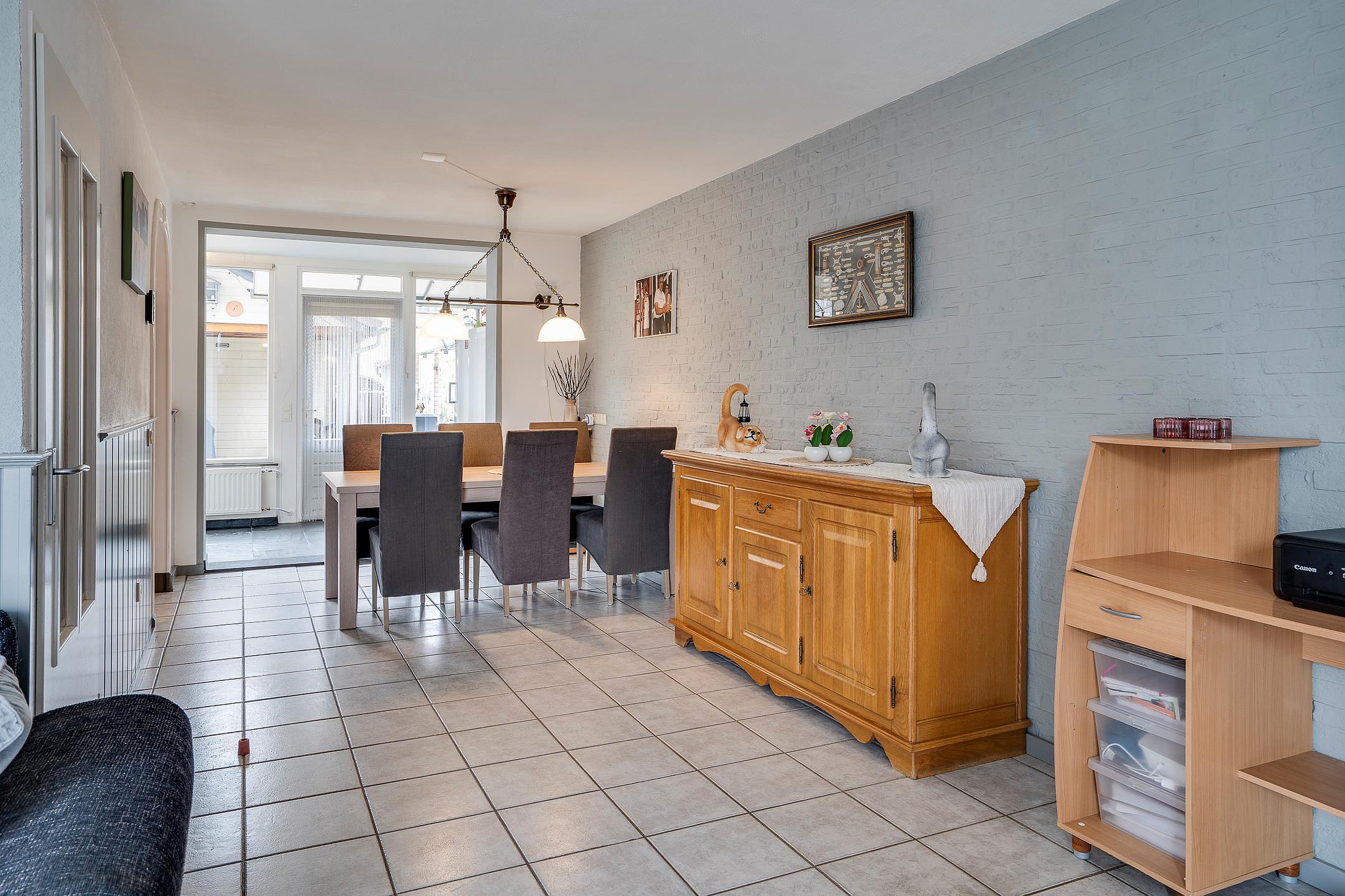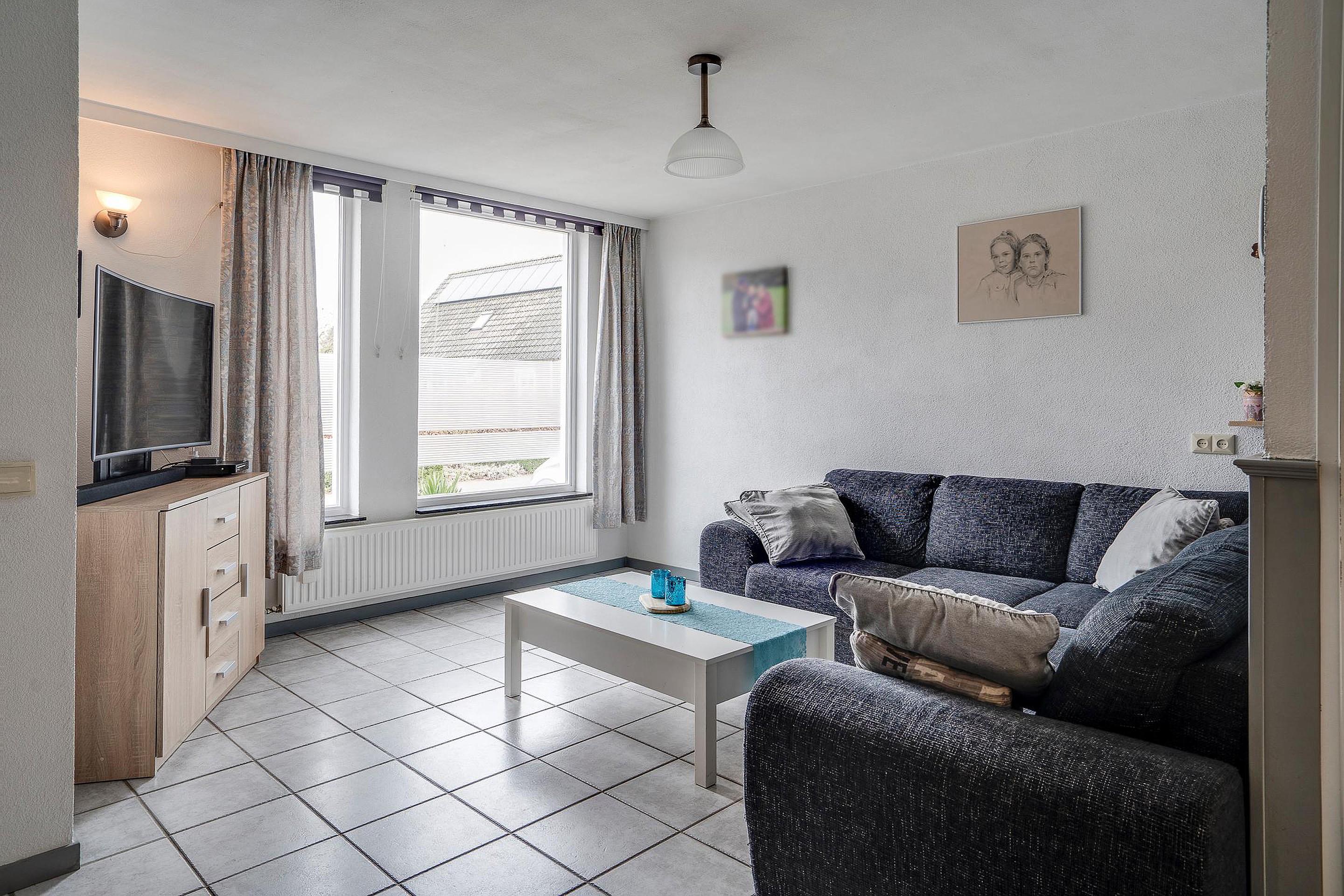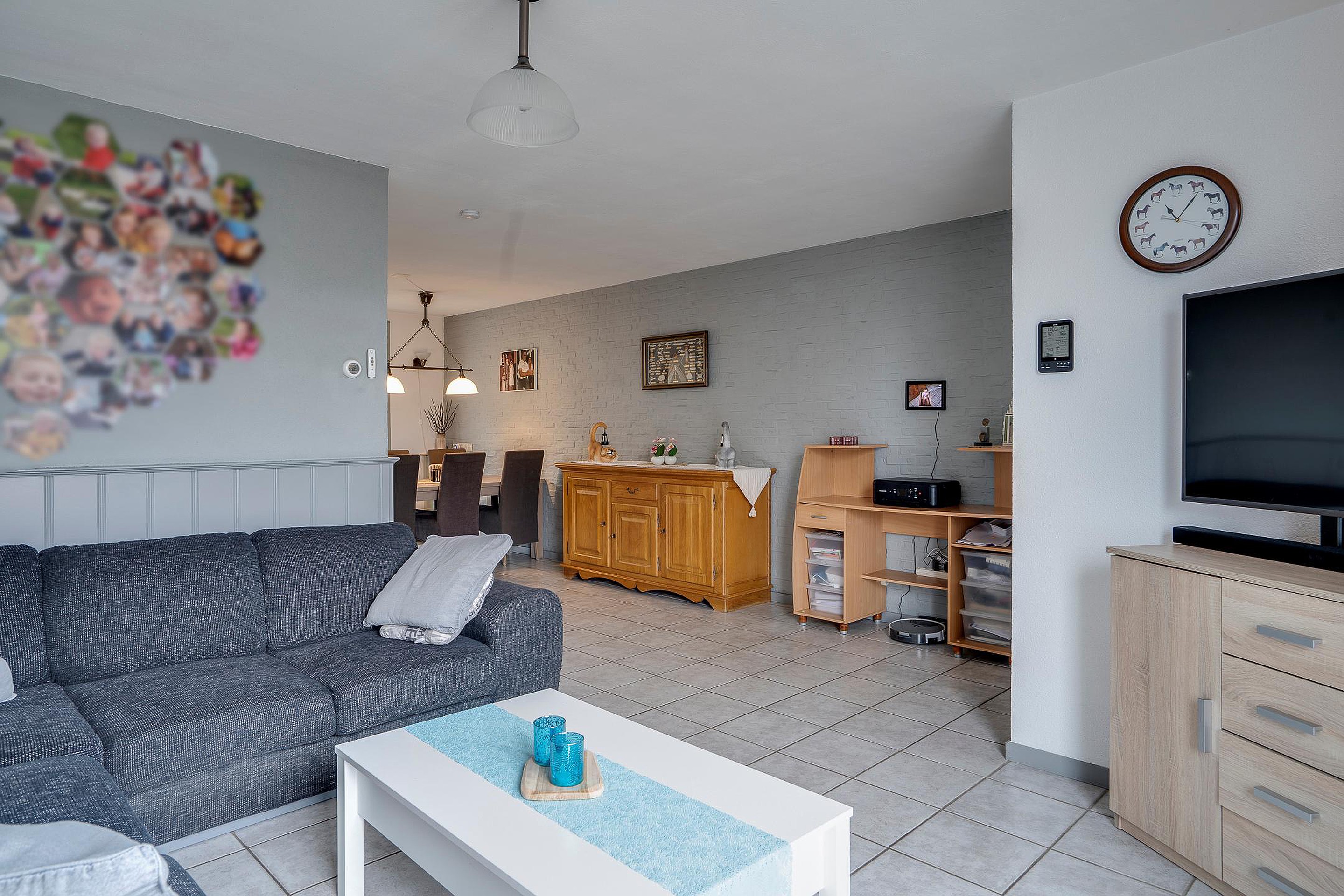 De lichte L-vormige living is drempelloos afgewerkt met een tegelvloer die doorloopt tot aan de uitbouw en in de open keuken, waardoor een ruimtelijk en samenhangend geheel ontstaat.