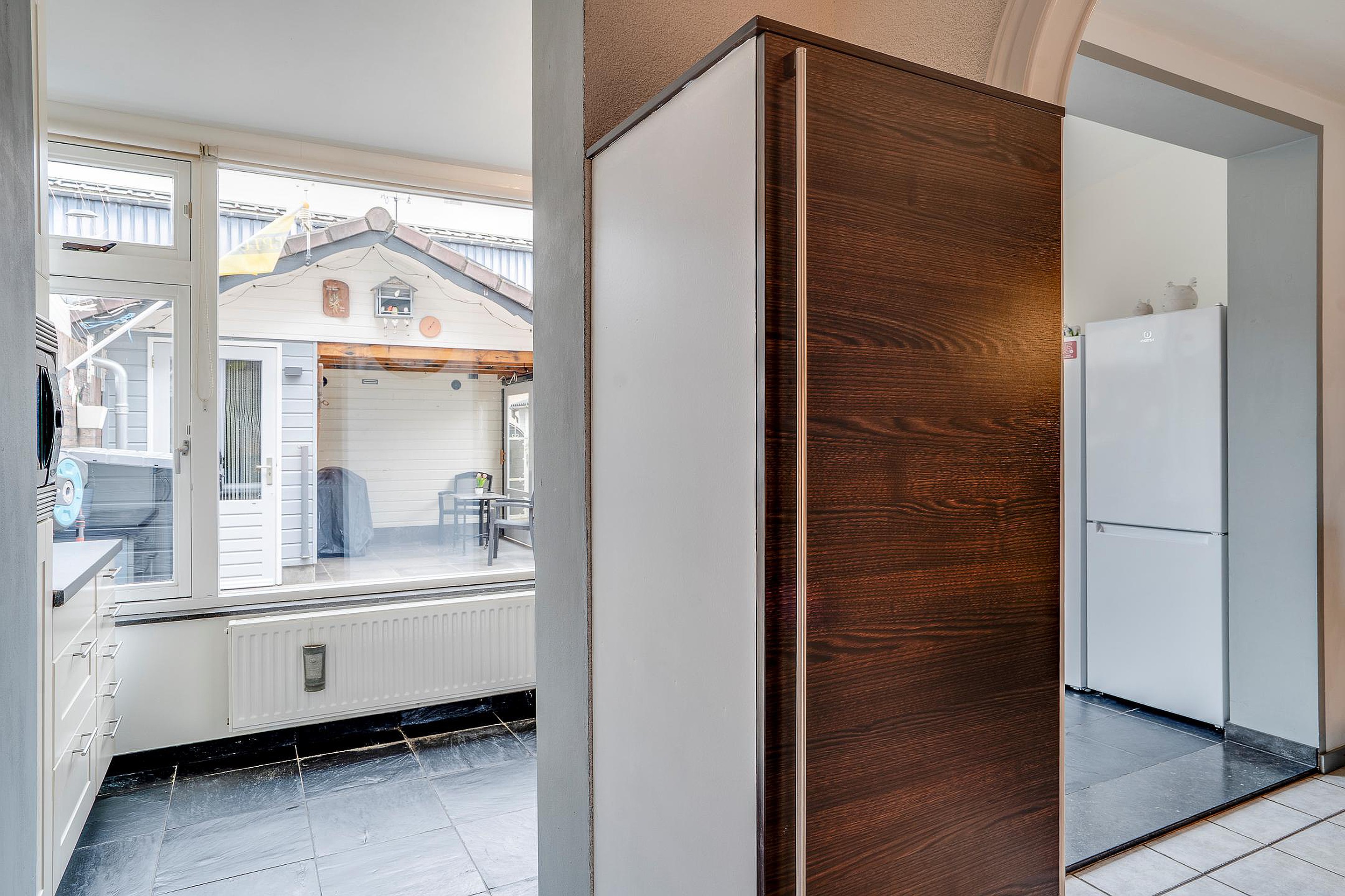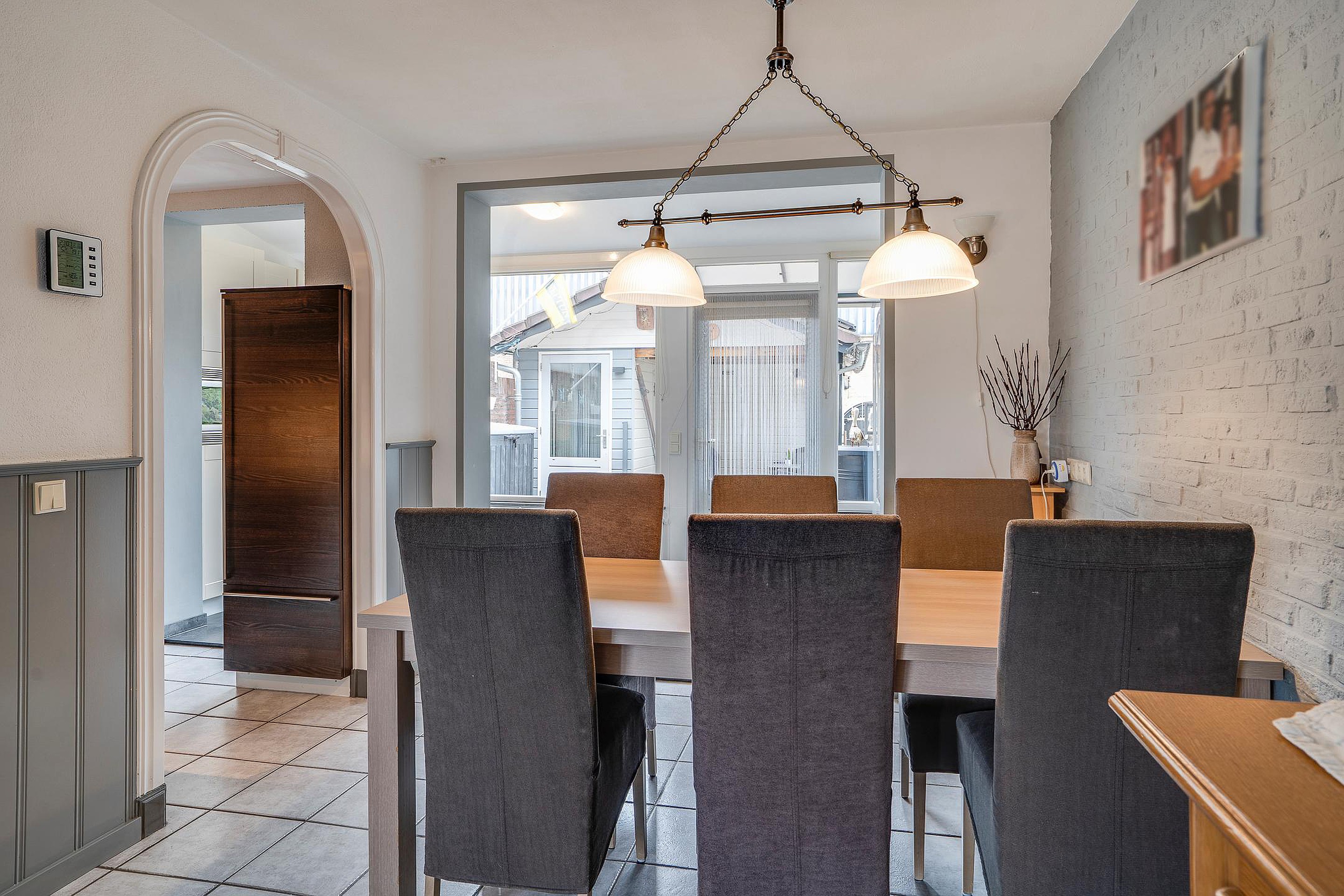 De open keuken aan de achterzijde vormt een natuurlijke verbinding tussen woonkamer, eetkamer en tuin. De keuken, in hoekopstelling, uit 2007 is volledig uitgerust met hoogwaardige inbouwapparatuur, waaronder een 5-pits inductiekookplaat, combimagnetron, afzuigkap, koelkast en vaatwasser – ideaal voor wie van koken en gezellig samen eten houdt.