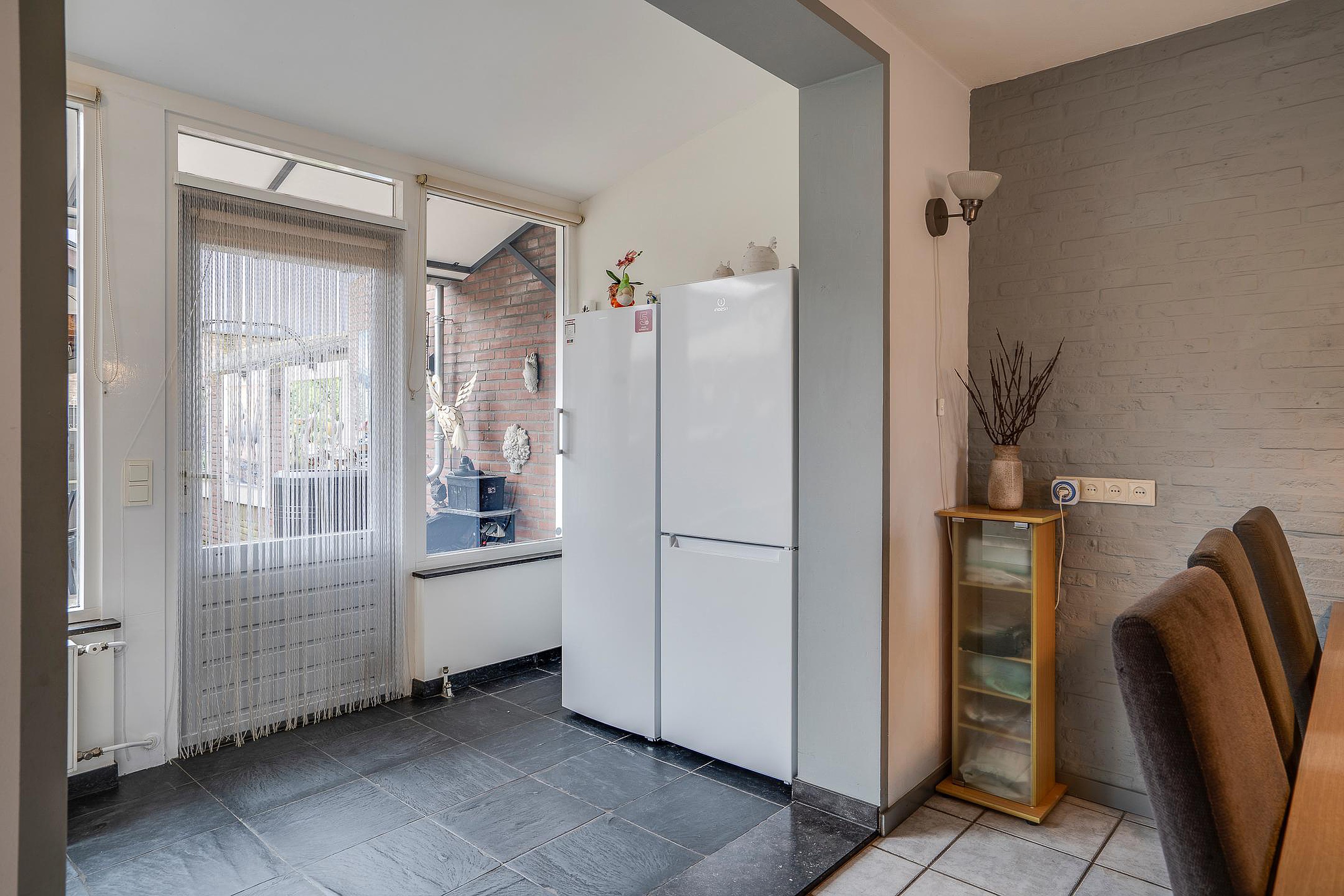 De ruime uitbouw aan de achterzijde, voorzien van een stijlvolle donkere natuurstenen vloer, biedt extra leefruimte en directe toegang tot de zonnige achtertuin. Zo ontstaat een natuurlijke verbinding tussen binnen en buiten en geniet je van een lichte, open en uitnodigende woonomgeving.
