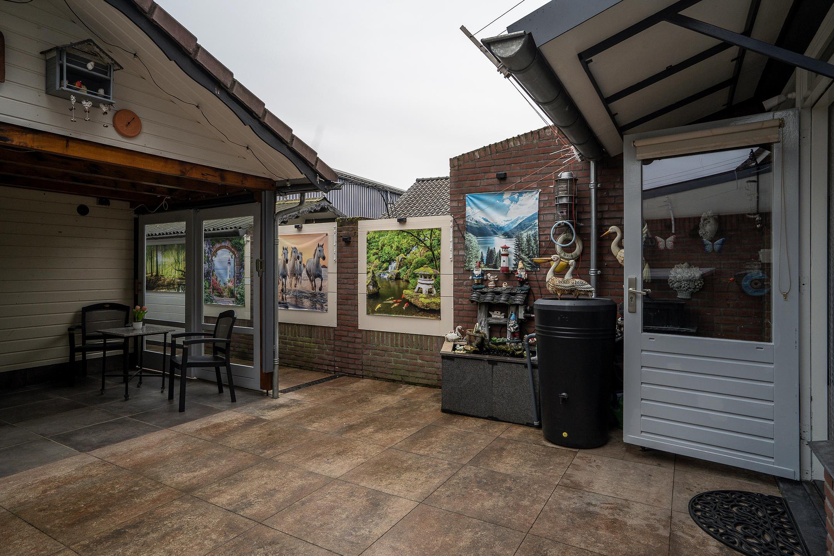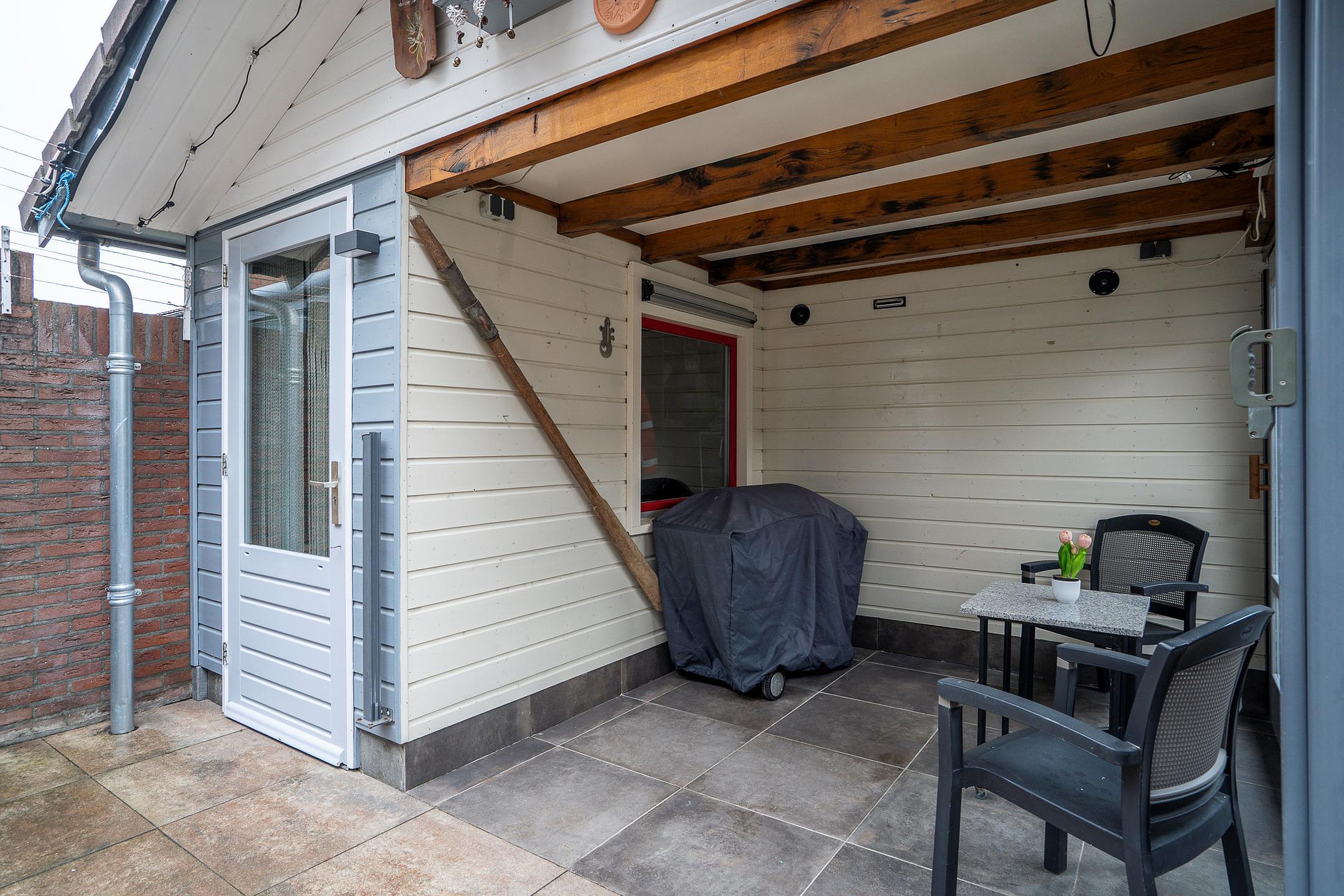 De onderhoudsvriendelijke achtertuin is volledig betegeld en op het zuidwesten gelegen, waardoor je de hele dag van de zon kunt genieten. De tuin is zowel bereikbaar via de uitbouw / keuken als via de eigen achterom. Dankzij de overkapping in de geïsoleerde buitenberging is het ook in alle jaargetijden comfortabel buiten zitten. Bovendien biedt deze berging extra opslagruimte voor bijvoorbeeld tuingereedschap en fietsen, of kan hij gebruikt worden als hobbyruimte.