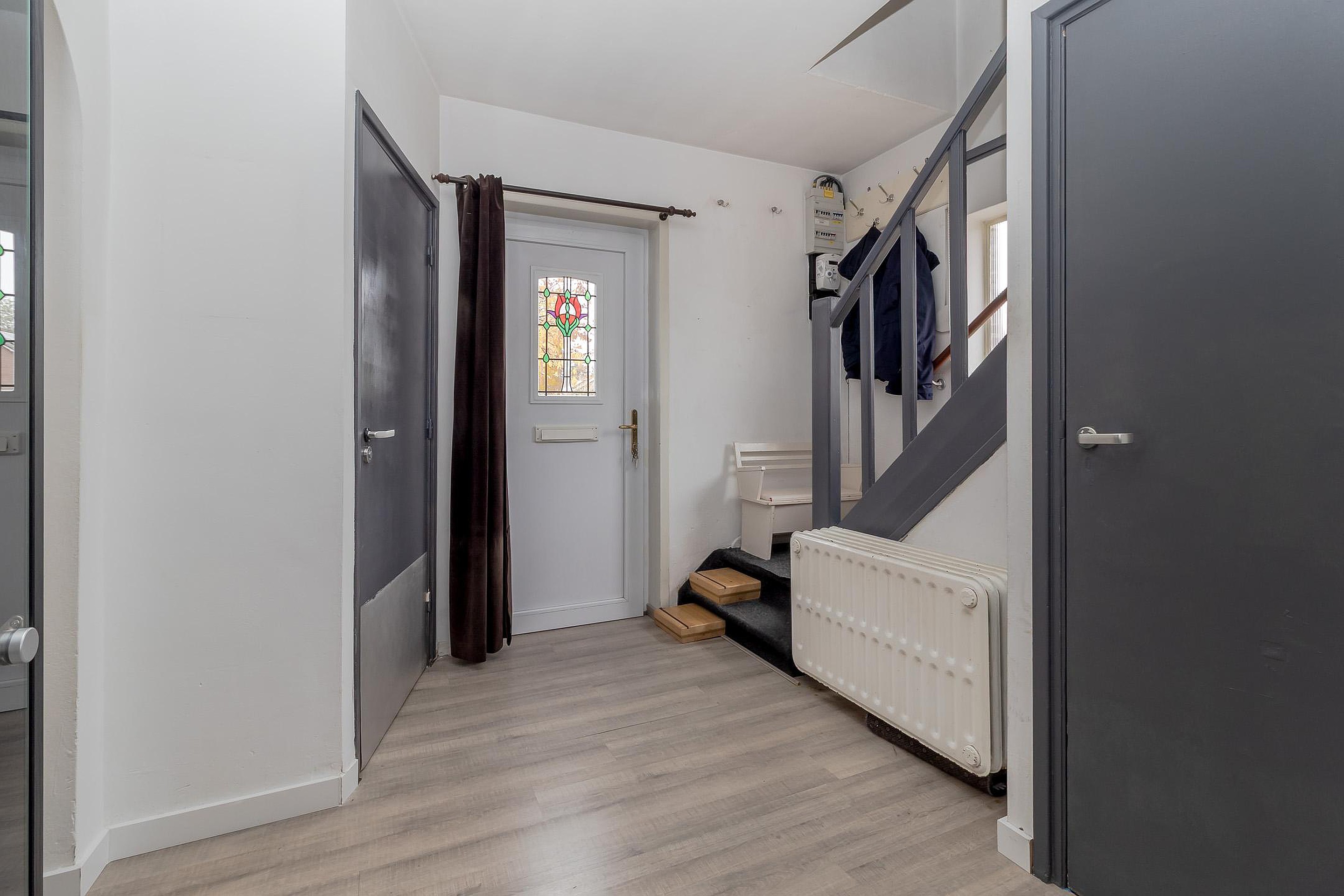 - Entree met trapopgang naar de eerste verdieping, toegang tot de provisiekelder, zekeringenkast en geheel betegelde toiletruimte met duoblok.
