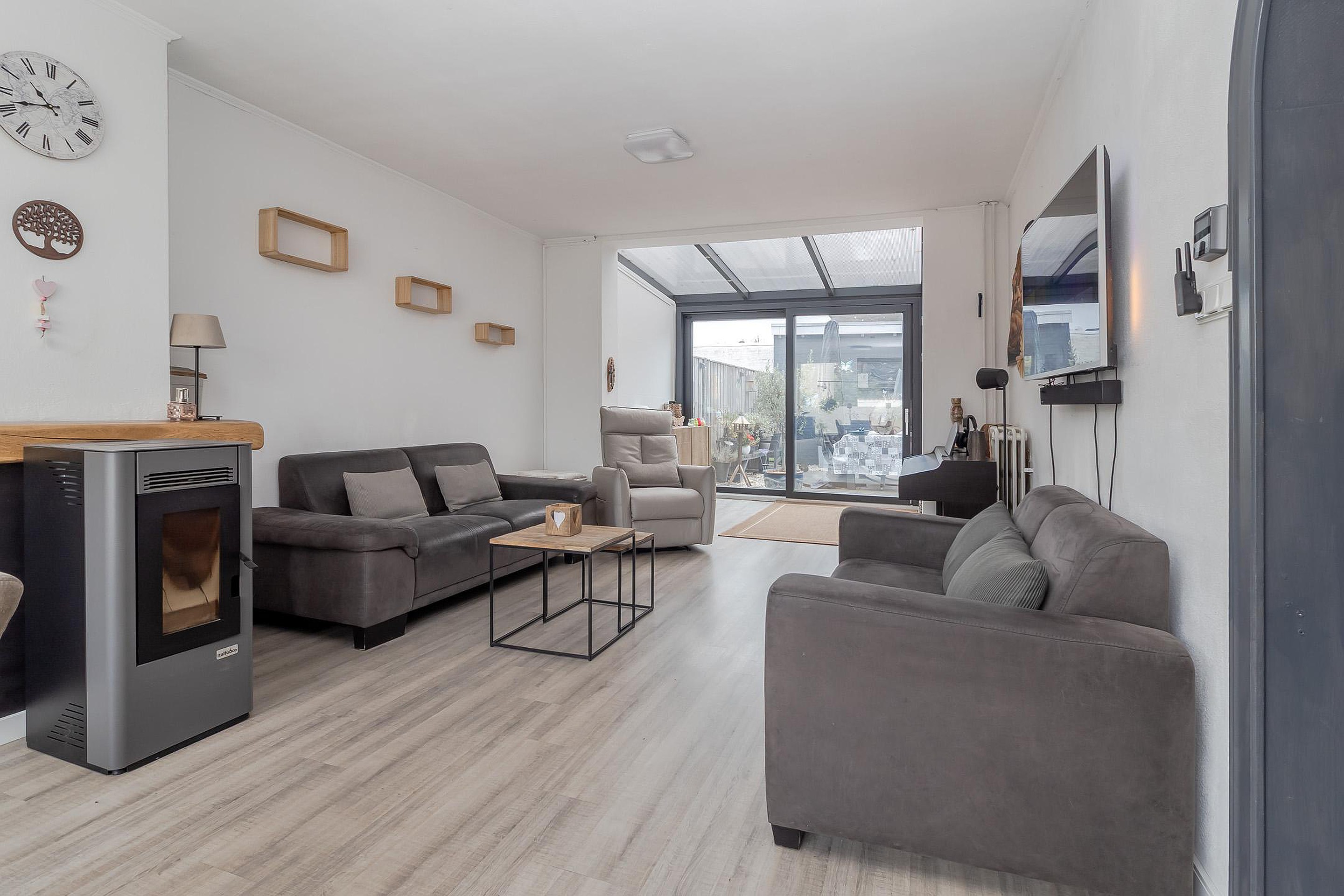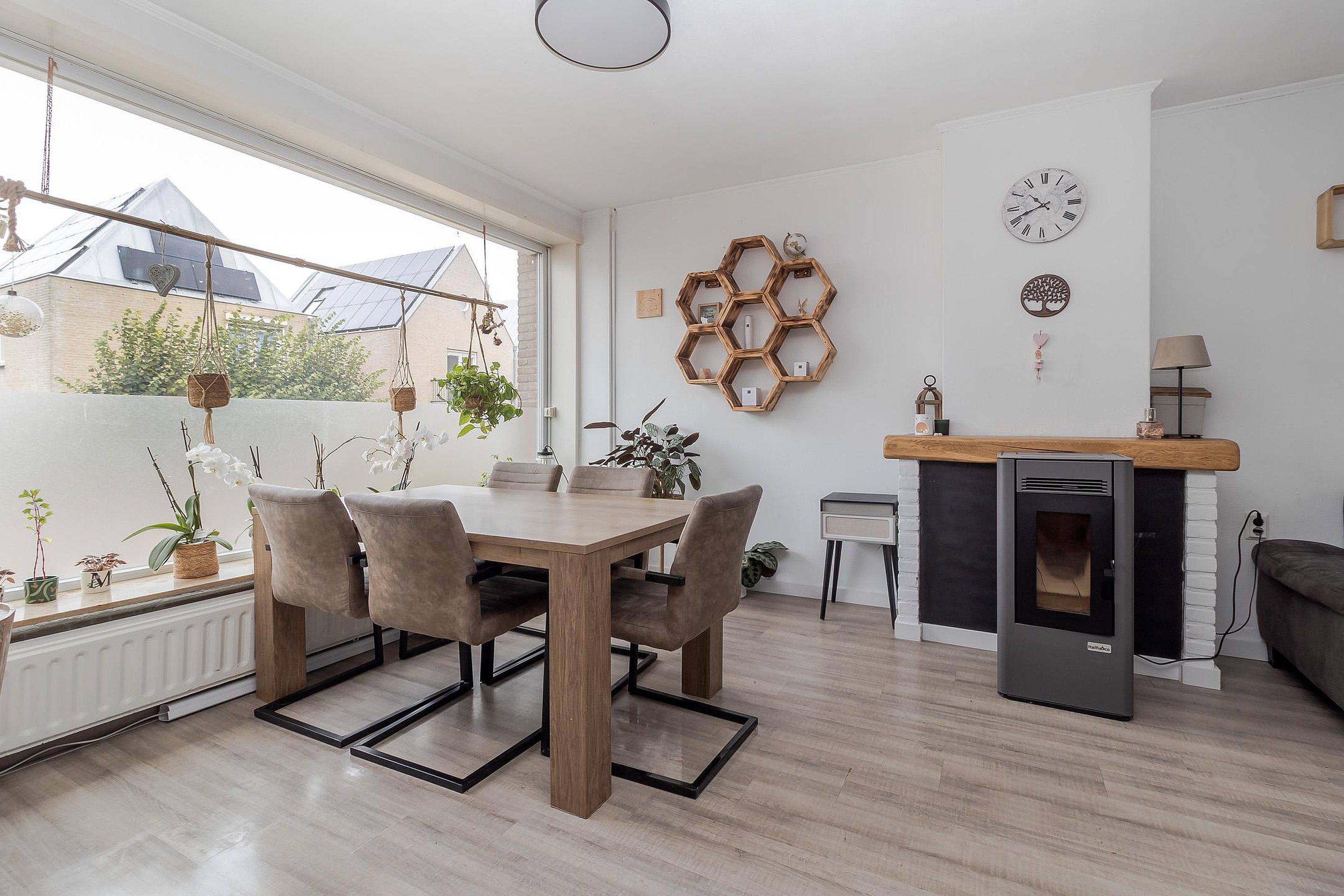 - Woonkamer (circa 25 m2) voorzien van een pvc vloer en een schouw met pelletkachel (ter overname). Een grote raampartij aan de voorzijde zorgt voor veel lichtinval.