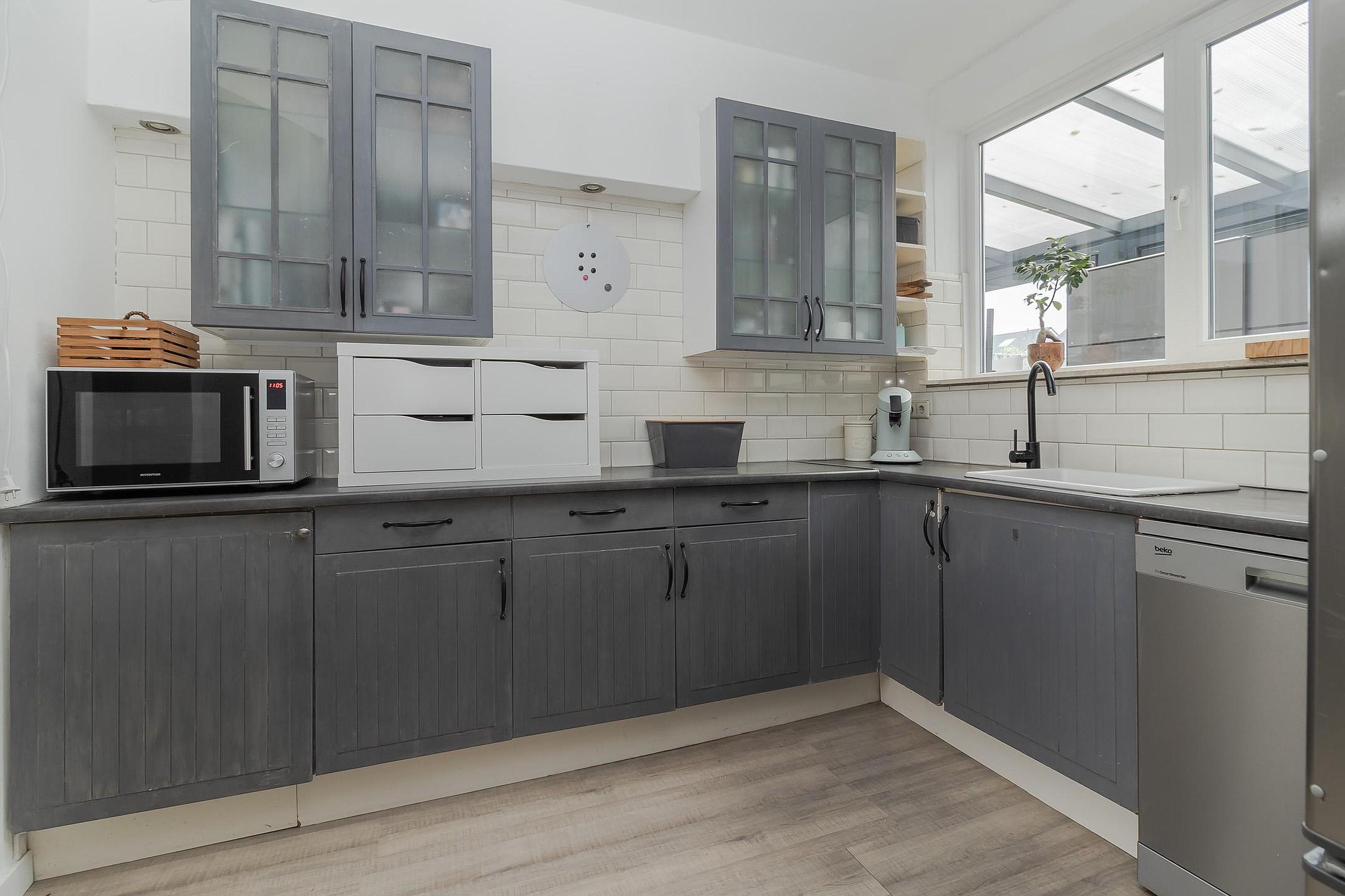 - Separate keuken (circa 8 m2) voorzien van een keukeninstallatie in hoekopstelling m.o.m. fornuis met gaskookplaat en oven, afzuigkap en vaatwasser. Vanuit de keuken is er een deur naar de badkamer.