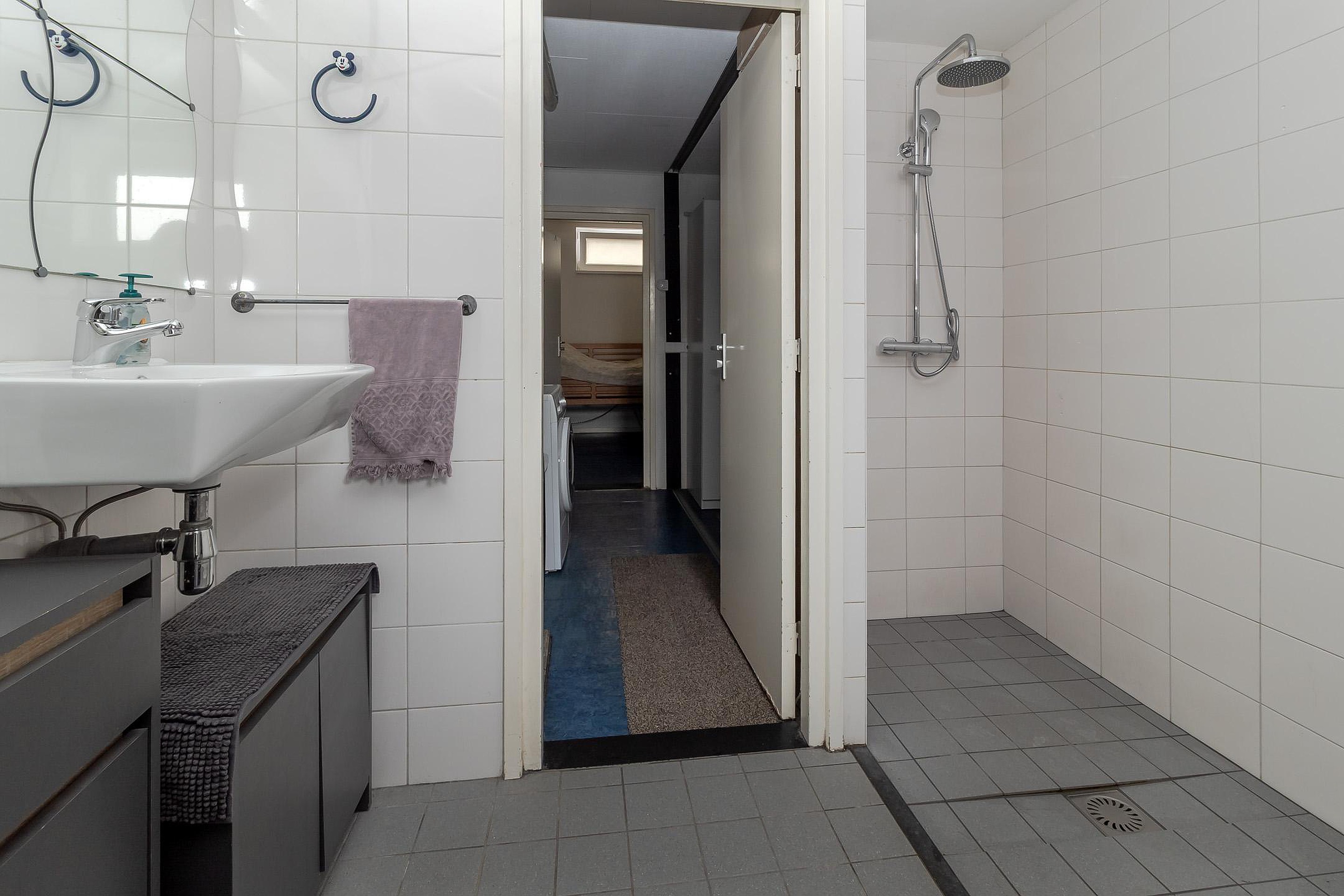 - De badkamer (circa 5,5 m2) is geheel betegeld en voorzien van een douche en een wastafel.