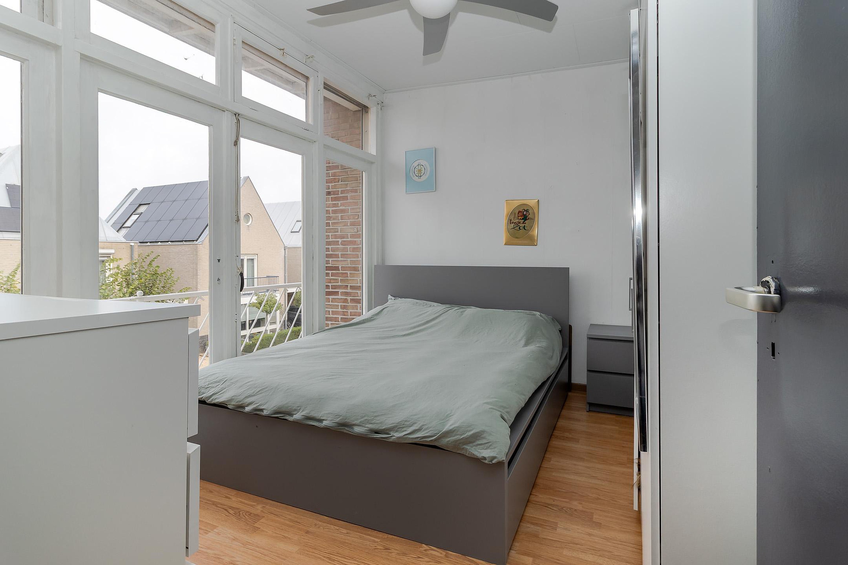 - Slaapkamer 1 (circa 10 m2), gelegen aan de voorzijde van de woning en voorzien van een laminaatvloer en deur naar balkon.