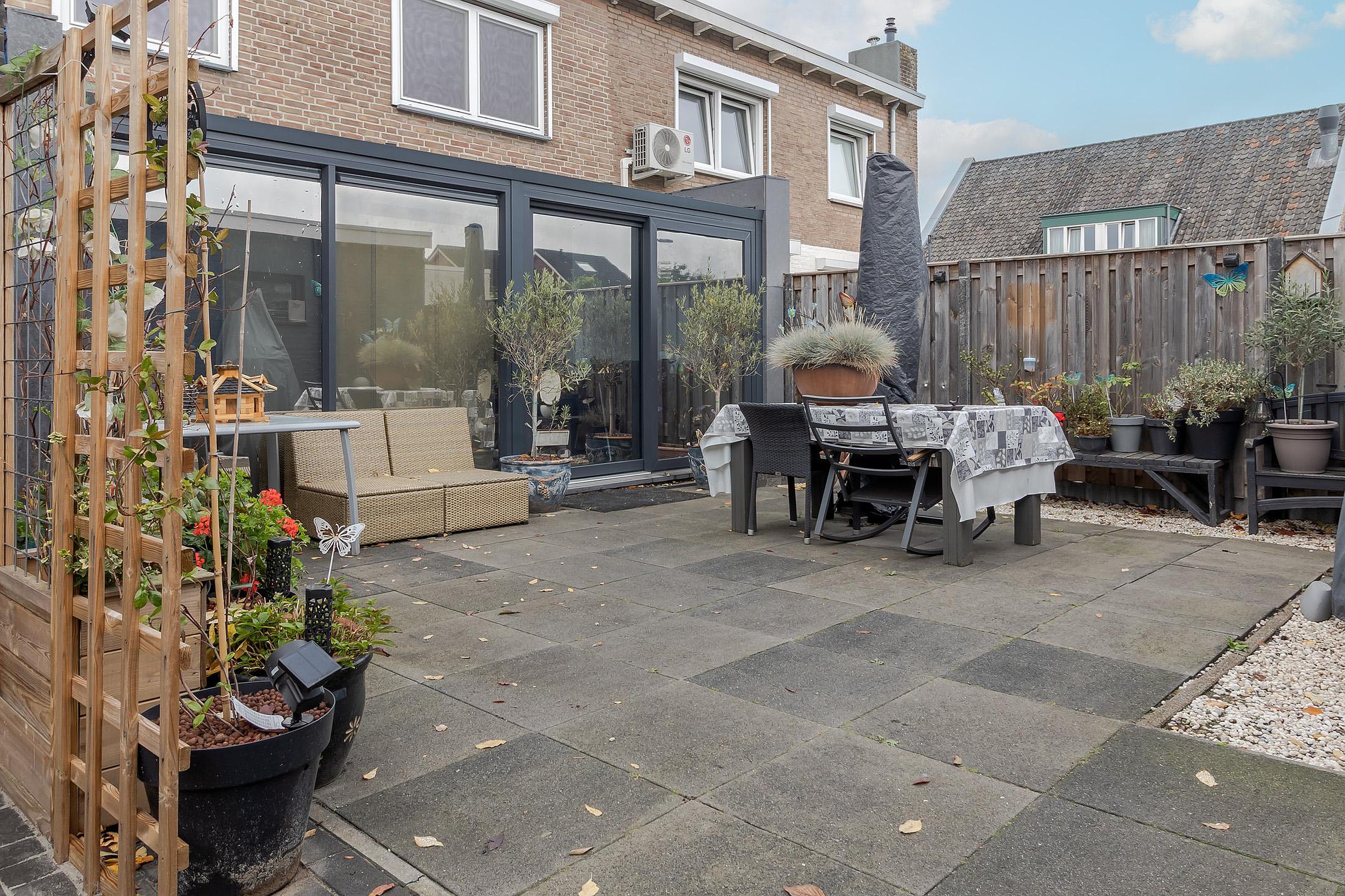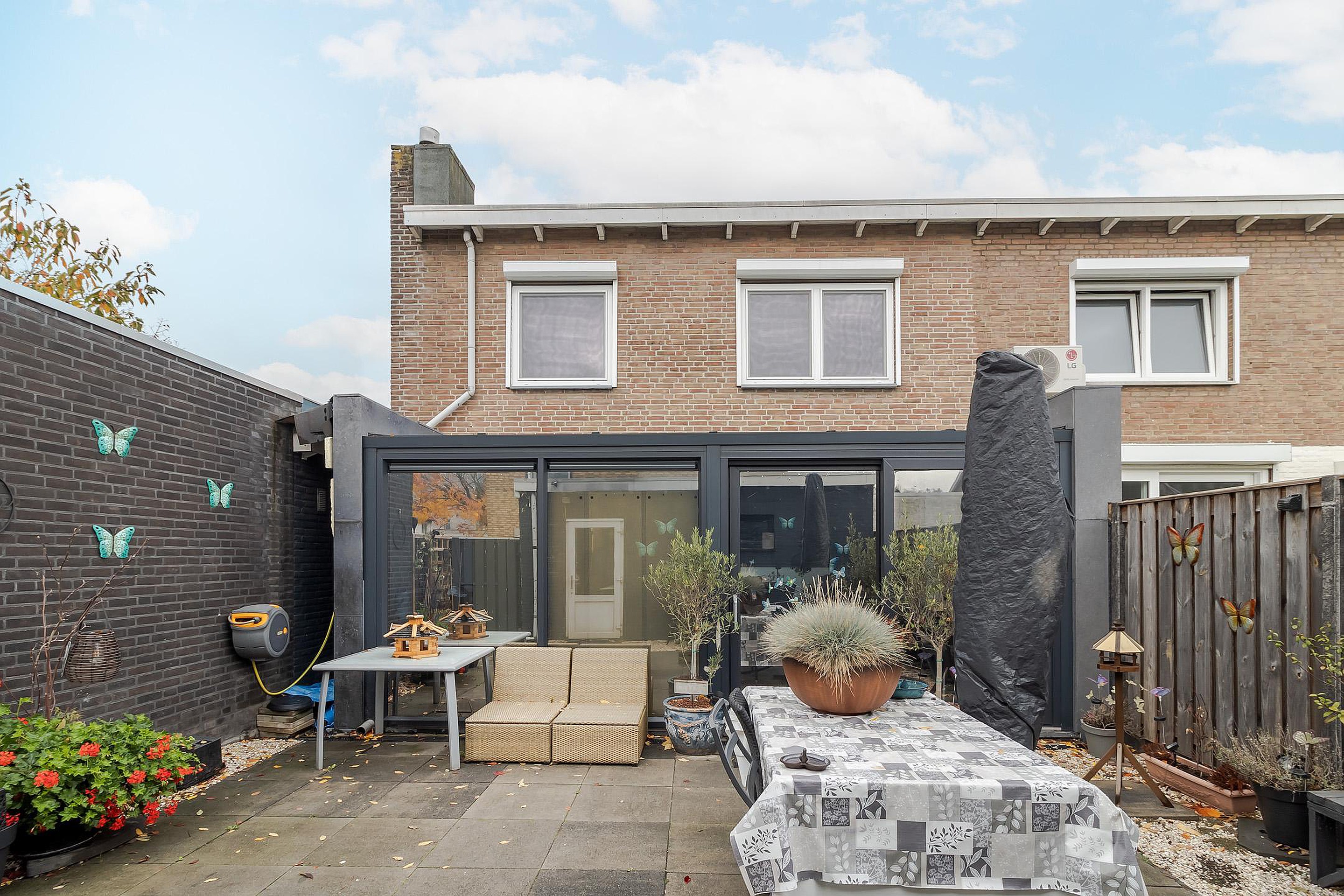 - In het verlengde van de woonkamer is in circa 2017 een fraaie aanbouw (circa 14 m2) gerealiseerd met grote raampartijen en een schuifpui naar de tuin. De aanbouw is voorzien van een laminaatvloer en airco.