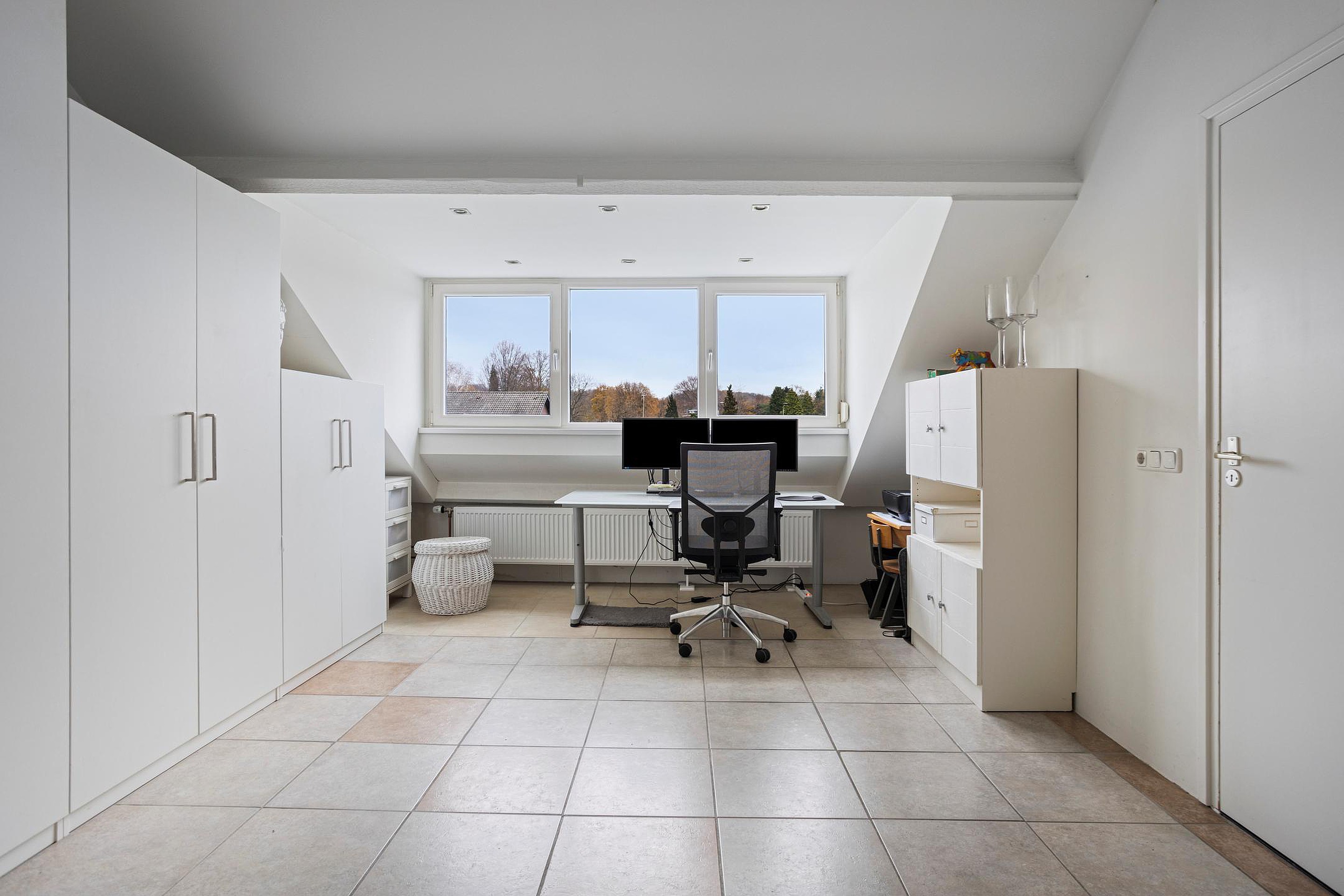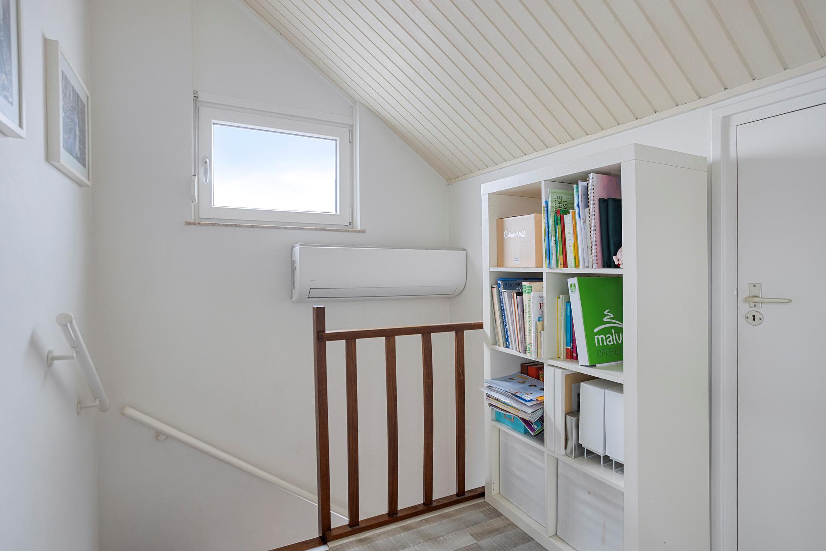 Via de houten open trap bereikt men de zolderverdieping. Aansluitend aan weerszijden van de overloop bevinden zich 2 bergruimtes. Handig voor alle seizoensspullen, ook de omvormer van de zonnepanelen bevindt zich hier. In het trappengat bevindt zich de tweede airco. Slaapkamer IV (ca.26m2) momenteel in gebruik als kantoorruimte, kan middels een wandje gescheiden worden van cv- en de wasruimte. Door de royale dakkapel, die in 2013 is geplaatst heeft men nu een grote extra multifunctionele ruimte met een nokhoogte van ca.2.74m.