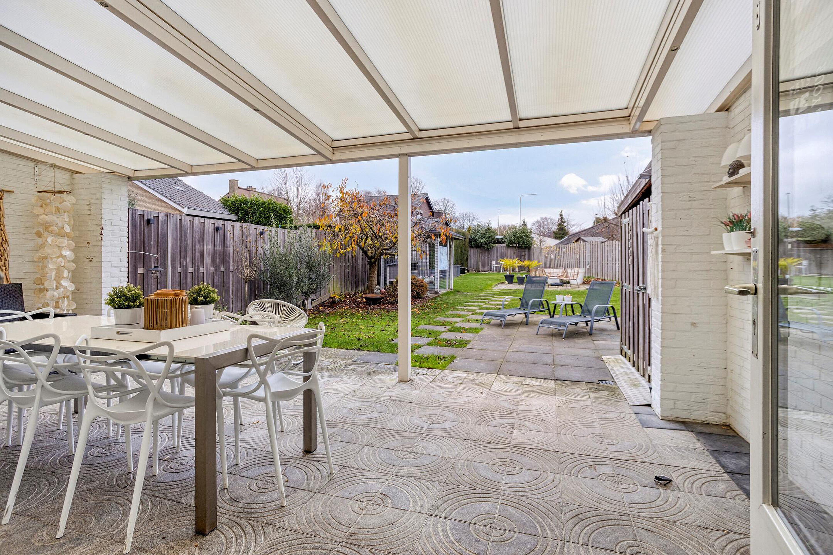 Ruime en zonnige achtertuin gesitueerd op het noordoosten. De tuin beschikt over meerdere gezellige zitplekjes waar met heerlijk van de zon kan genieten. Aan de achterzijde is er een grote overkapping geplaatst waar men heerlijk van een hapje en een drankje kan genieten. De tuin beschikt over een gazon, volwassen beplanting en is netjes met een houten schutting omheind.