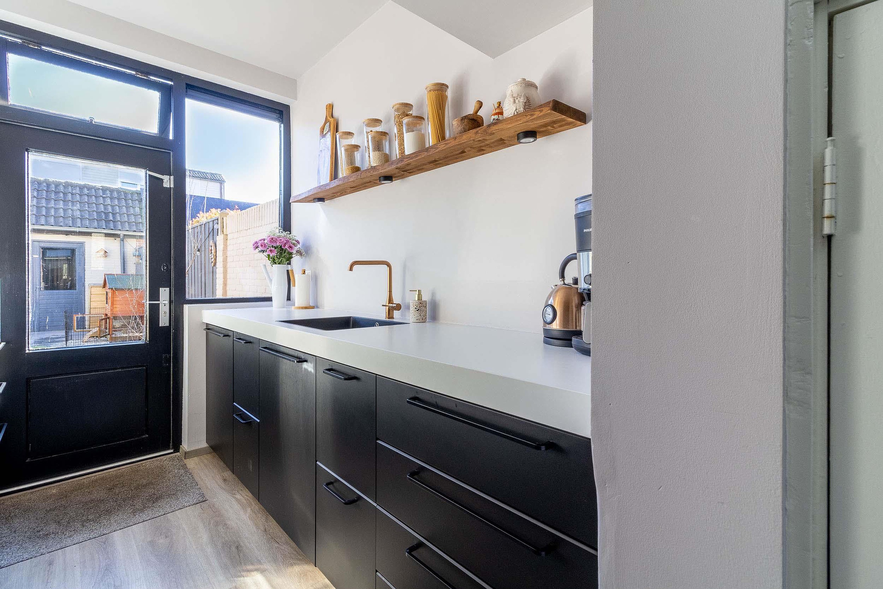 Aan de achterzijde bevindt zich de keuken, opgesteld in een praktische rechte opstelling en voorzien van diverse inbouwapparatuur. Vanuit de keuken is er directe toegang tot de achtertuin.
