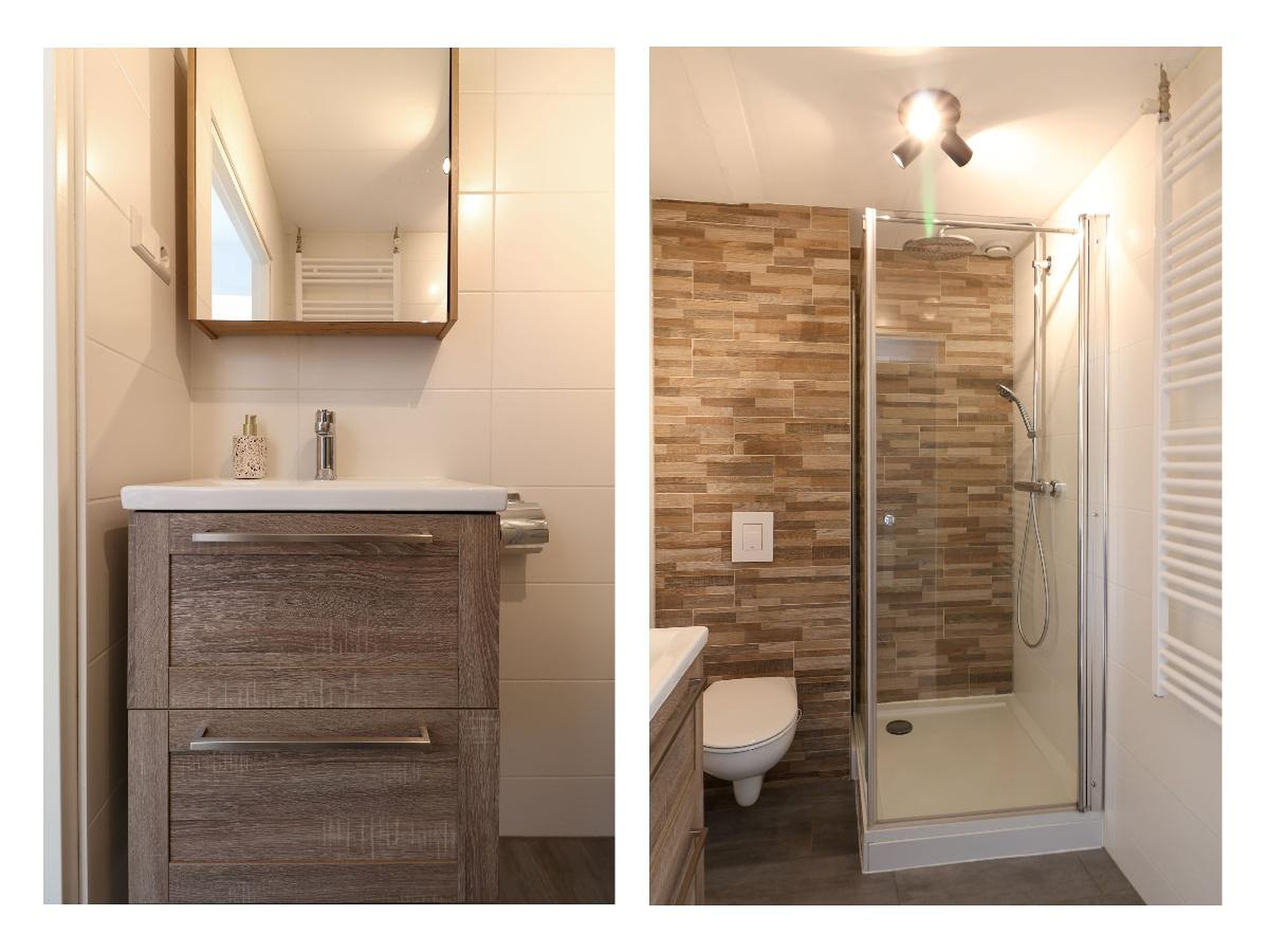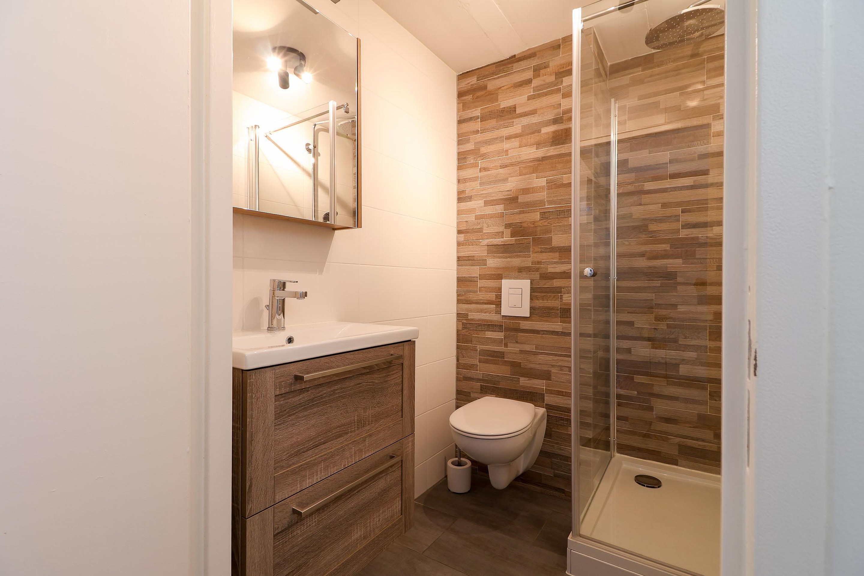 De badkamer is centraal gelegen en voorzien van een douche, toilet en wastafel.