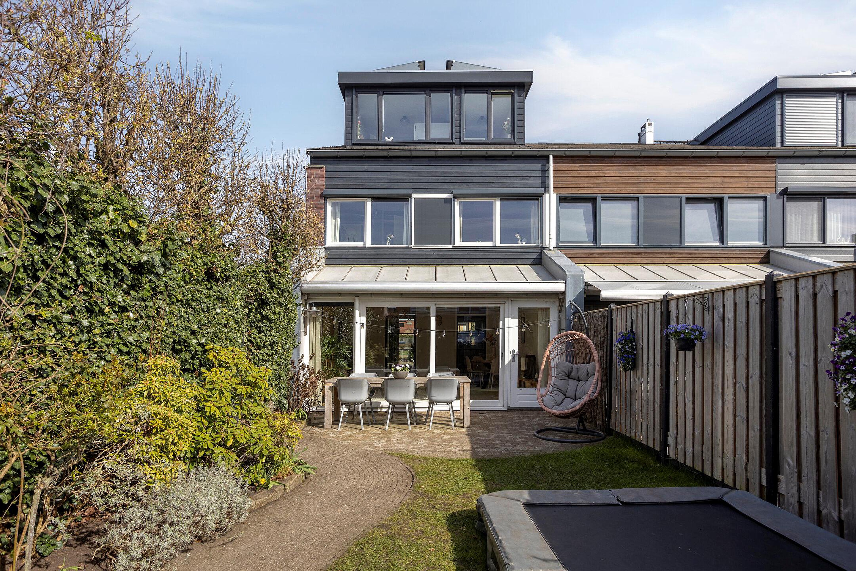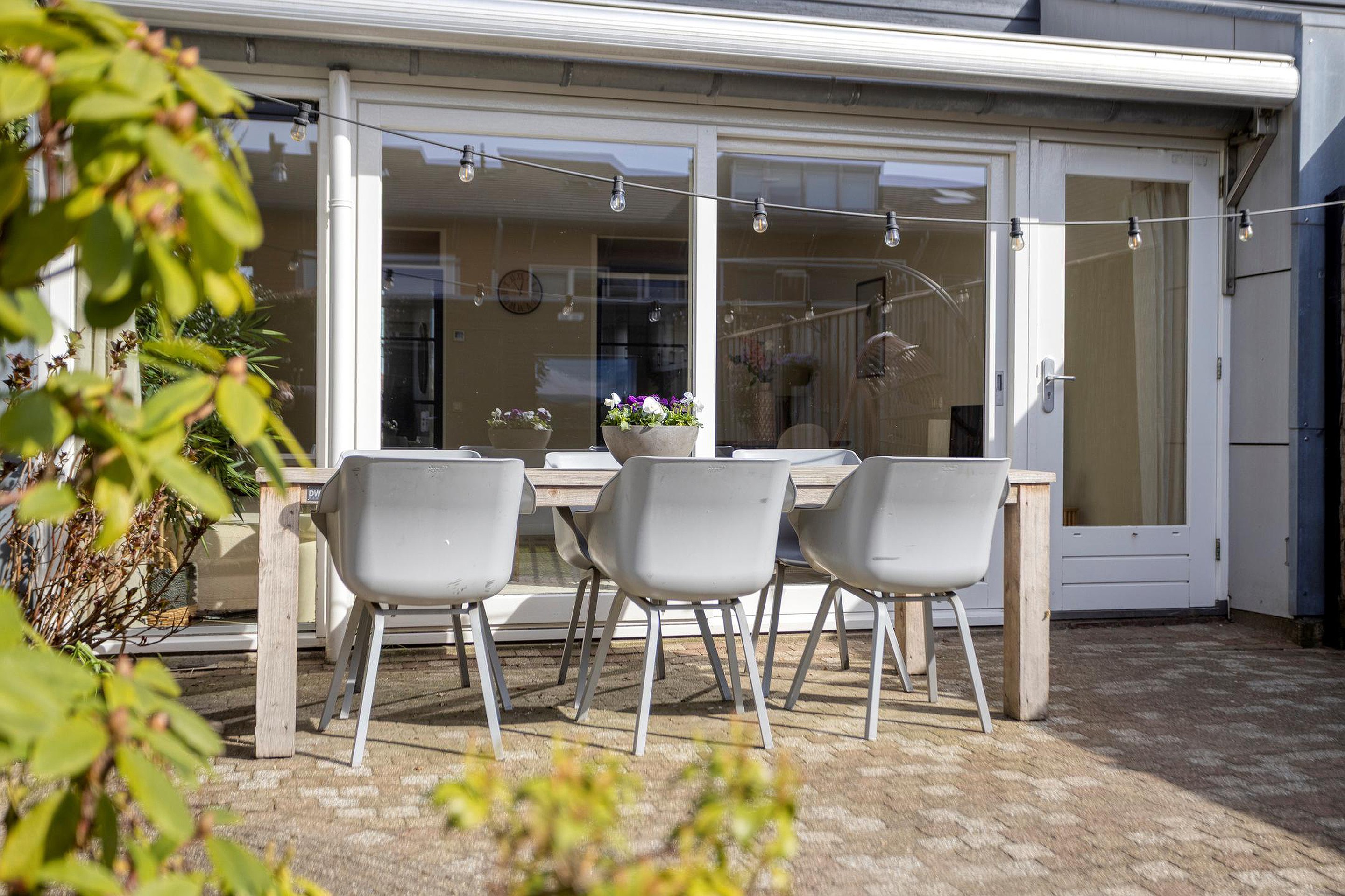 Via de schuifpui bereik je de diepe, zonnige achtertuin van ca. 14 meter — een ideale plek voor zonliefhebbers en het creëren van een gezellige buitenruimte. De tuin is tevens bereikbaar via een poortdeur aan de zijkant (extra handig met bijv. een bakfiets) en beschikt over een nieuwe overkapping, perfect voor fietsen en extra bergruimte