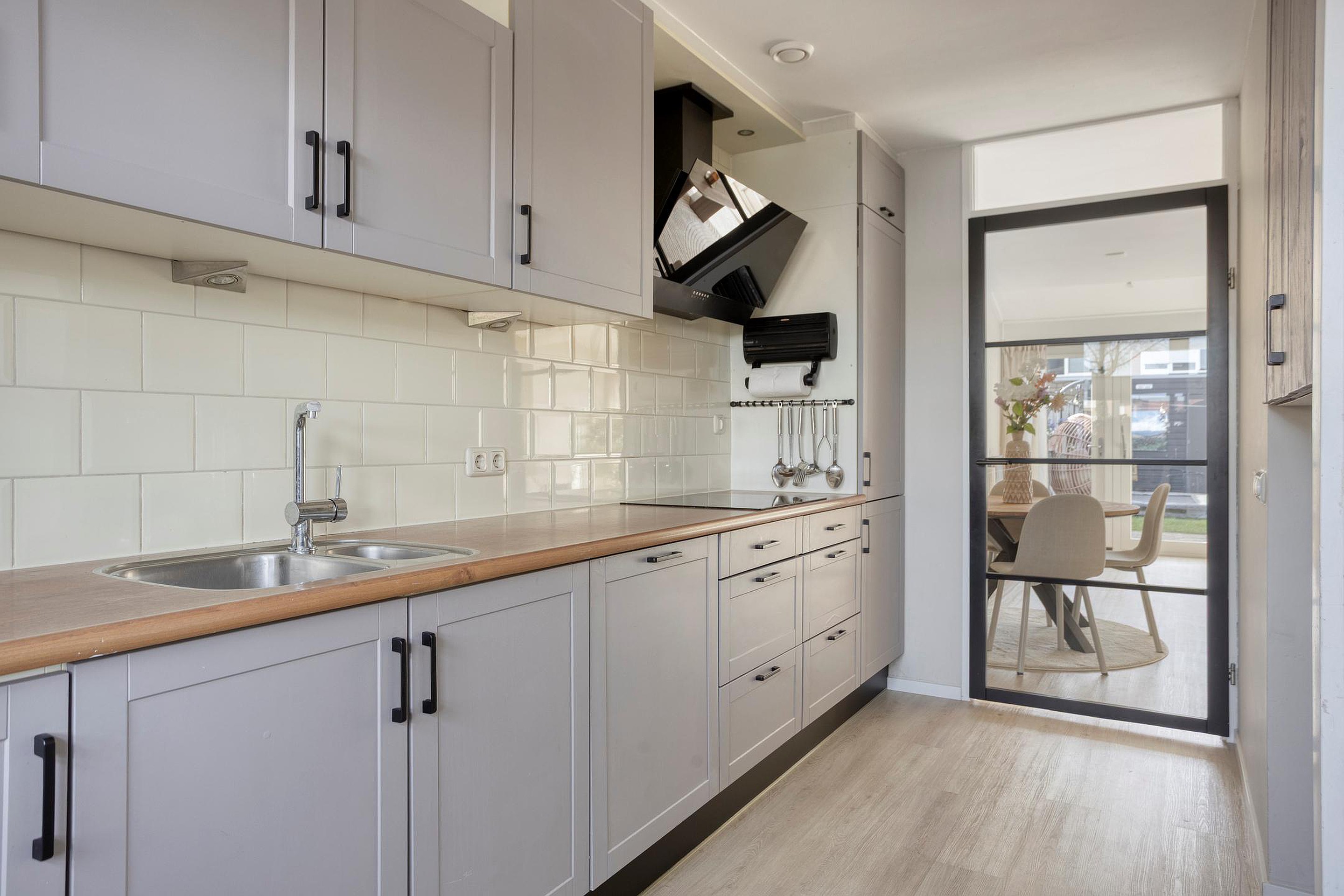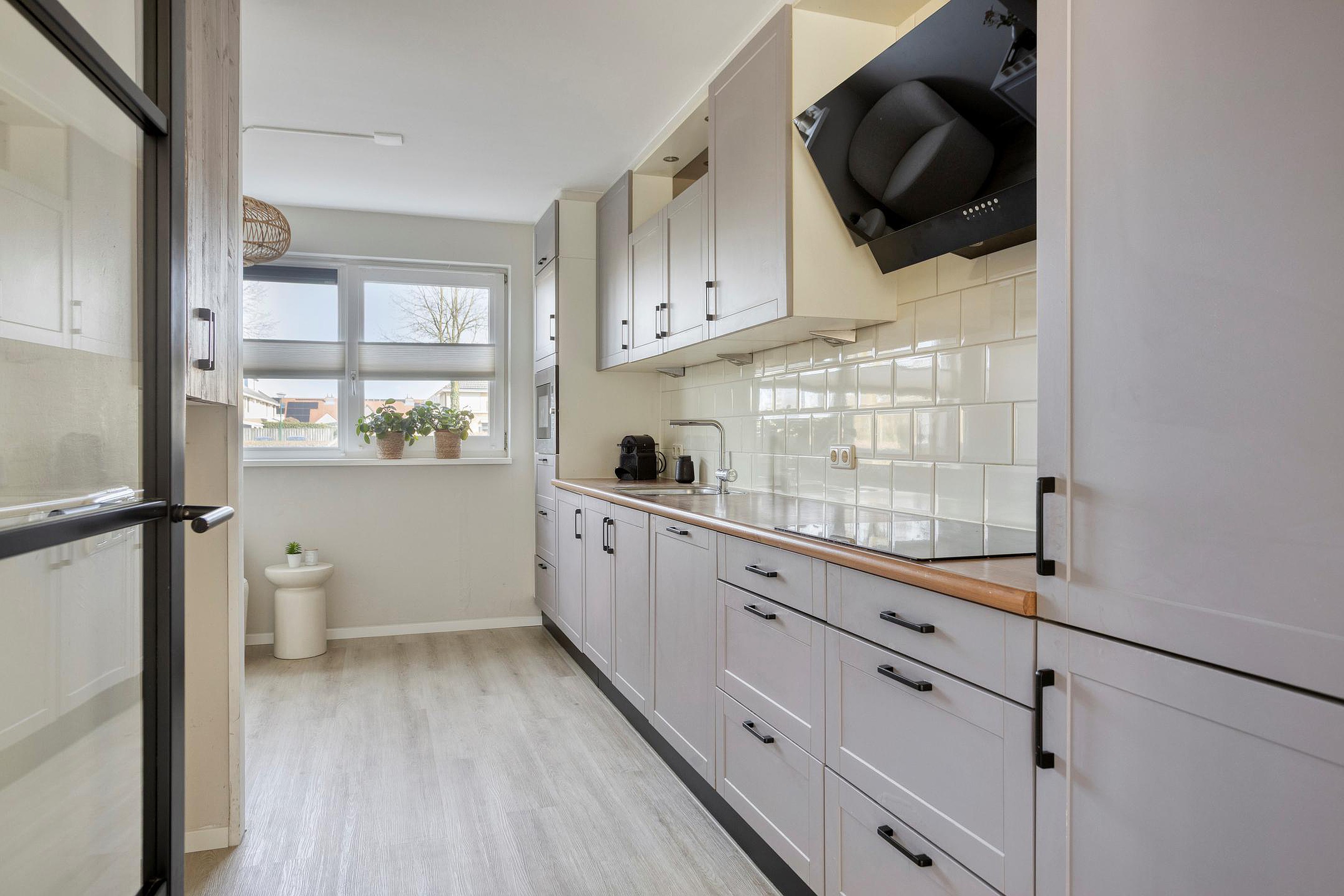 De nette keuken sluit naadloos aan bij de moderne woning en beschikt over veel bergruimte en recente apparatuur.