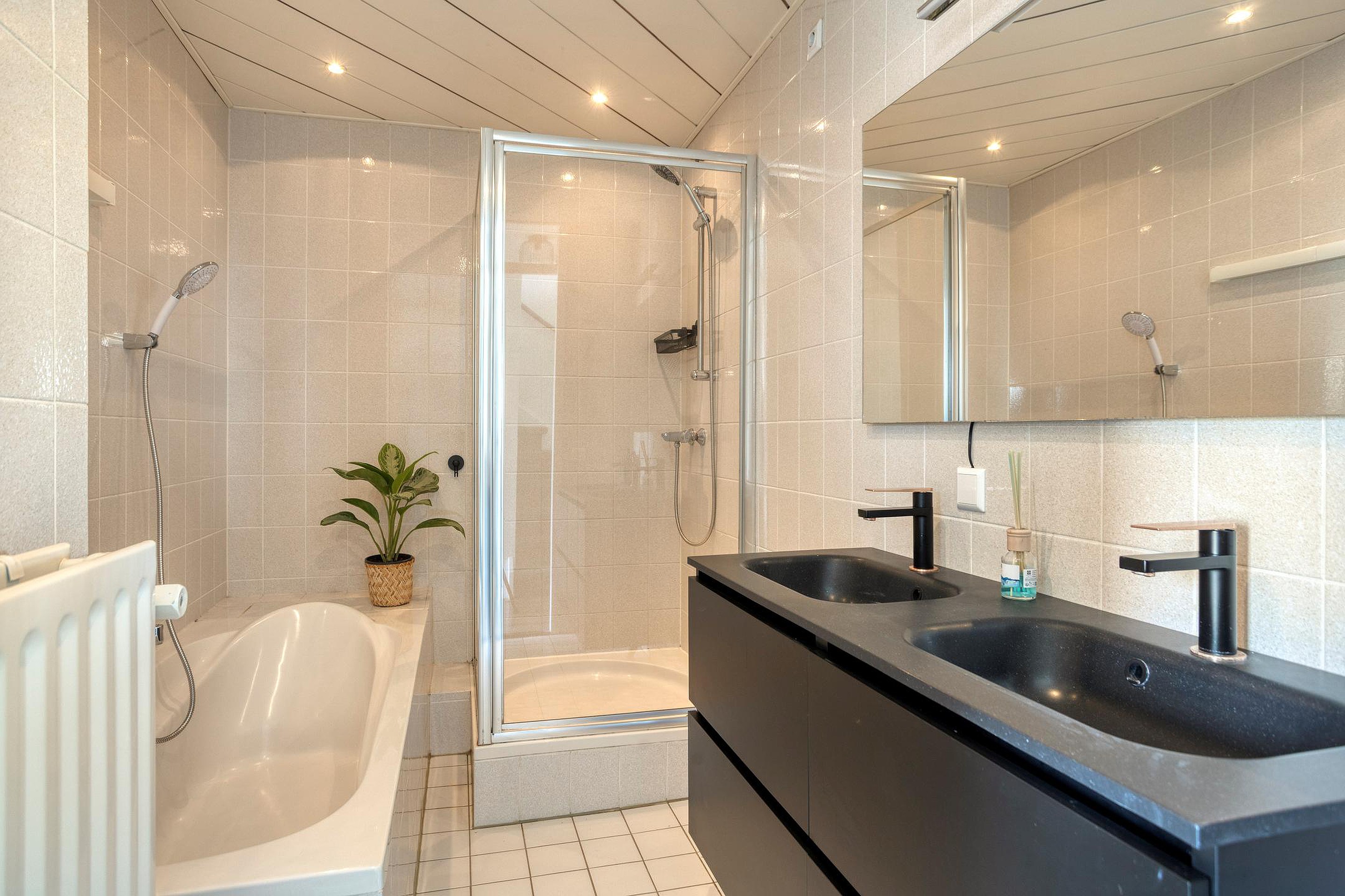 De ruime badkamer beschikt over een ligbad en een douche en is uitgerust met een prachtig luxe badmeubel met dubbele wastafel v.v. soft-close schuifladen.