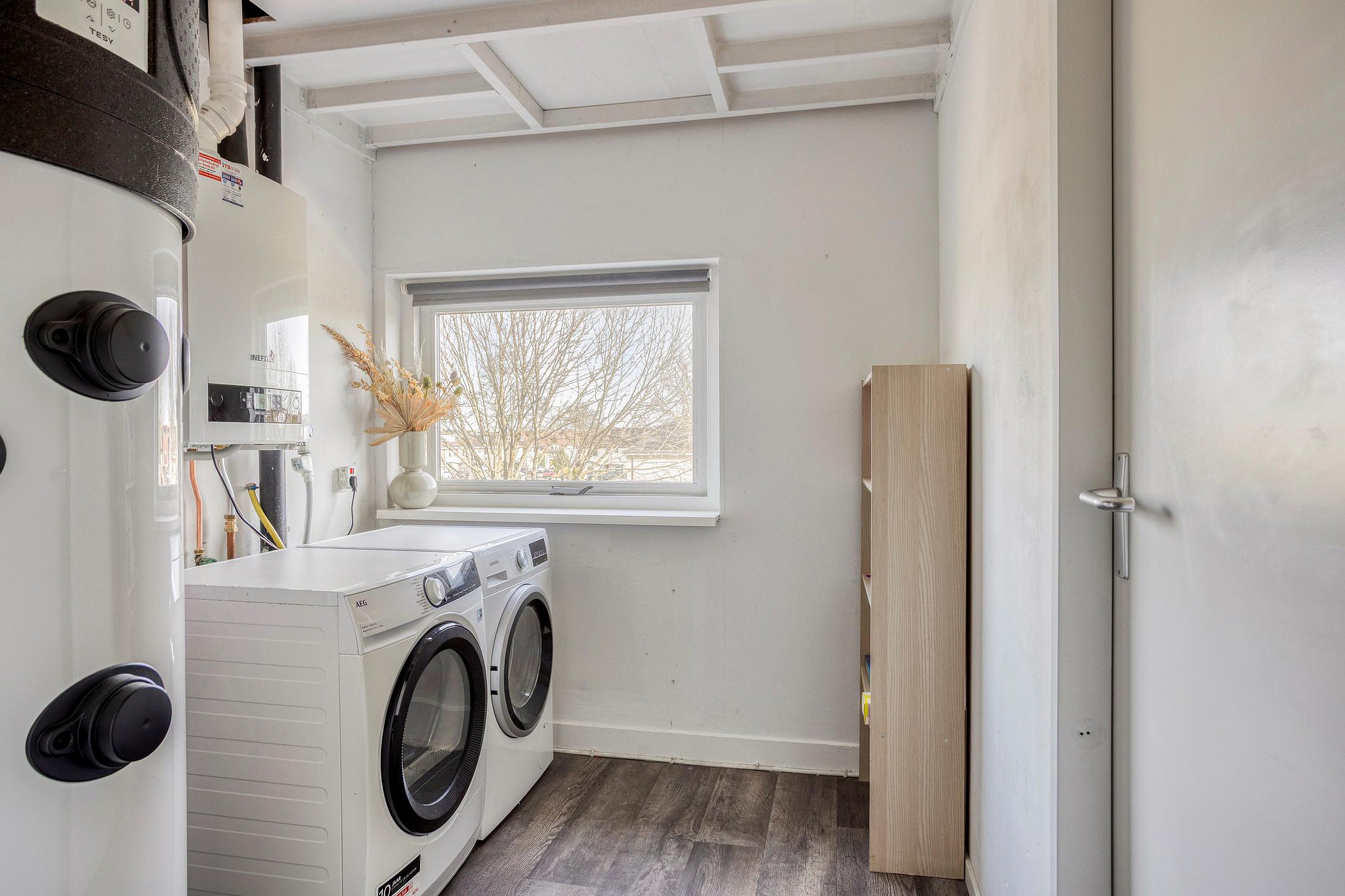 Voorzolder met airconditioning ( LG 5 kw), warmtepompboiler tot 450 liter op 40 graden, Nefit Trendline CV ketel, wasmachine-en drogeropstelling met toegang tot bergzolder en toegang tot drie slaapkamers die zijn vergroot door toepassing van een dakkapel. Deze zijn voorzien van elektrisch bedienbare rolluiken. Via 1 van de kamers kom je met een vlizotrap op een tweede bergzolder.
