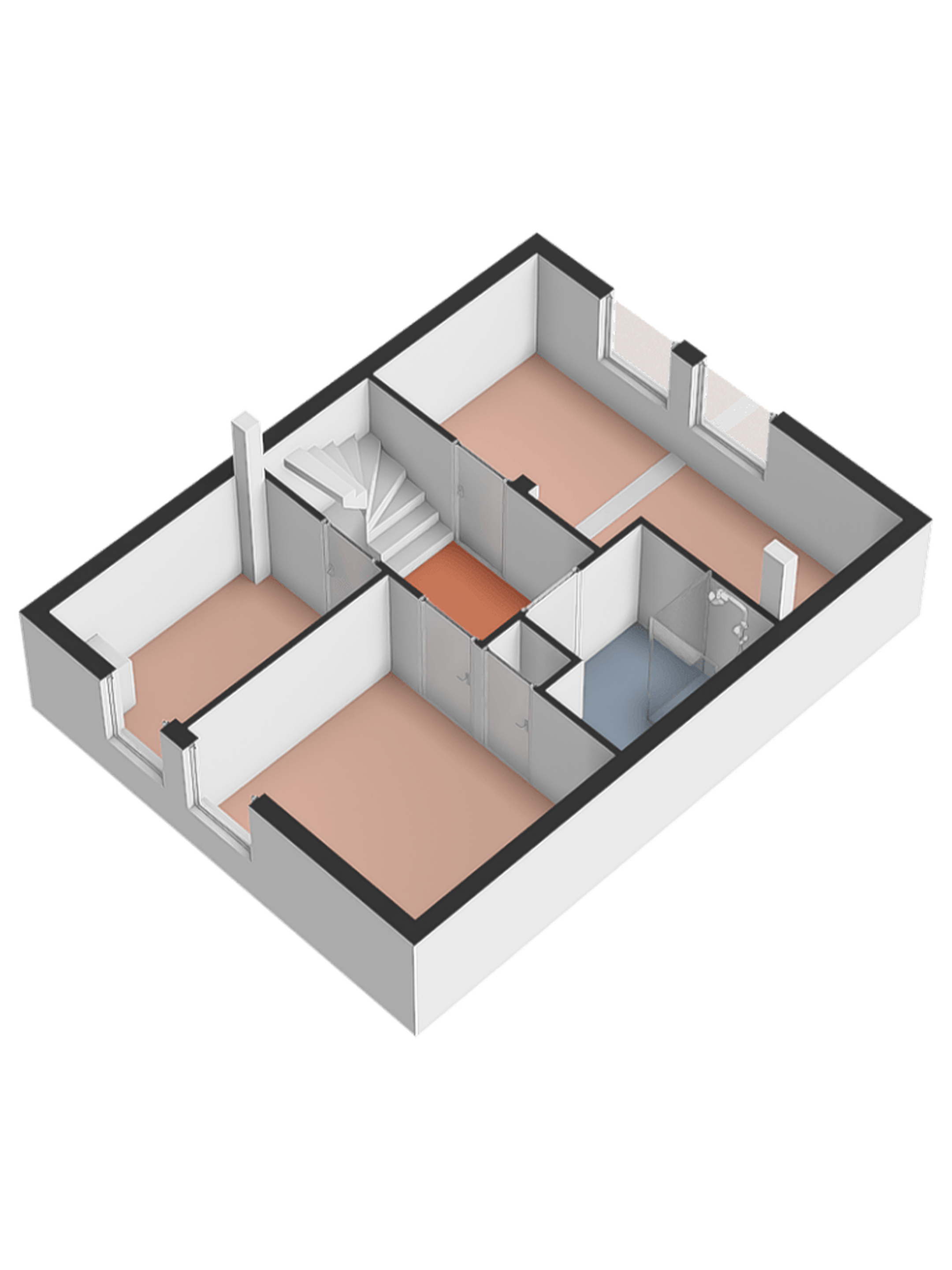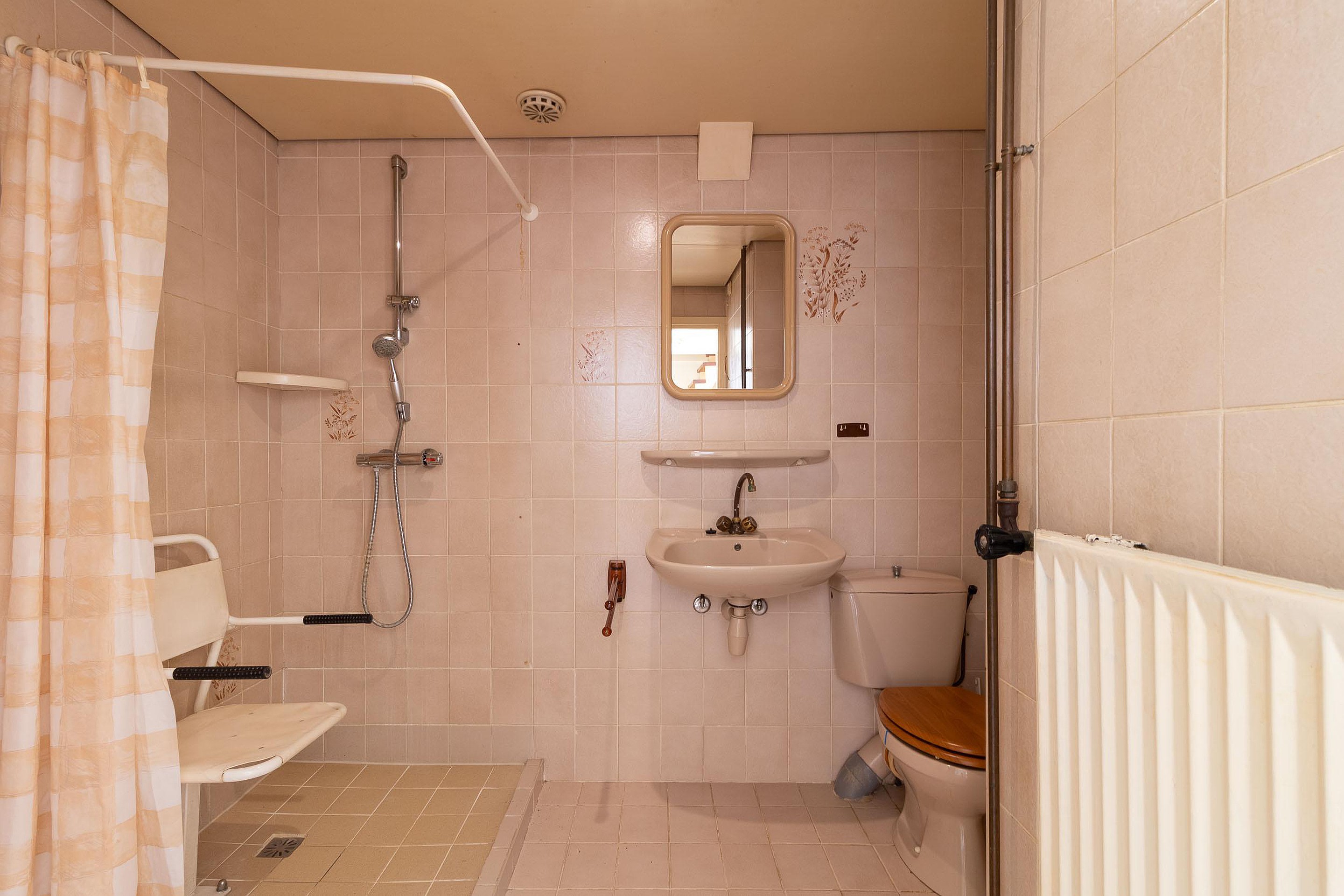 De badkamer bevindt zich centraal op de verdieping en is uitgerust met een douche, toilet en wastafel.