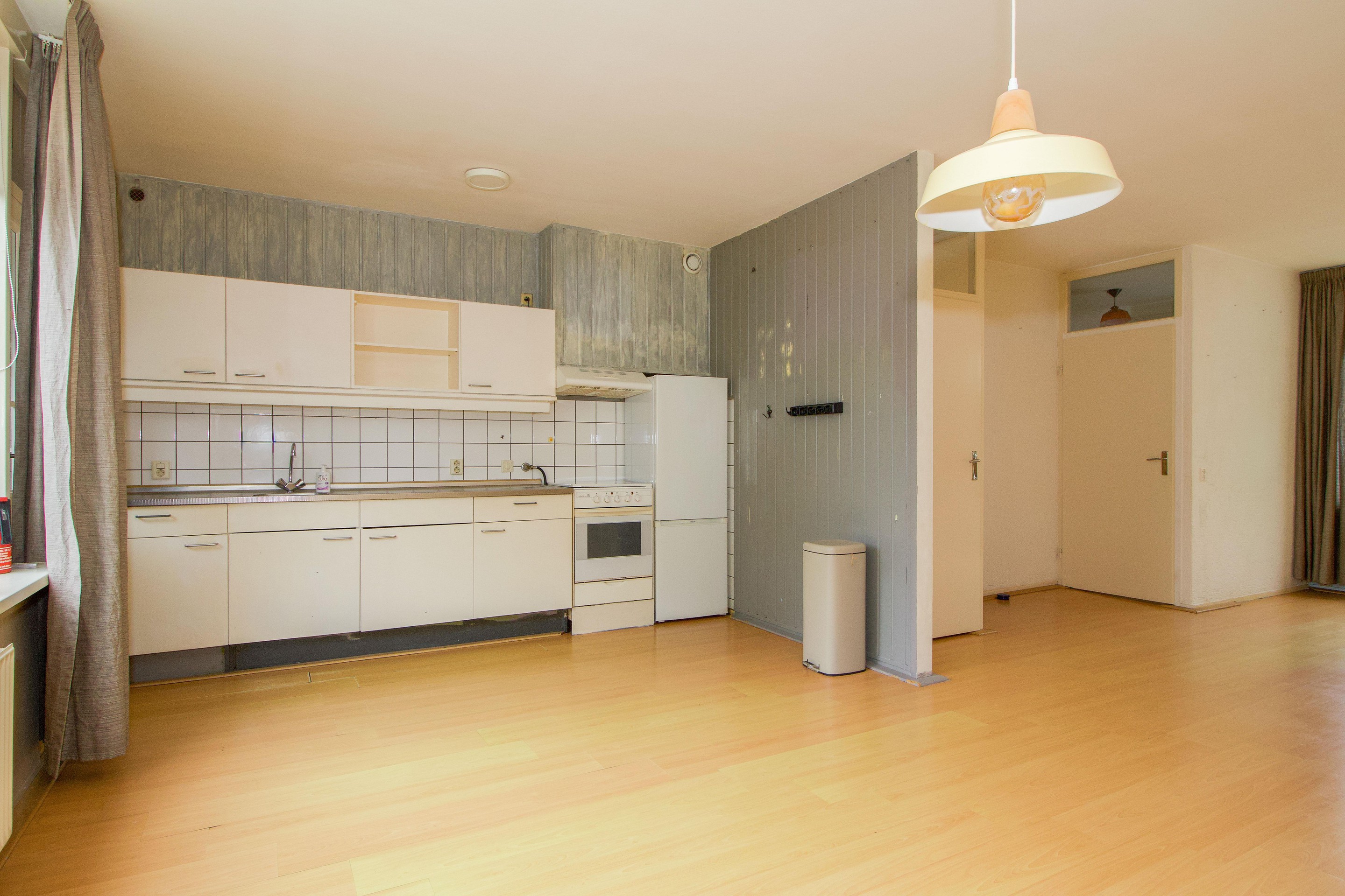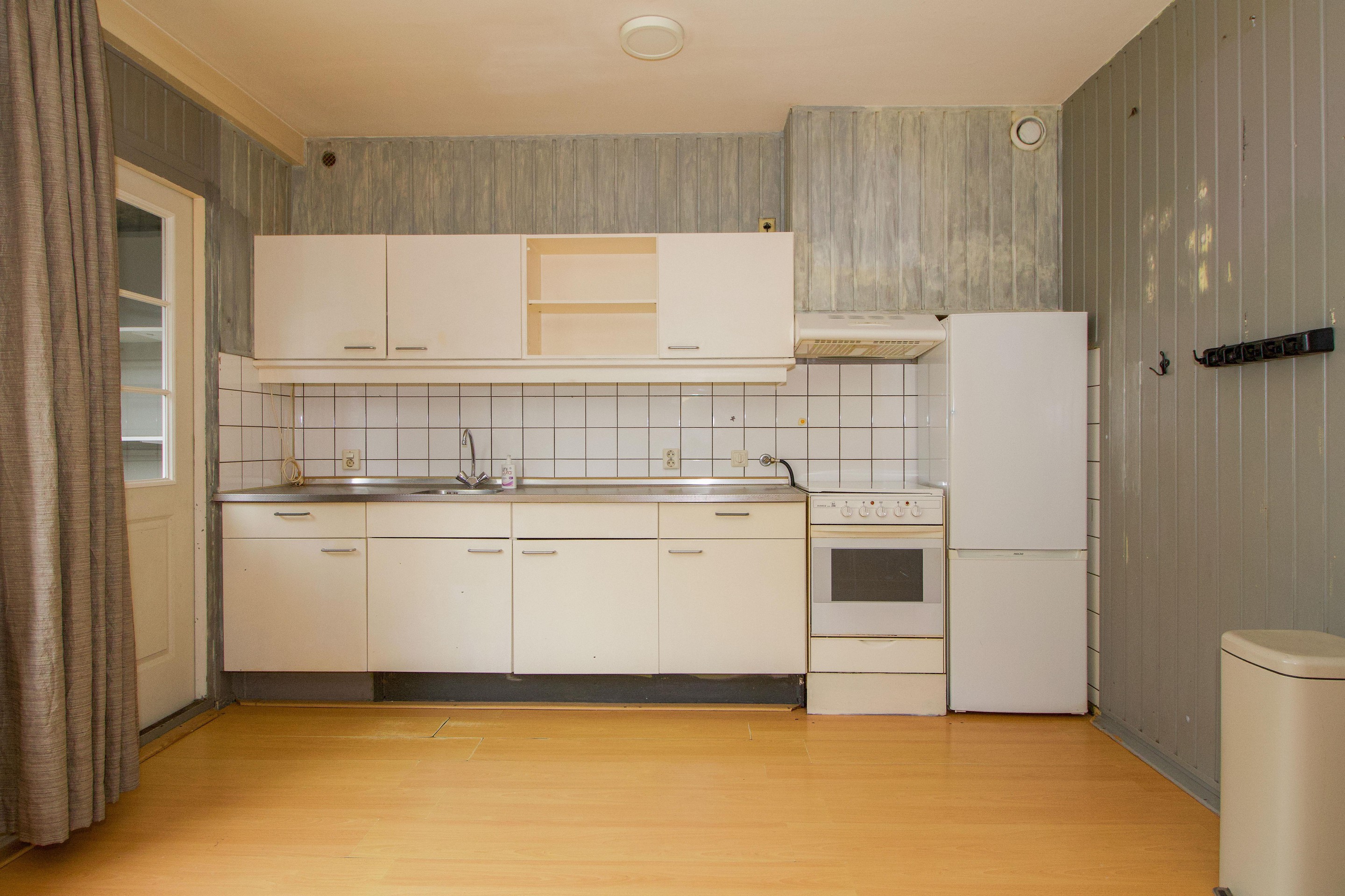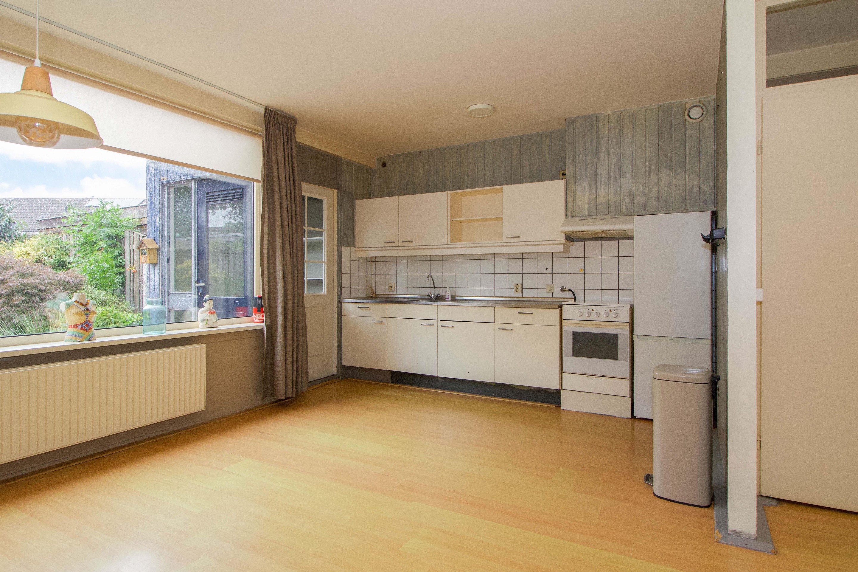 De woonkamer staat in open verbinding met de keuken, welke aan de achterzijde van de woning is gelegen. De keuken is praktisch ingericht en biedt voldoende ruimte voor een royale opstelling. Vanuit de keuken bereikt u via een aparte hal de achterdeur naar de tuin.