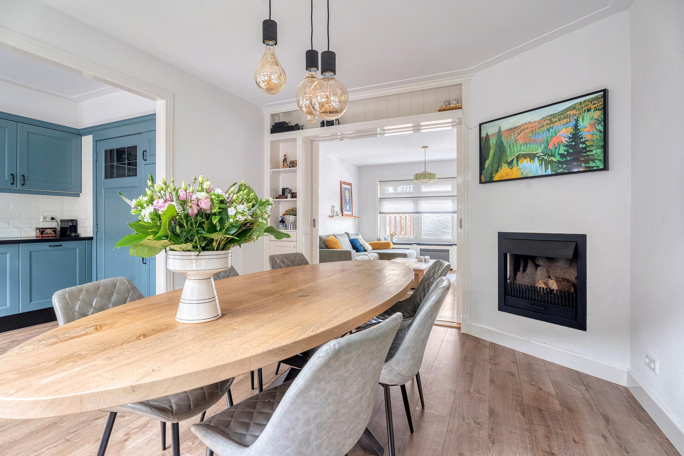Aansluitend aan de woonkamer bevindt zich de eetkamer met openhaard, die naadloos overloopt in de open keuken. Deze open indeling zorgt voor een gezellige verbinding tussen koken, eten en ontspannen. De keuken is gesitueerd aan de achterzijde en heeft een praktische opstelling met voldoende werk- en bergruimte. Vanuit de keuken is er toegang tot de berging, ideaal voor het opbergen van proviand, schoonmaakspullen of een extra koelkast/vriezer.