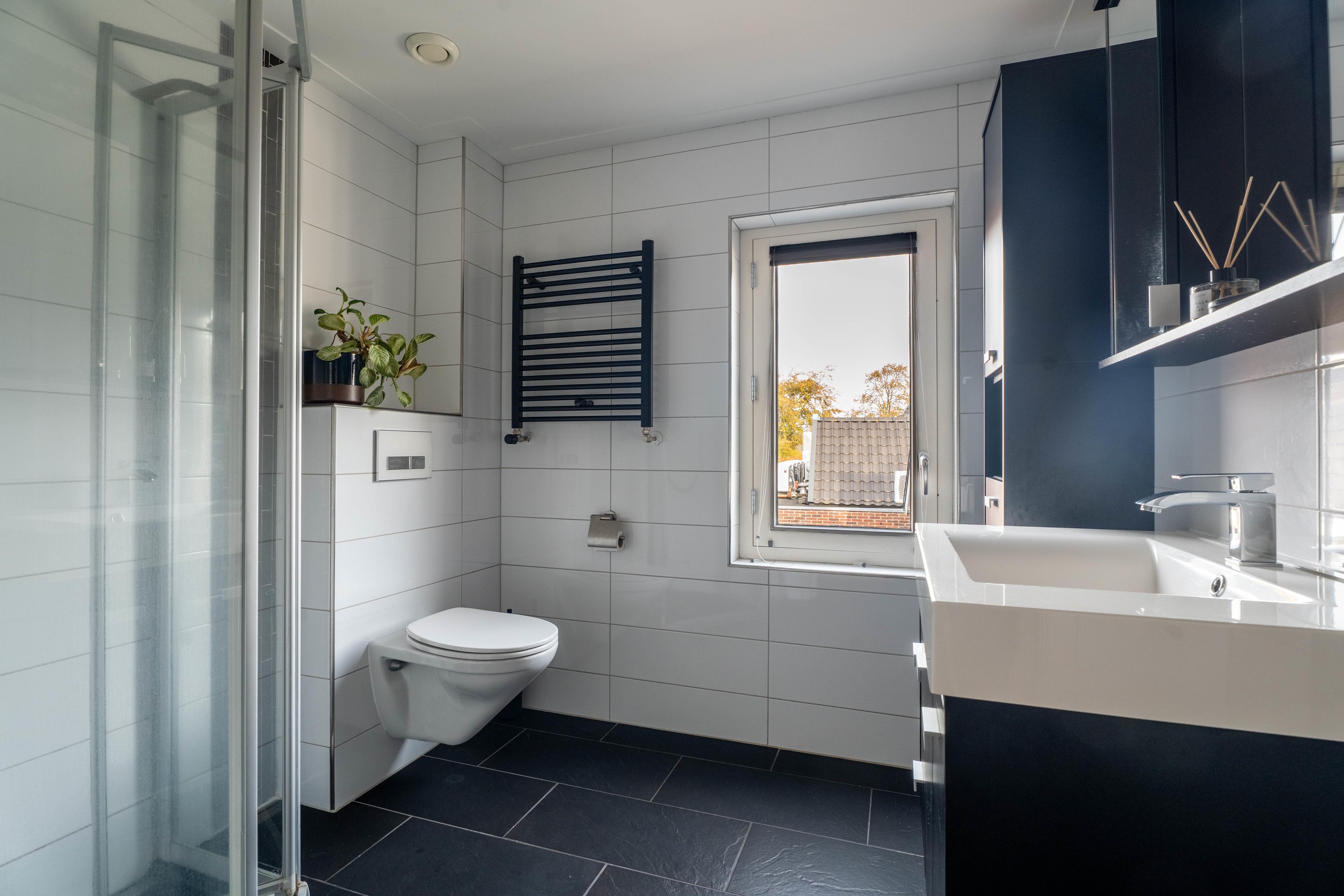 De badkamer is modern van opzet en voorzien van een douche, wastafel en tweede toilet. Dankzij het raam is er daglicht en natuurlijke ventilatie aanwezig.