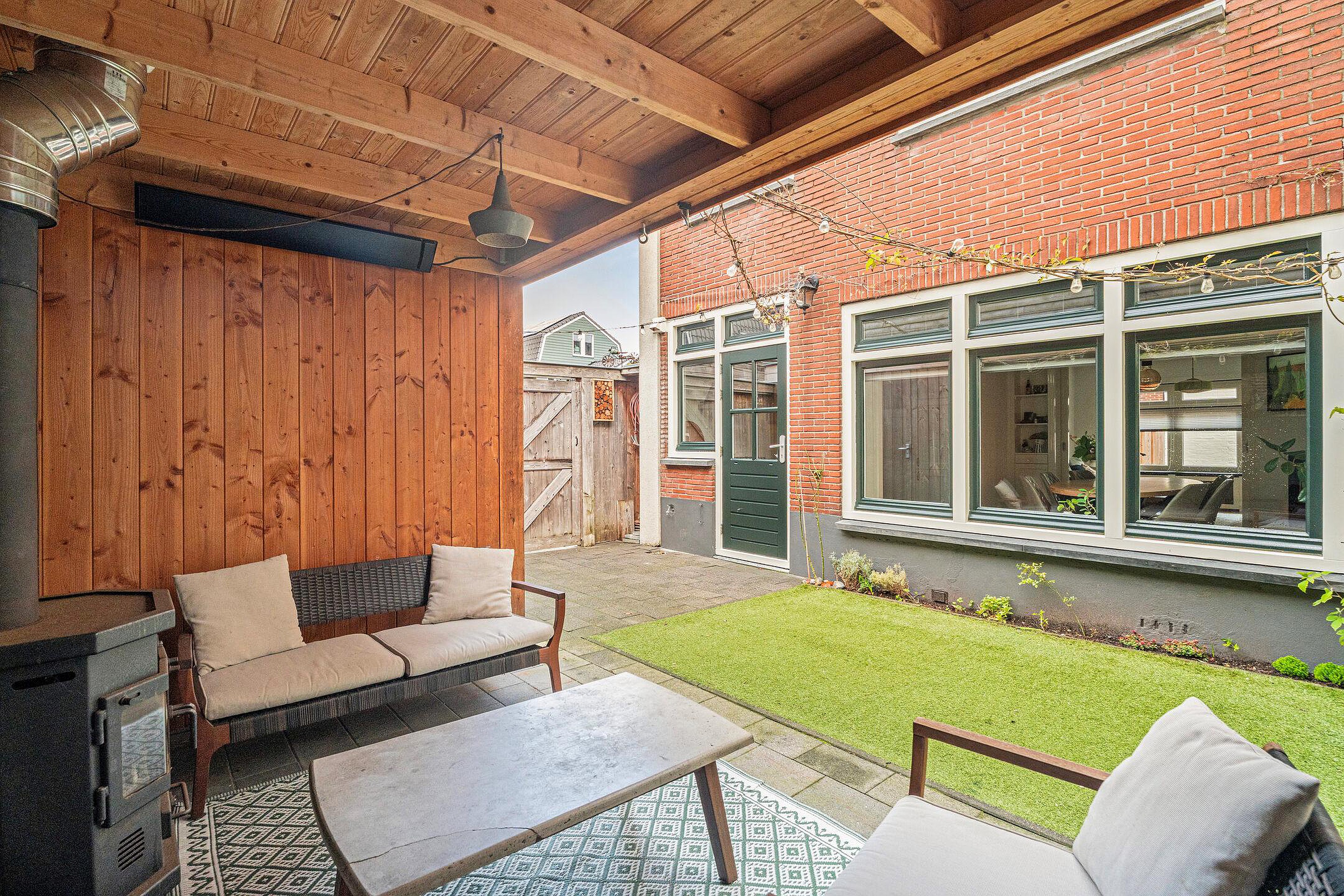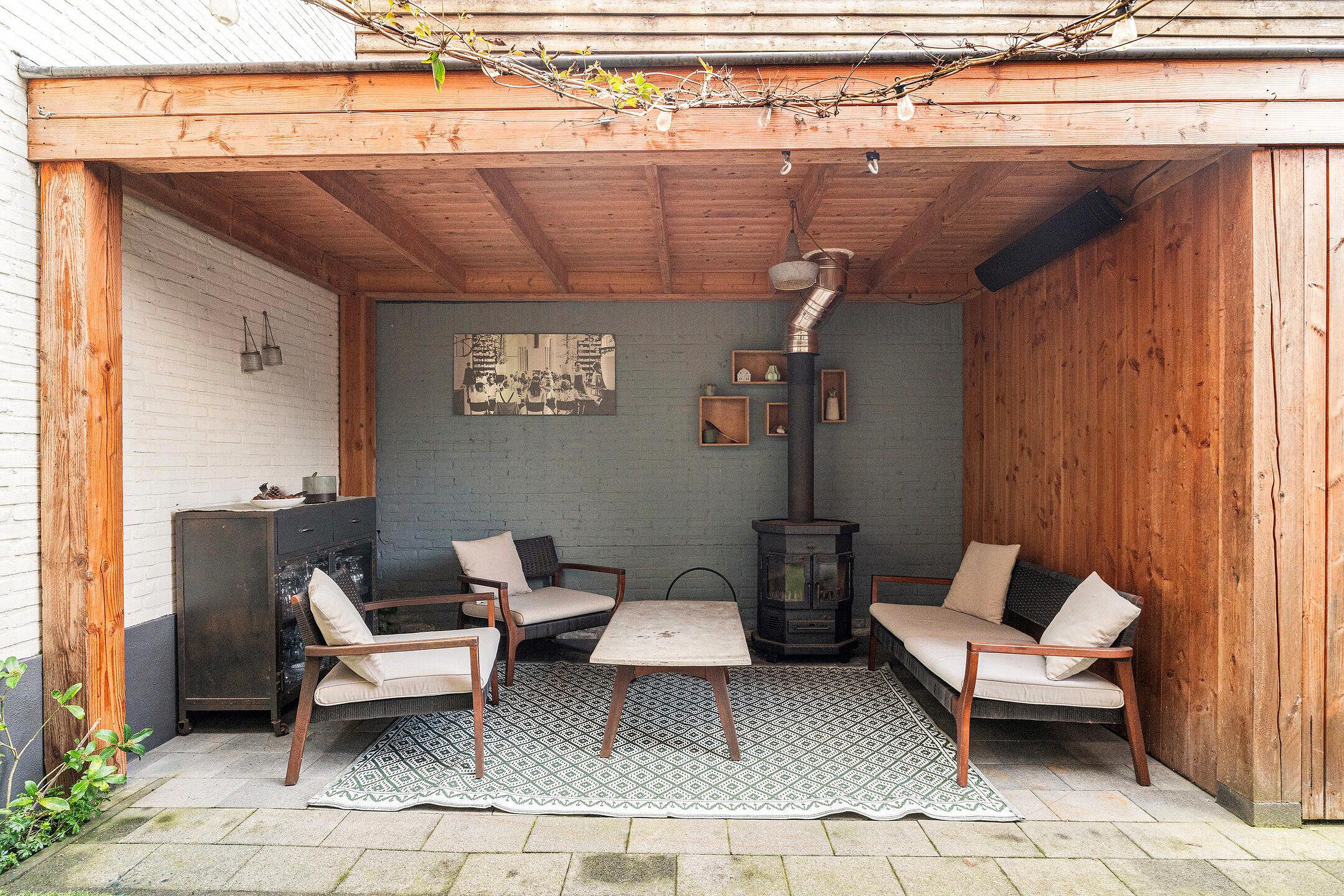 Een echte eyecatcher is de ruime overkapping met houten balken en een gezellige houtkachel — dé ideale plek om ook in het voor- en najaar heerlijk buiten te zitten. Hier kun je ontspannen met een goed boek of gezellig tafelen met vrienden en familie.
