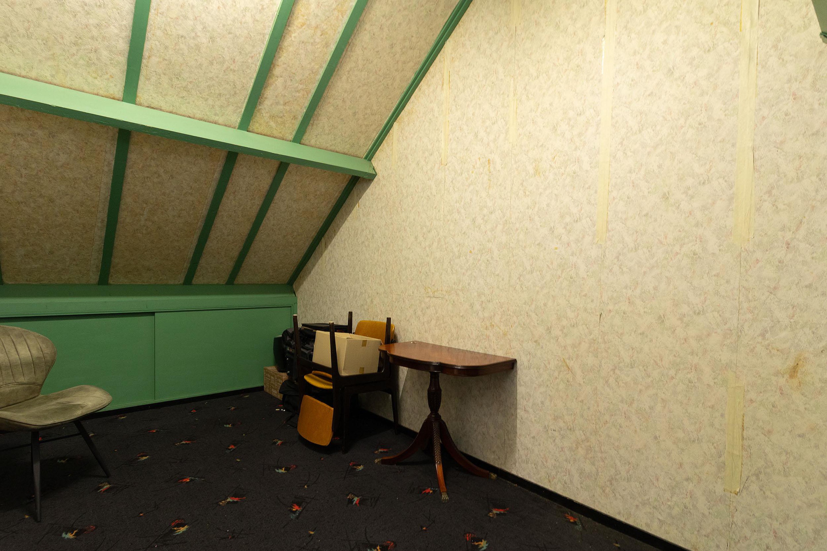 De zolder is door middel van een tussenwand met schuifdeur ingedeeld in twee aparte ruimtes. Hierdoor is de verdieping flexibel te gebruiken, bijvoorbeeld als combinatie van een werk-/hobbyruimte en extra berging, of als extra (slaap)kamer met aparte voorzolder.