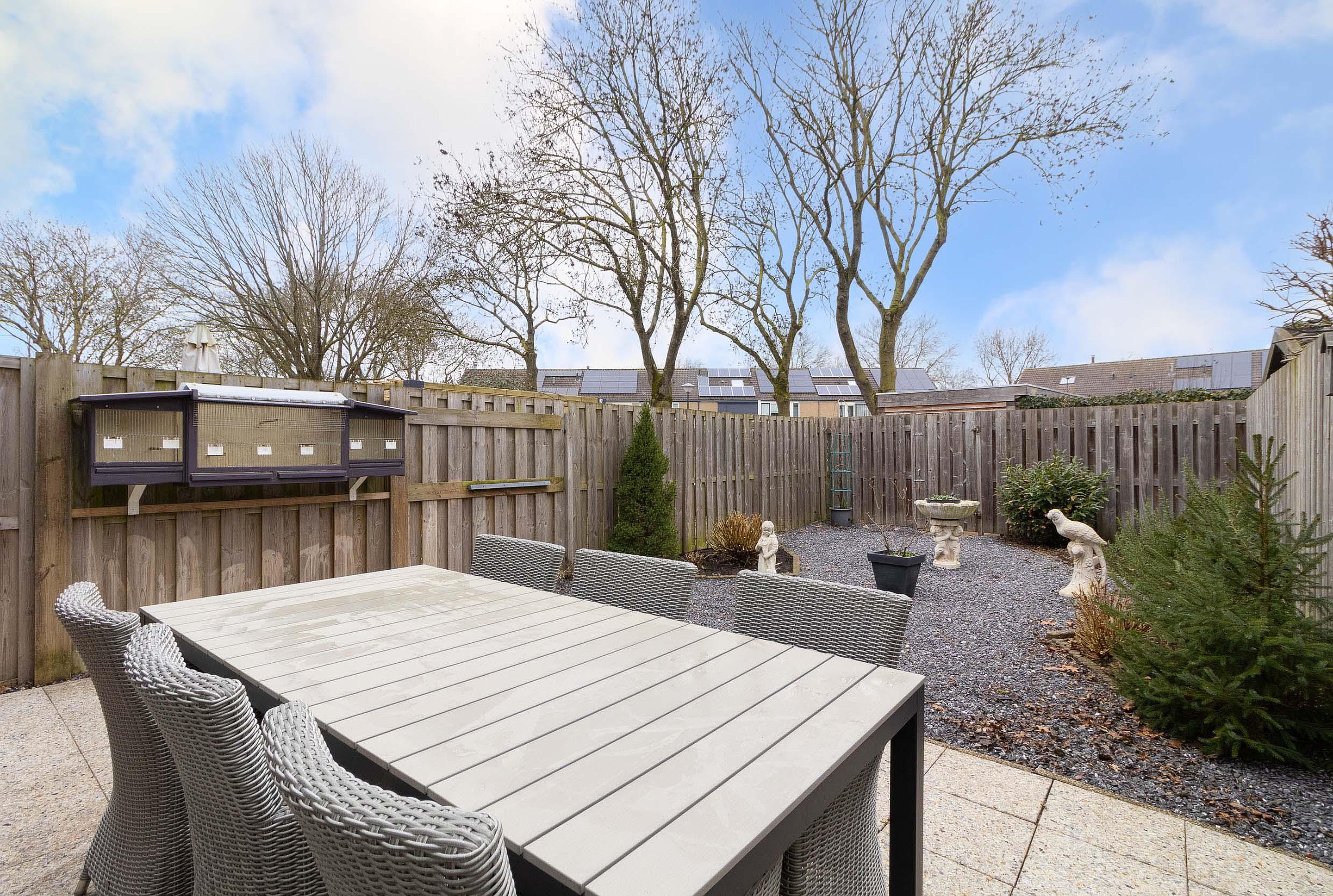 De tuin is onderhoudsvriendelijk aangelegd met een combinatie van bestrating, siergrind en vaste beplanting. Dankzij de praktische indeling is er voldoende ruimte voor meerdere zitplekken of speelgelegenheid.