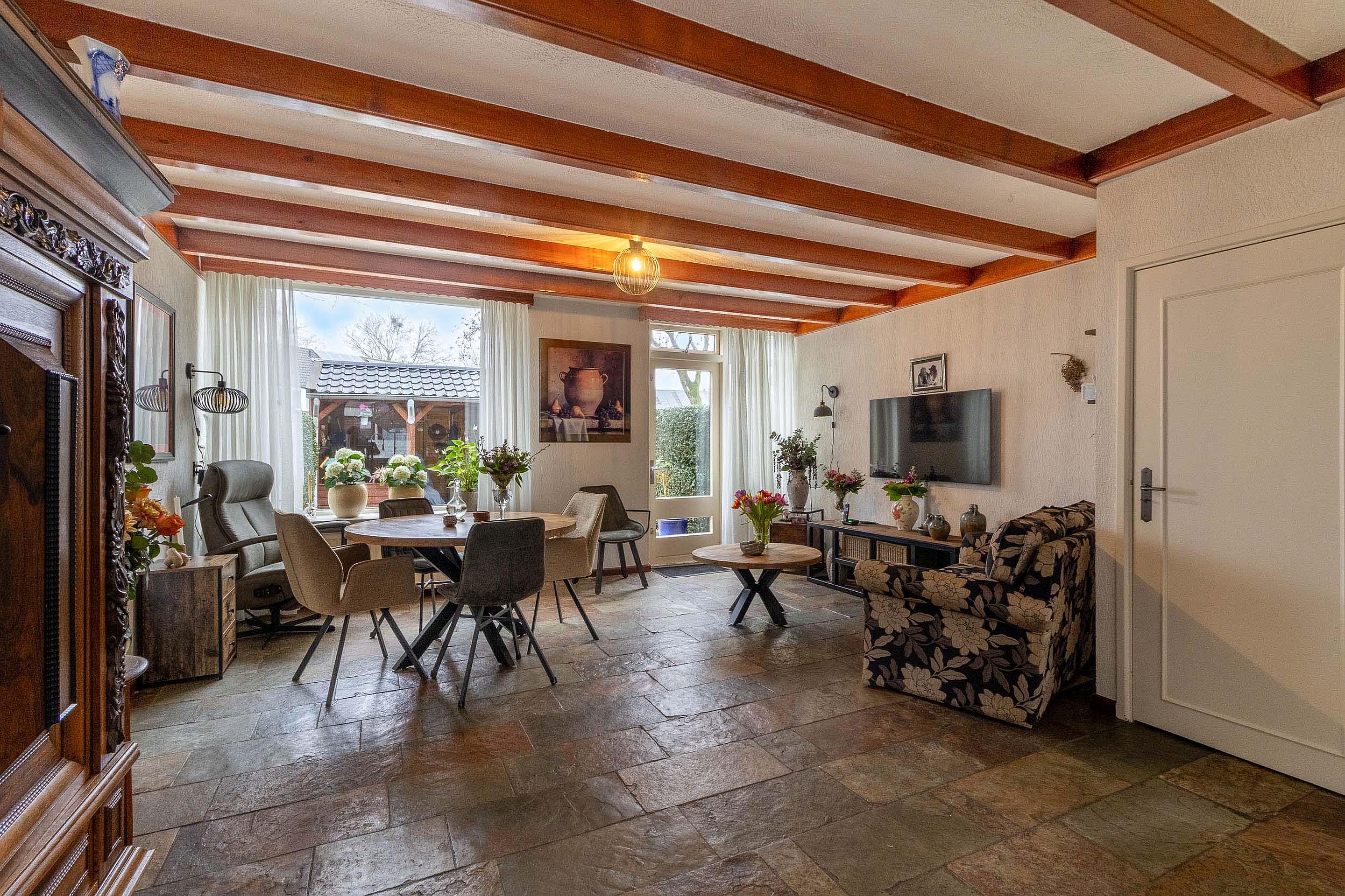 De woonkamer is ruim opgezet en strekt zich uit over vrijwel de gehele diepte van de woning. Dankzij de grote raampartijen aan zowel de voor- als achterzijde geniet de ruimte van veel natuurlijke lichtinval. De indeling biedt volop mogelijkheden voor het creëren van een comfortabele zit- en eethoek.