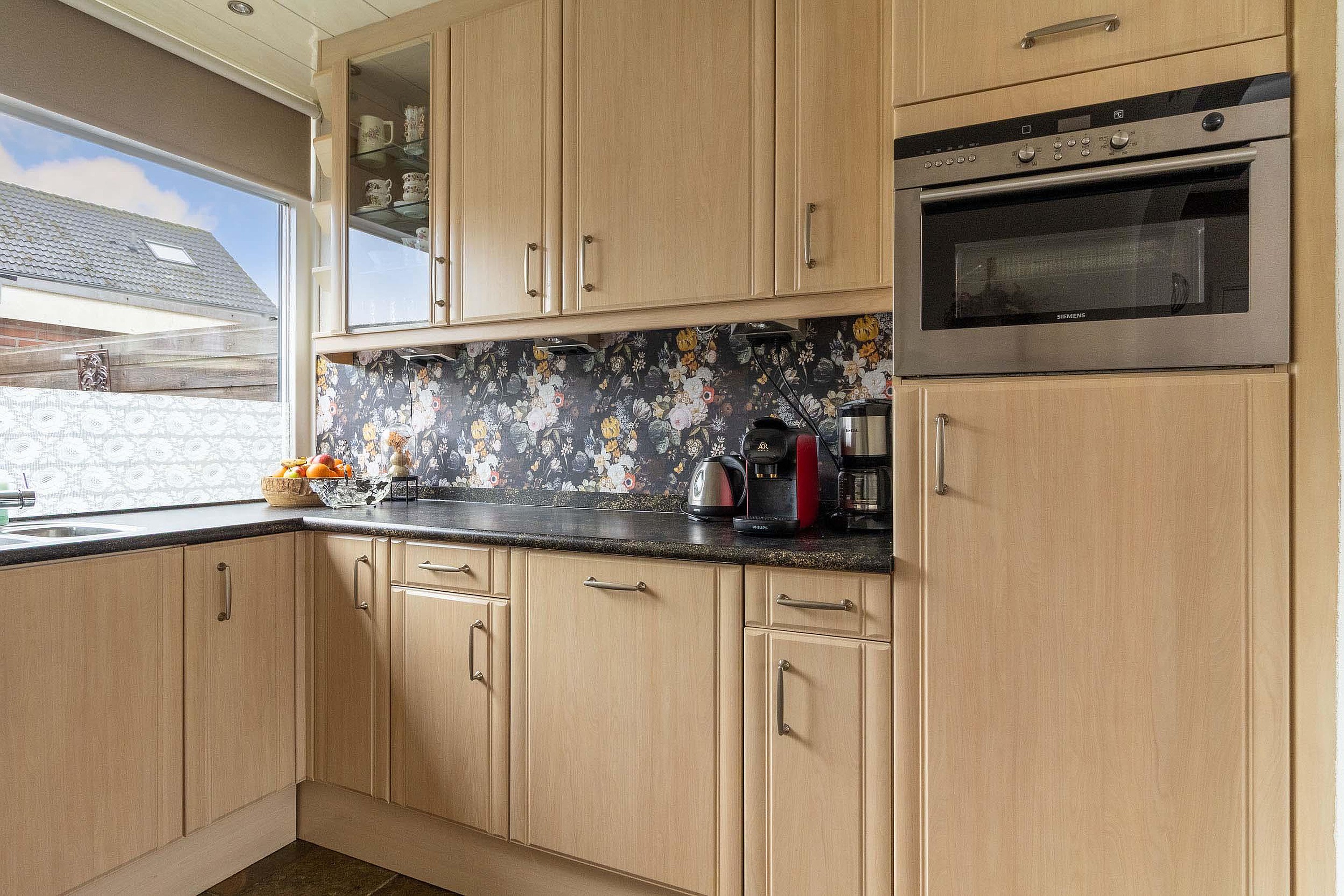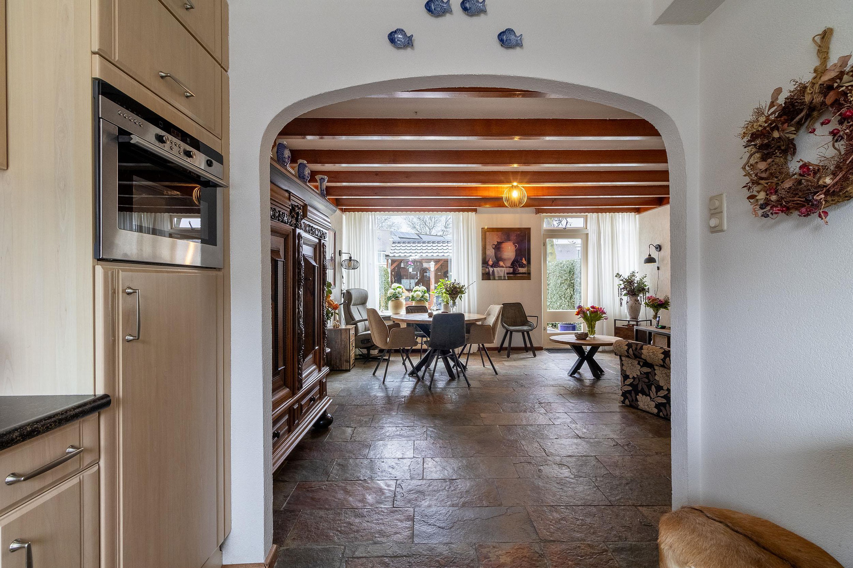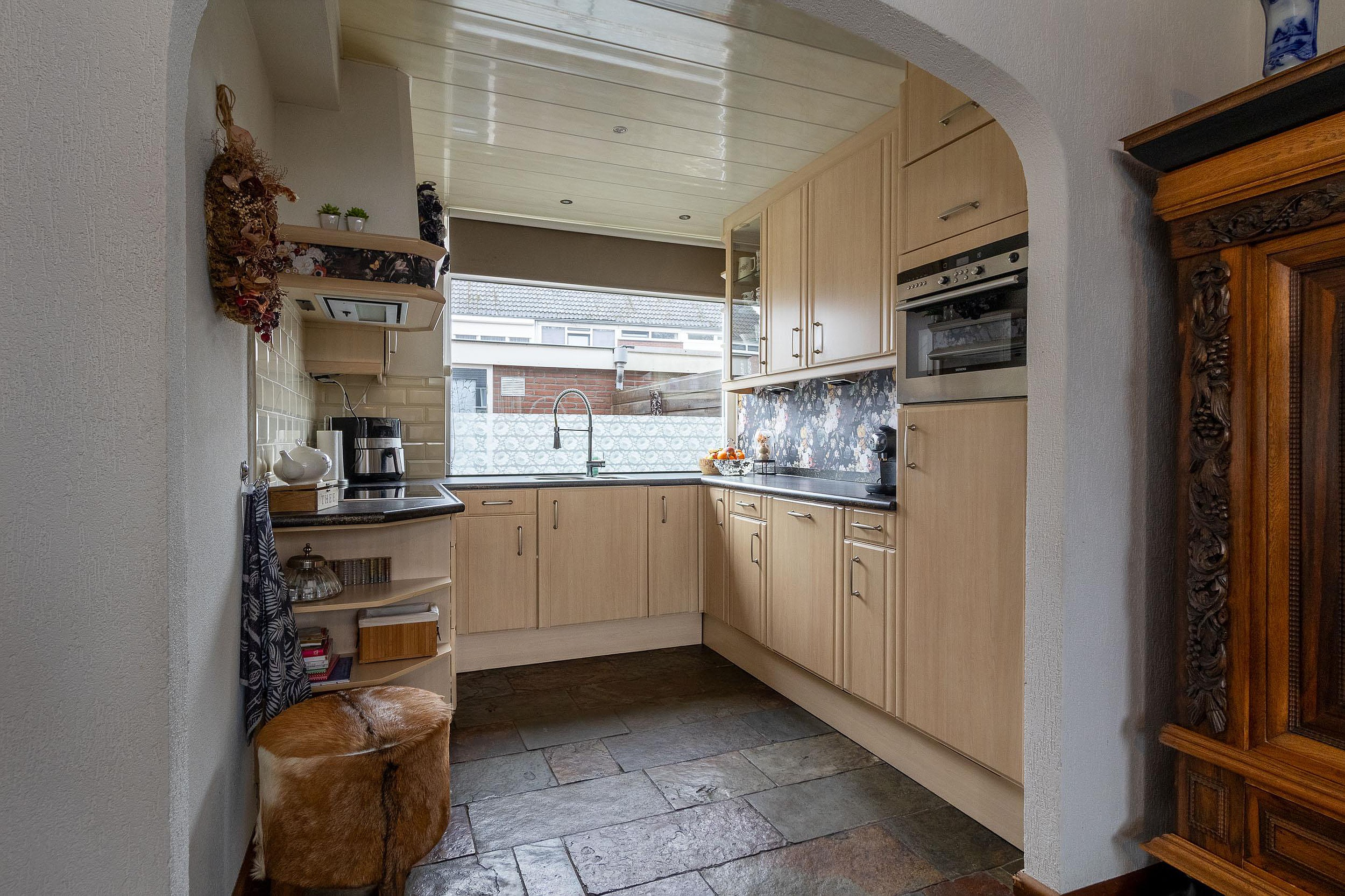 Aan de voorzijde bevindt zich de open keuken, geplaatst in een praktische opstelling met voldoende werk- en bergruimte. Vanuit de woonkamer is tevens de achterdeur bereikbaar, met directe toegang tot de tuin.