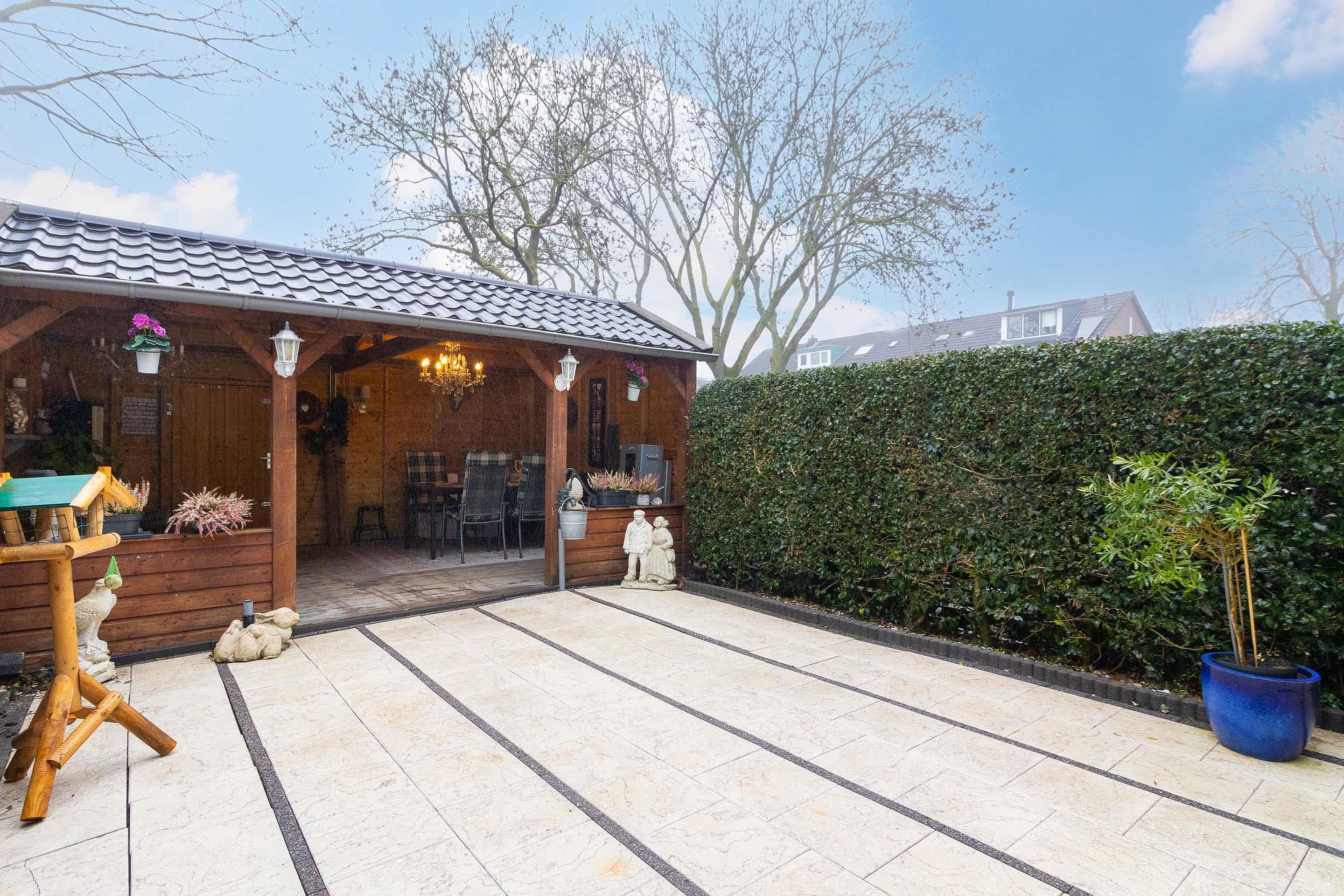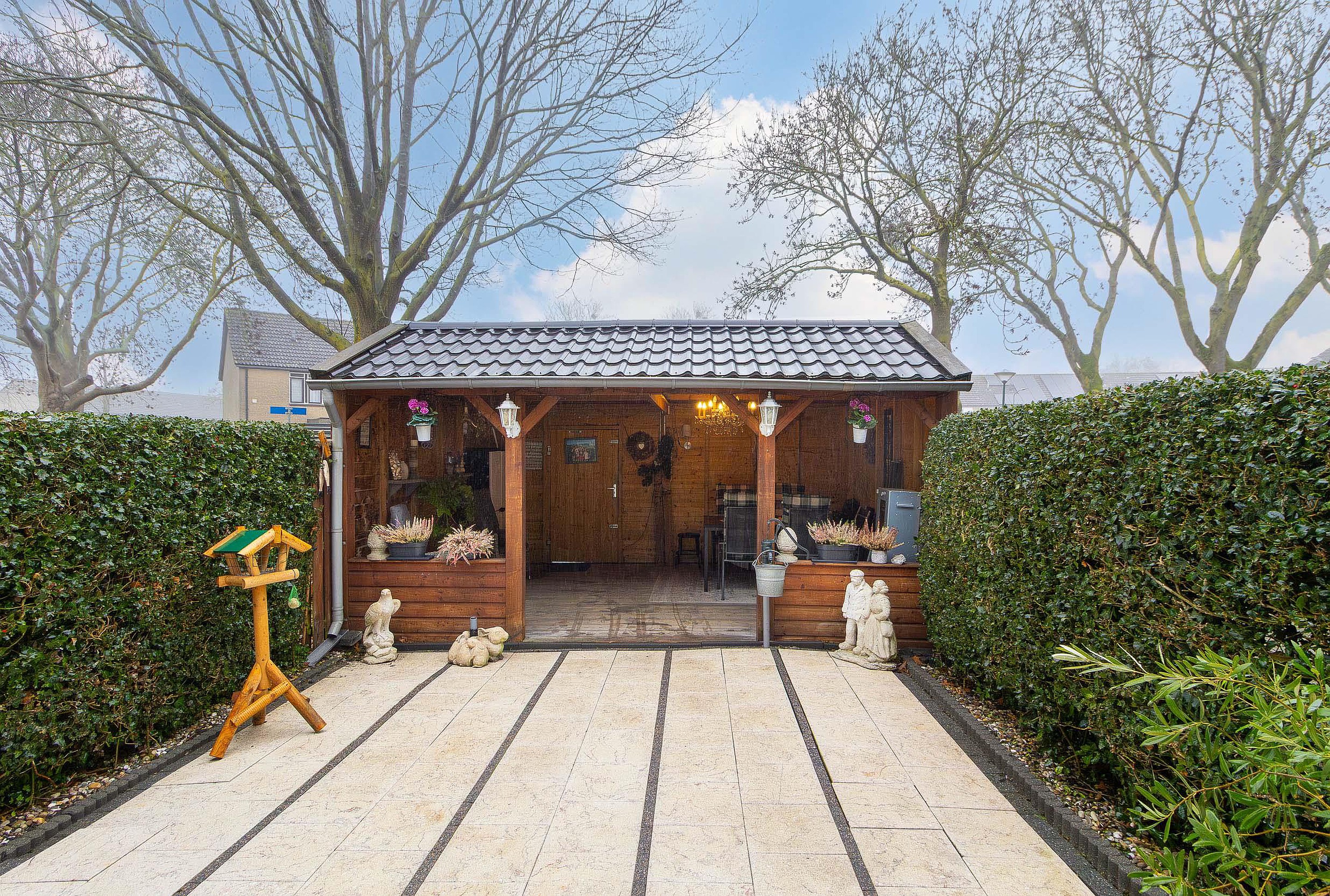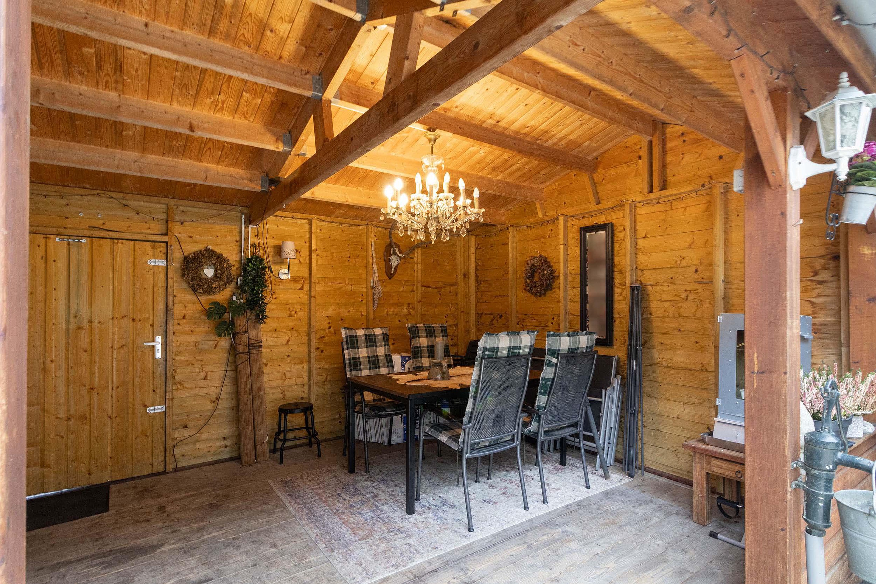 Achterin de tuin staat een royale houten overkapping. Deze sfeervolle ruimte is perfect geschikt als buitenkamer, waar u beschut kunt zitten en tot in de late uurtjes kunt genieten. De overkapping biedt volop mogelijkheden, bijvoorbeeld voor een loungehoek, eetruimte of hobbyruimte.