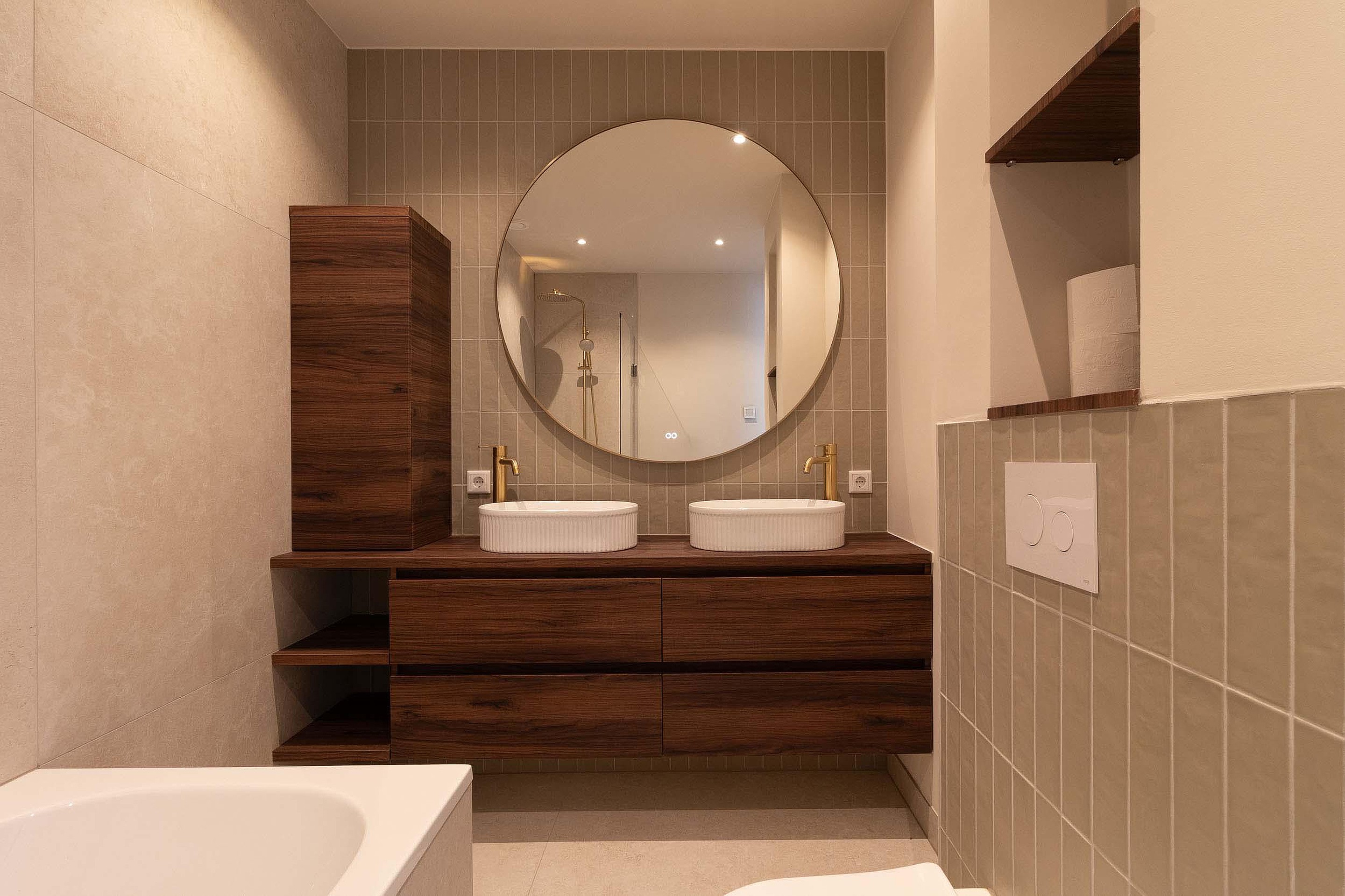 De badkamer is centraal gelegen en beschikt over een douche, bad, toilet, en dubbele wastafel.