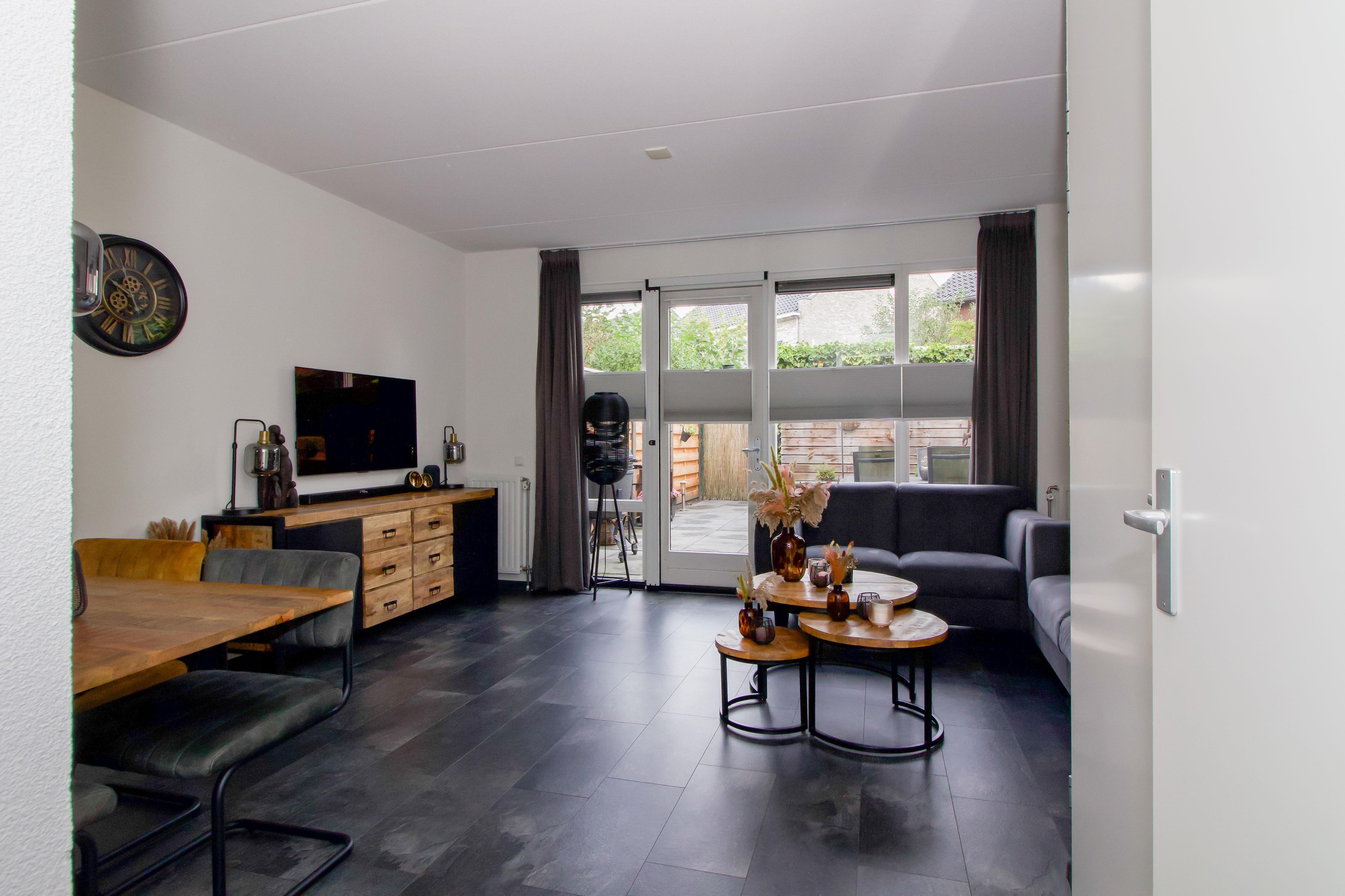 Tuingerichte woonkamer met aan de achterzijde de keuken.