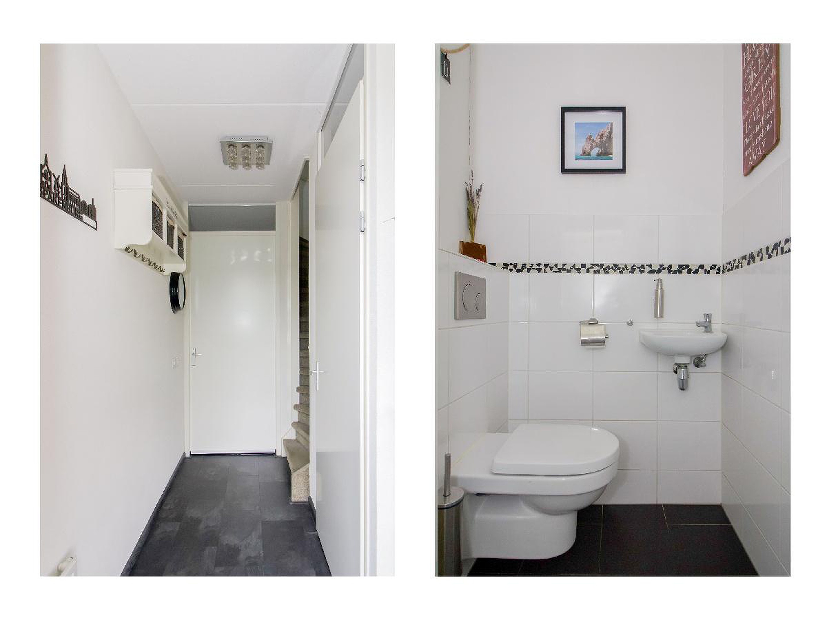Hal met toilet, meterkast en toegang tot de woonkamer.
