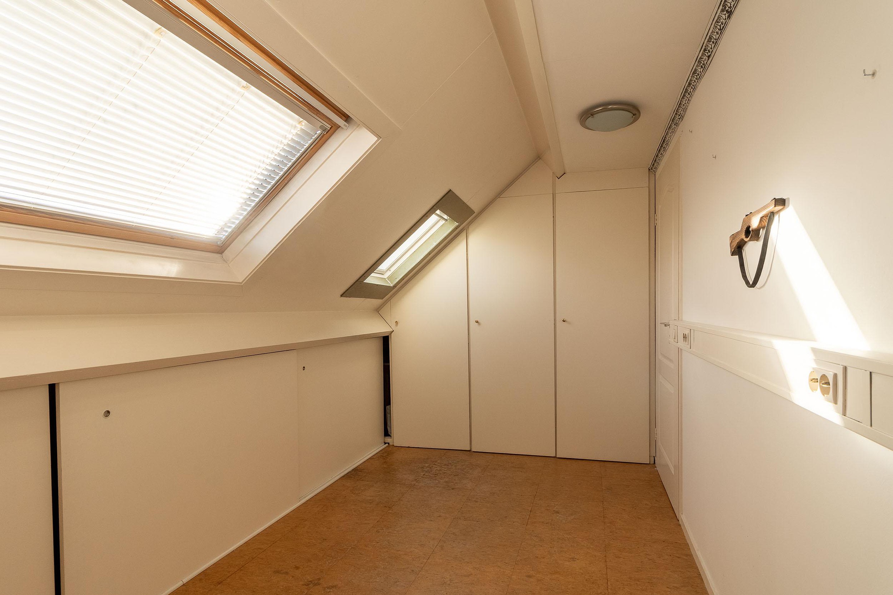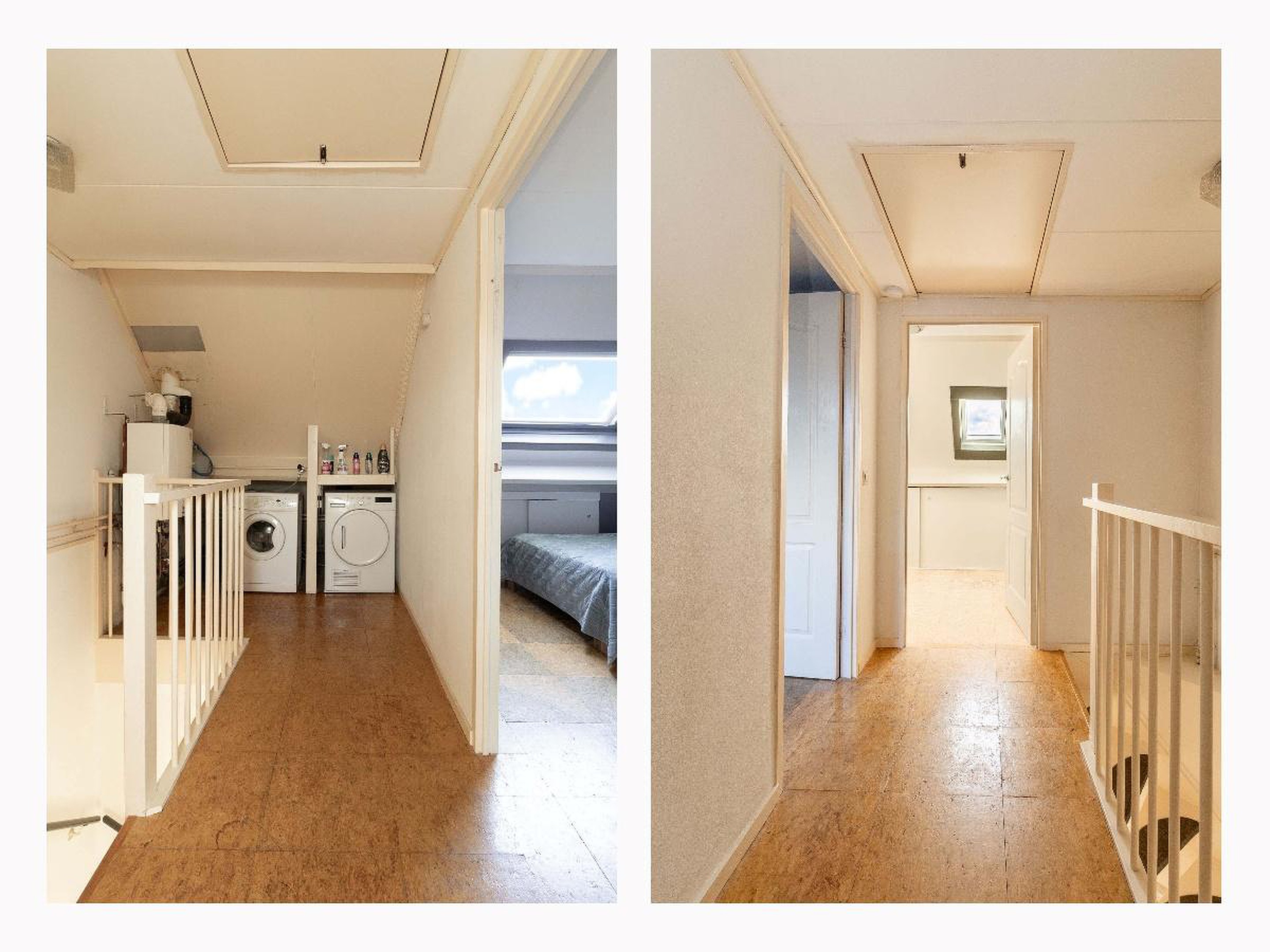 Tweede verdieping Overloop met opstelling voor de wasapparatuur en de cv-installatie. Vanuit de overloop toegang tot twee slaapkamers, beide voorzien van daglicht. Daarnaast is er praktische bergruimte aanwezig achter de knieschotten, wat zorgt voor extra opslagruimte.