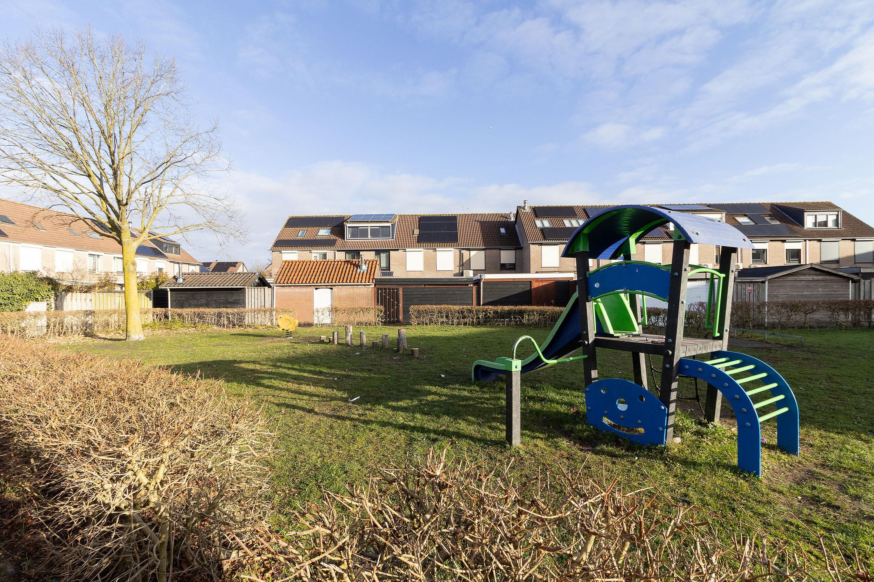 Ook buiten is dit een ideale plek voor gezinnen. De tuin ligt gunstig op het zuiden en biedt volop zon en ruimte om buiten te leven. Naast de stenen schuur aan de voorzijde beschikt de achtertuin over twee houten schuren, ideaal voor fietsen, speelgoed en alles wat je netjes wilt opbergen. Direct achter de woning ligt een speeltuin, waardoor kinderen veilig en dichtbij kunnen spelen. Daarnaast bevinden zich meerdere grote speeltuinen op korte afstand, wat deze locatie extra kindvriendelijk maakt.