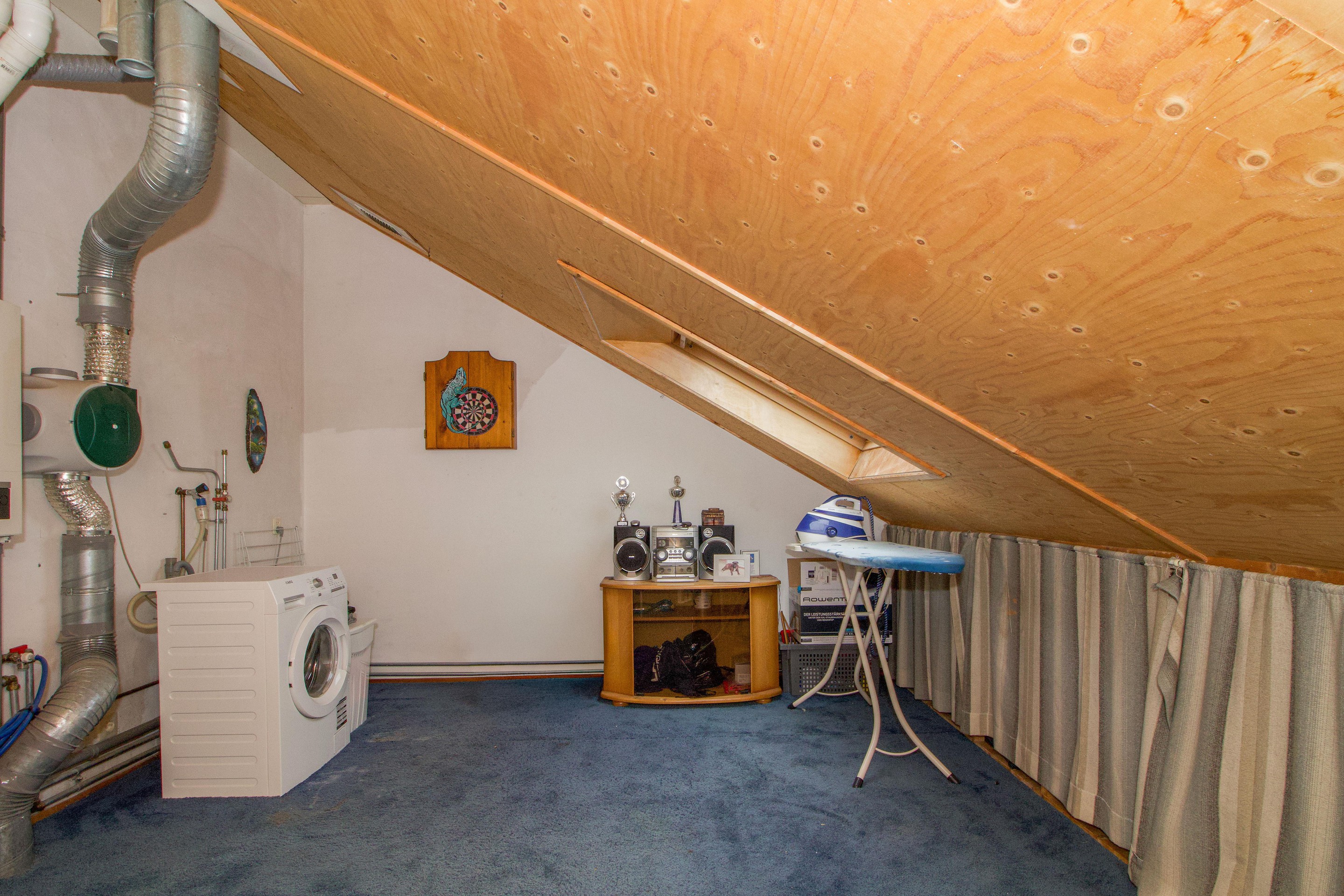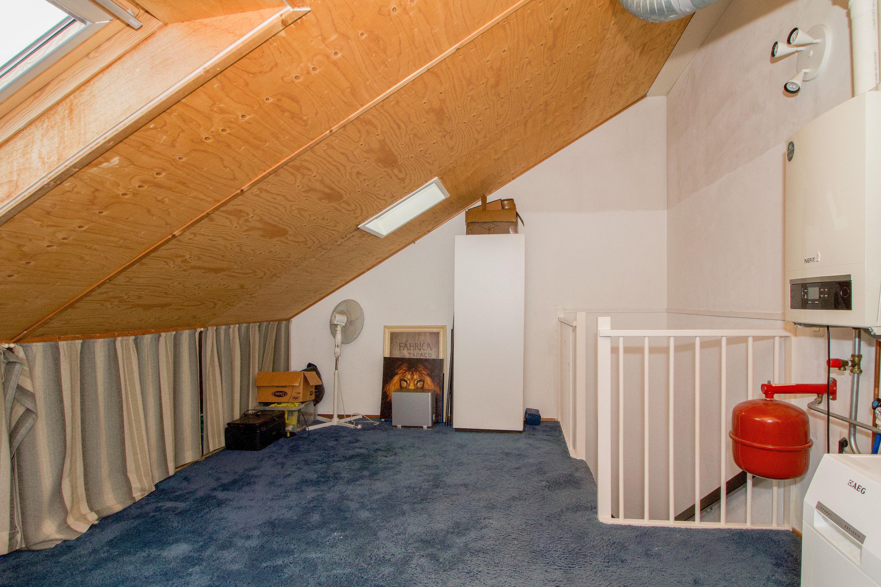 Tweede verdieping Via een vaste trap bereikt u de zolderverdieping. Deze open ruimte is voorzien van aansluitingen voor wasapparatuur en biedt volop mogelijkheden voor het creëren van een extra slaapkamer, werkruimte of berging.