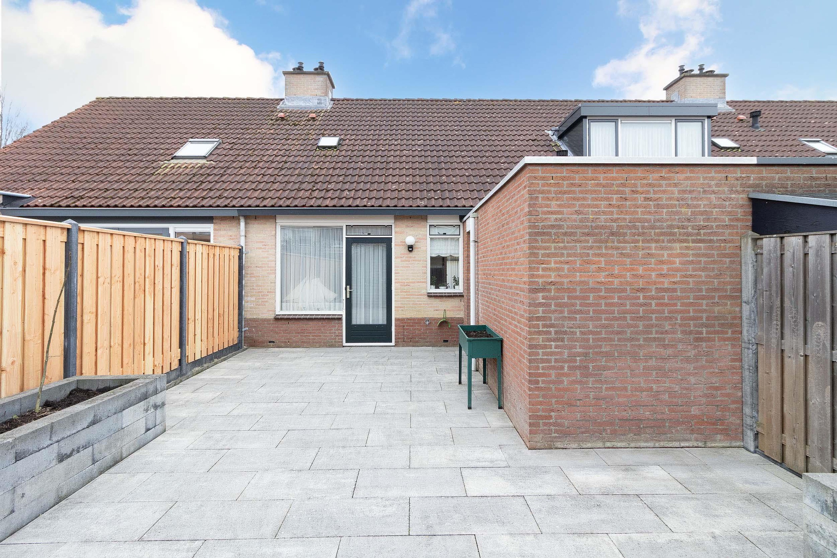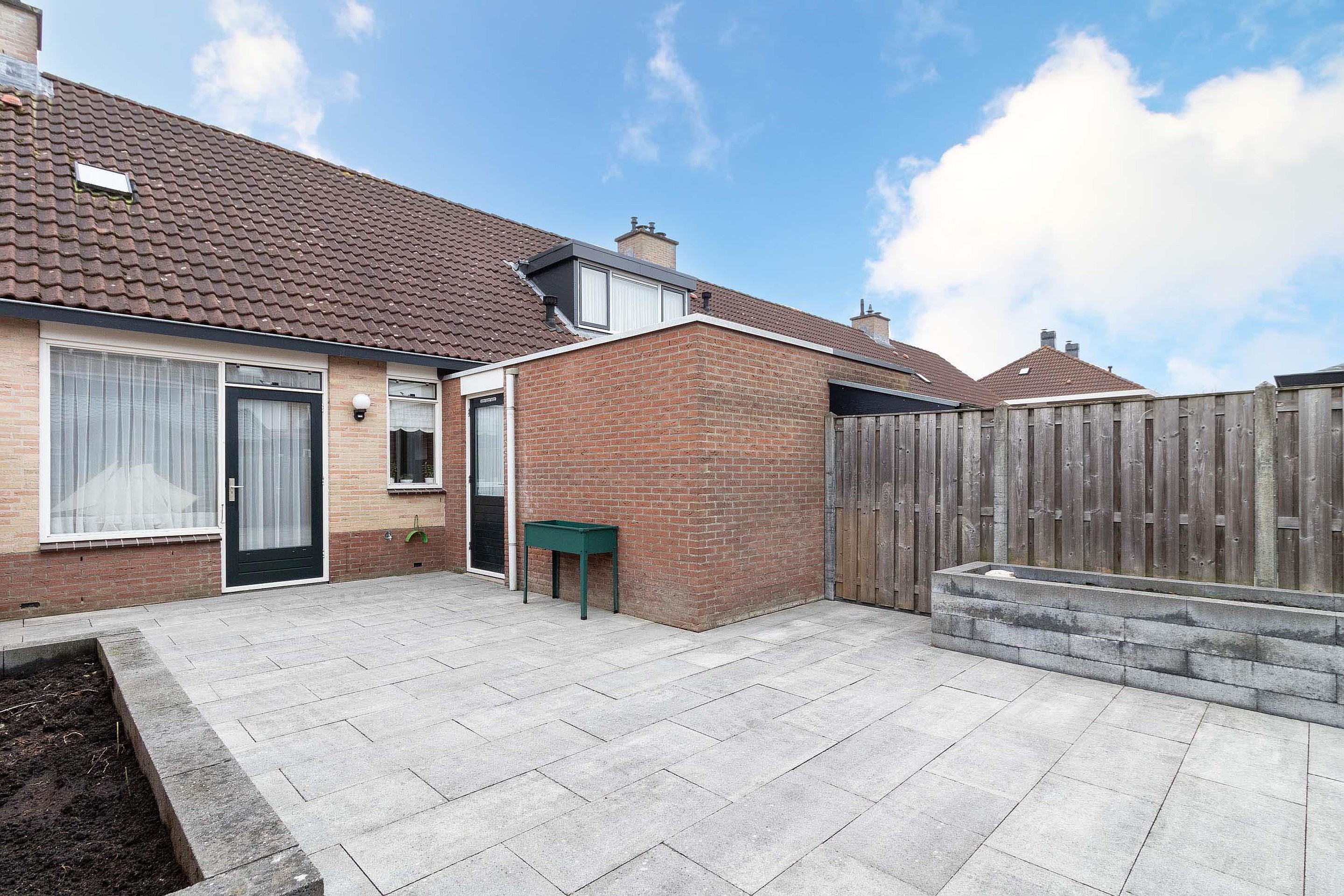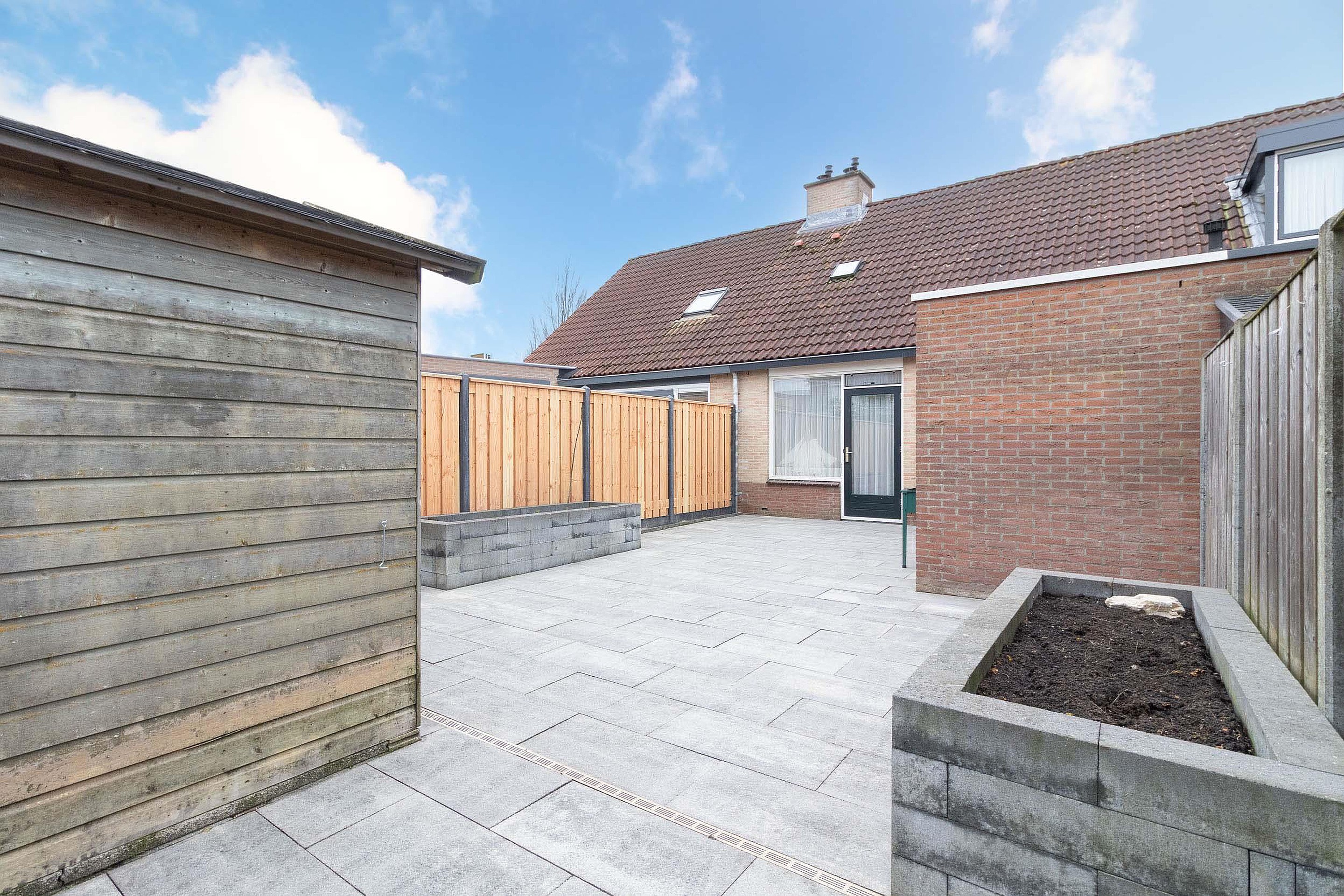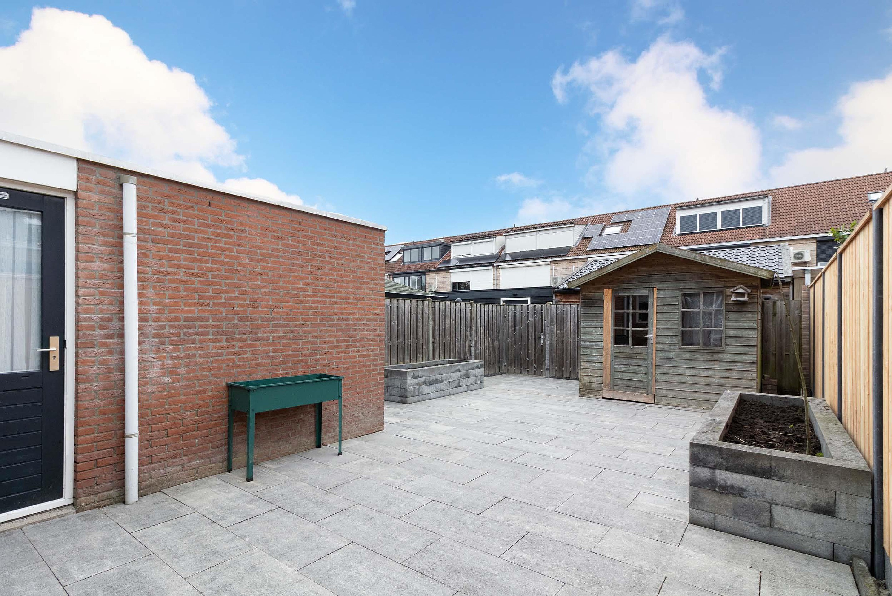 Tuin De verzorgde achtertuin is gelegen op het noorden en is onderhoudsvriendelijk aangelegd met een ruim terras, vaste plantenbakken en erfafscheidingen. Dankzij de open indeling is er voldoende ruimte voor een zit- en eethoek. Achterin de tuin bevindt zich een vrijstaande houten berging, ideaal voor het opbergen van fietsen en tuingereedschap. De tuin biedt veel privacy en is een fijne buitenruimte om het hele jaar door van te genieten.