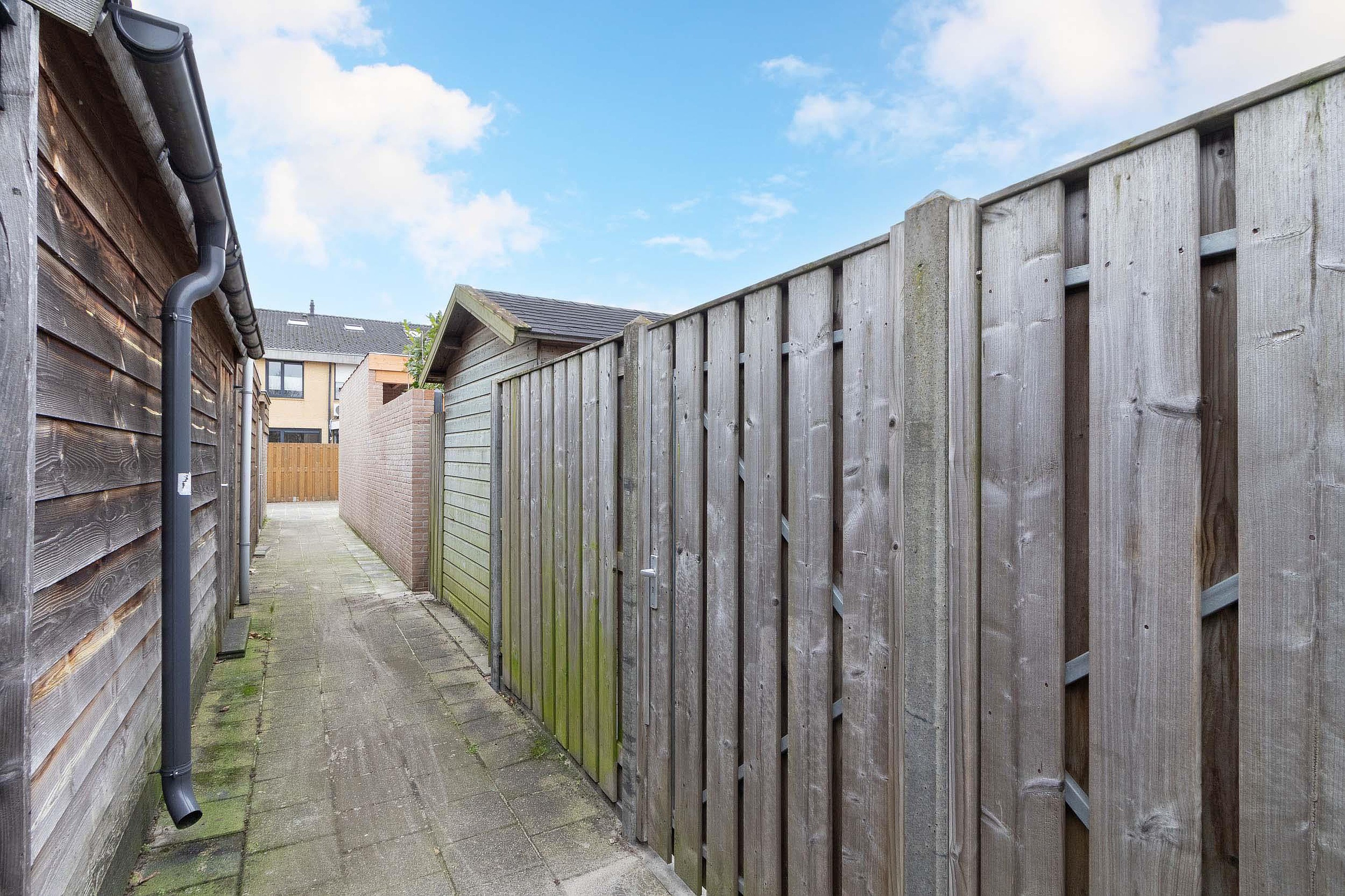 De diepe achtertuin is grotendeels bestraat en daardoor bijzonder onderhoudsvriendelijk. Geen wekelijks tuinwerk, maar juist alle ruimte om het buitenleven naar eigen wens in te richten. Dankzij de diepte van de tuin is er altijd wel een plek in de zon te vinden, terwijl je door de noordligging op warme zomerdagen ook prettig de schaduw kunt opzoeken. Een buitenruimte die rust en gemak biedt en aanvoelt als een verlengstuk van de woning.