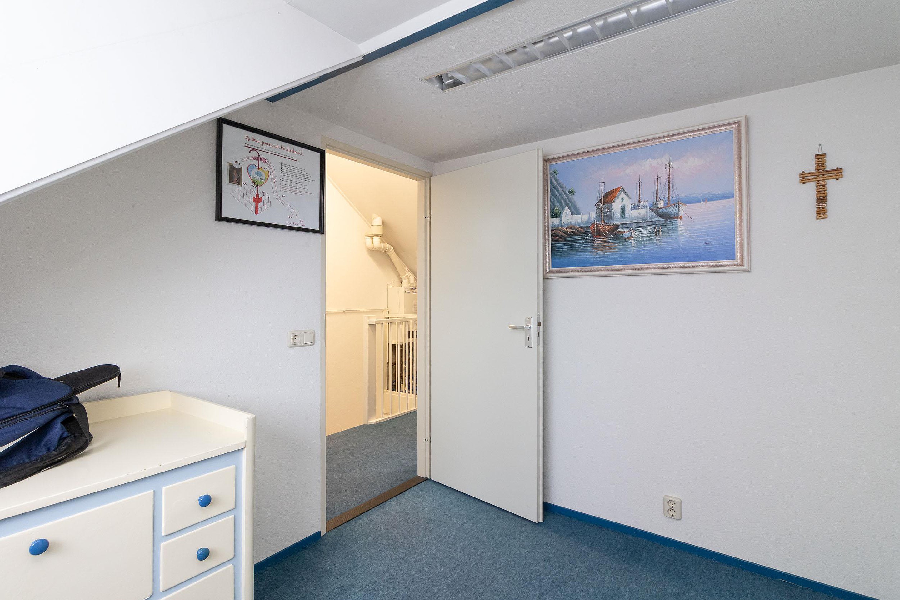 Op deze verdieping bevinden zich twee slaapkamers, waarvan 1 met dakkapel. Beide voorzien van daglicht en praktische indeling. Dankzij de schuine dakvlakken is de ruimte speels en sfeervol, terwijl de aanwezige knieschotten (vaste kasten) zorgen voor extra bergruimte.