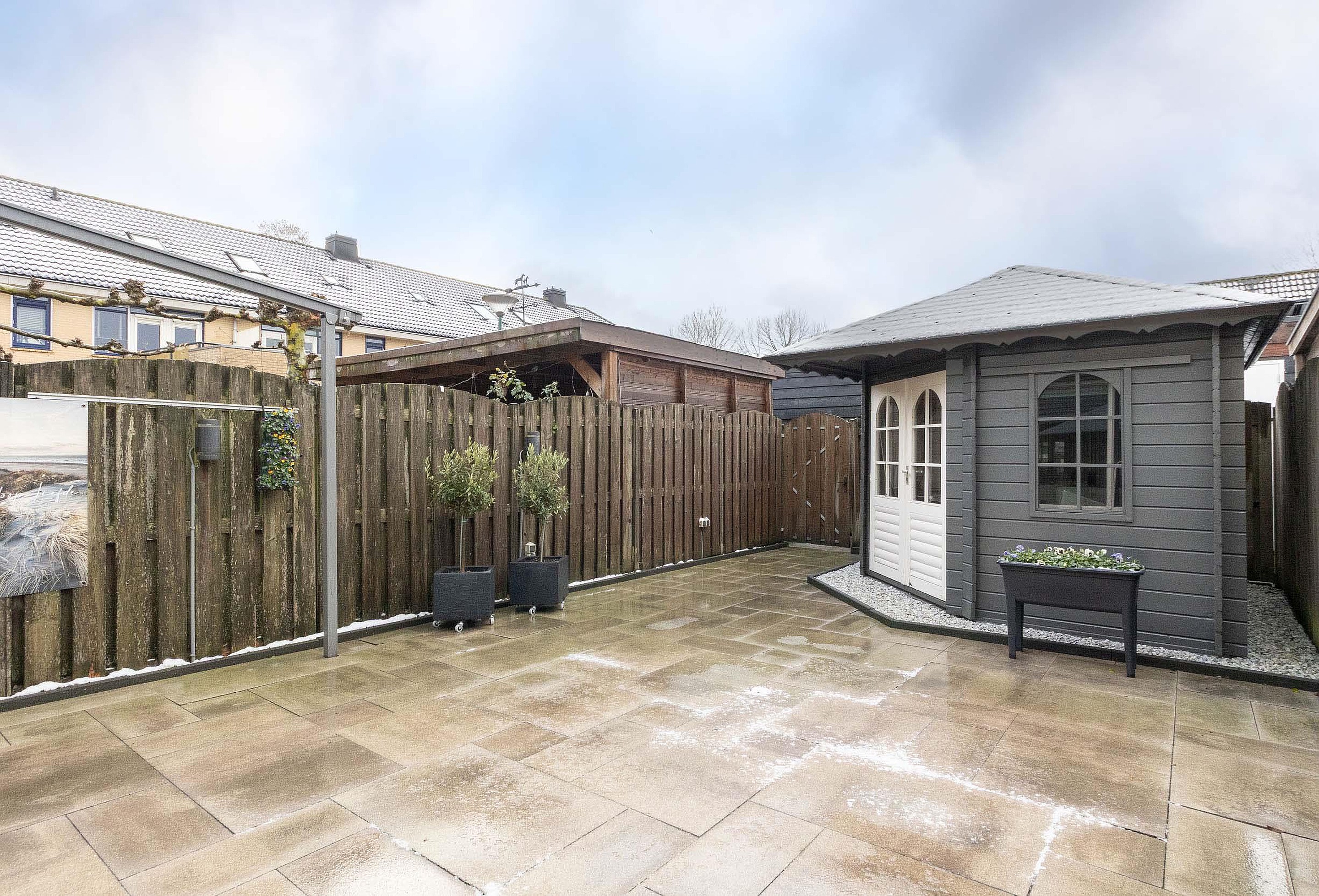 Achterin de tuin bevindt zich een vrijstaande berging, perfect voor het opbergen van tuinmeubilair en gereedschap. Daarnaast is er een praktische achterom.