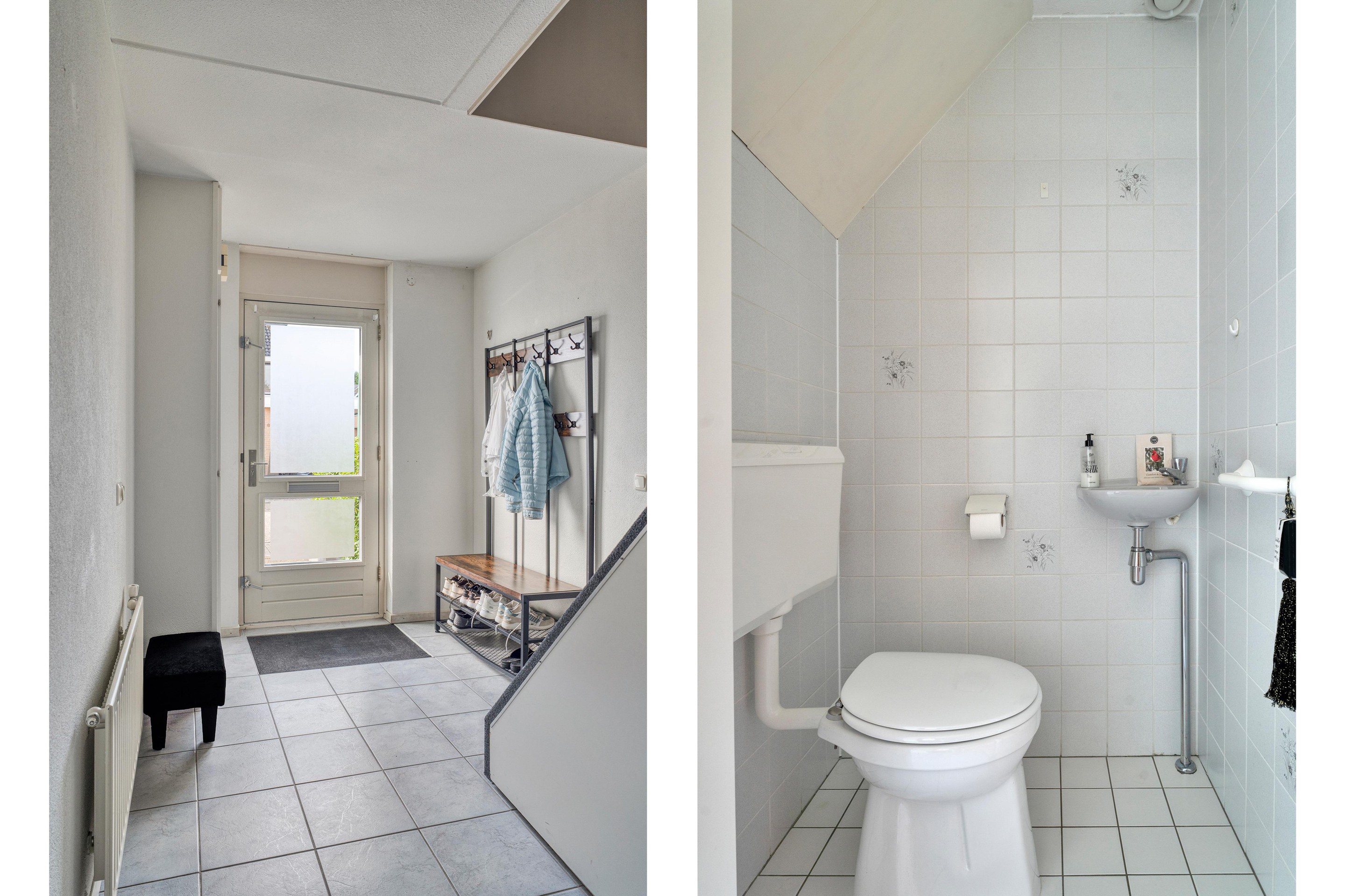 Via de entree bereikt u de hal met toilet, bergkast en trapopgang. De lichte woonkamer vormt het hart van de woning en staat in verbinding met de keuken. Aansluitend bevindt zich een praktische bijkeuken, ideaal voor extra opslag of het plaatsen van witgoed.