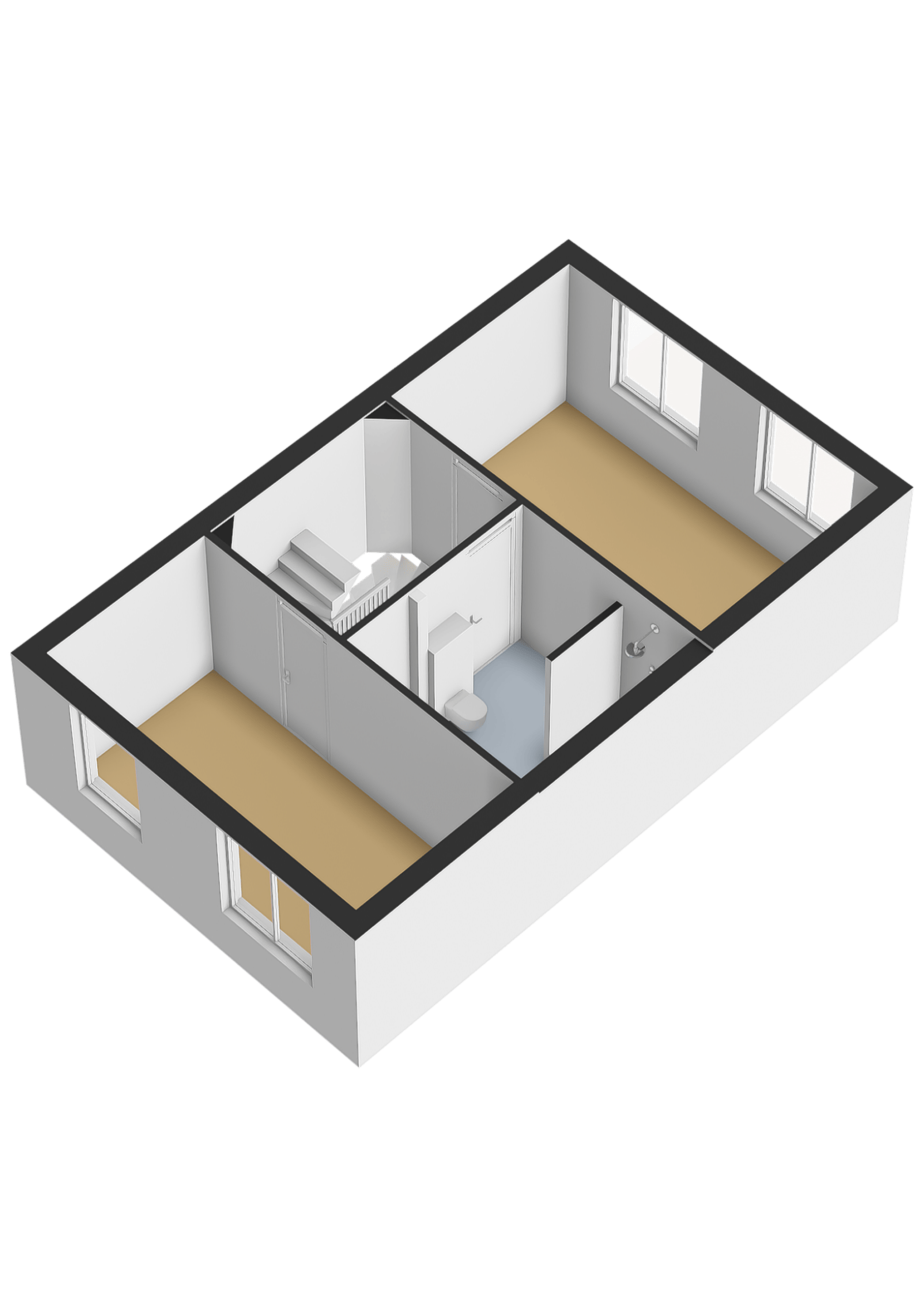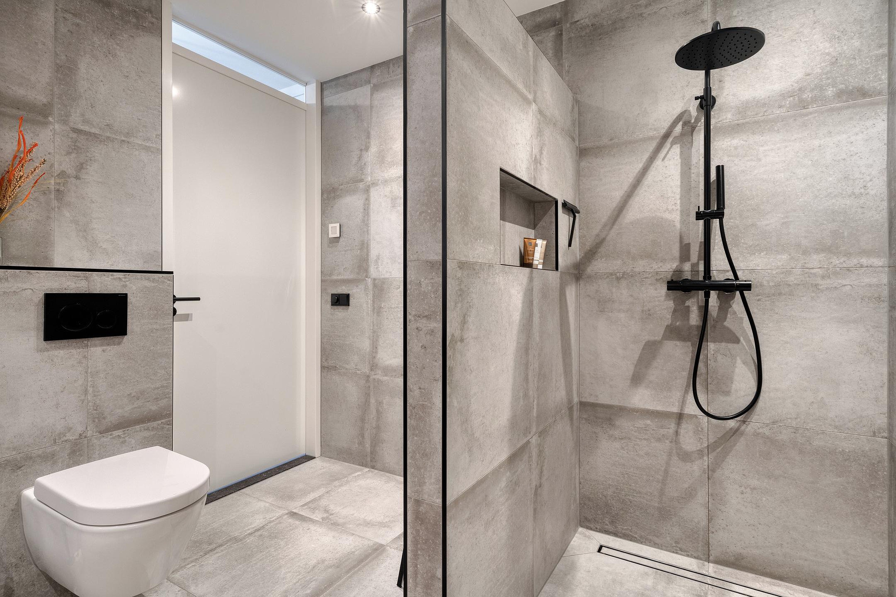De badkamer ligt centraal op de verdieping en is uitgerust met een douche, toilet en een dubbele wastafel.