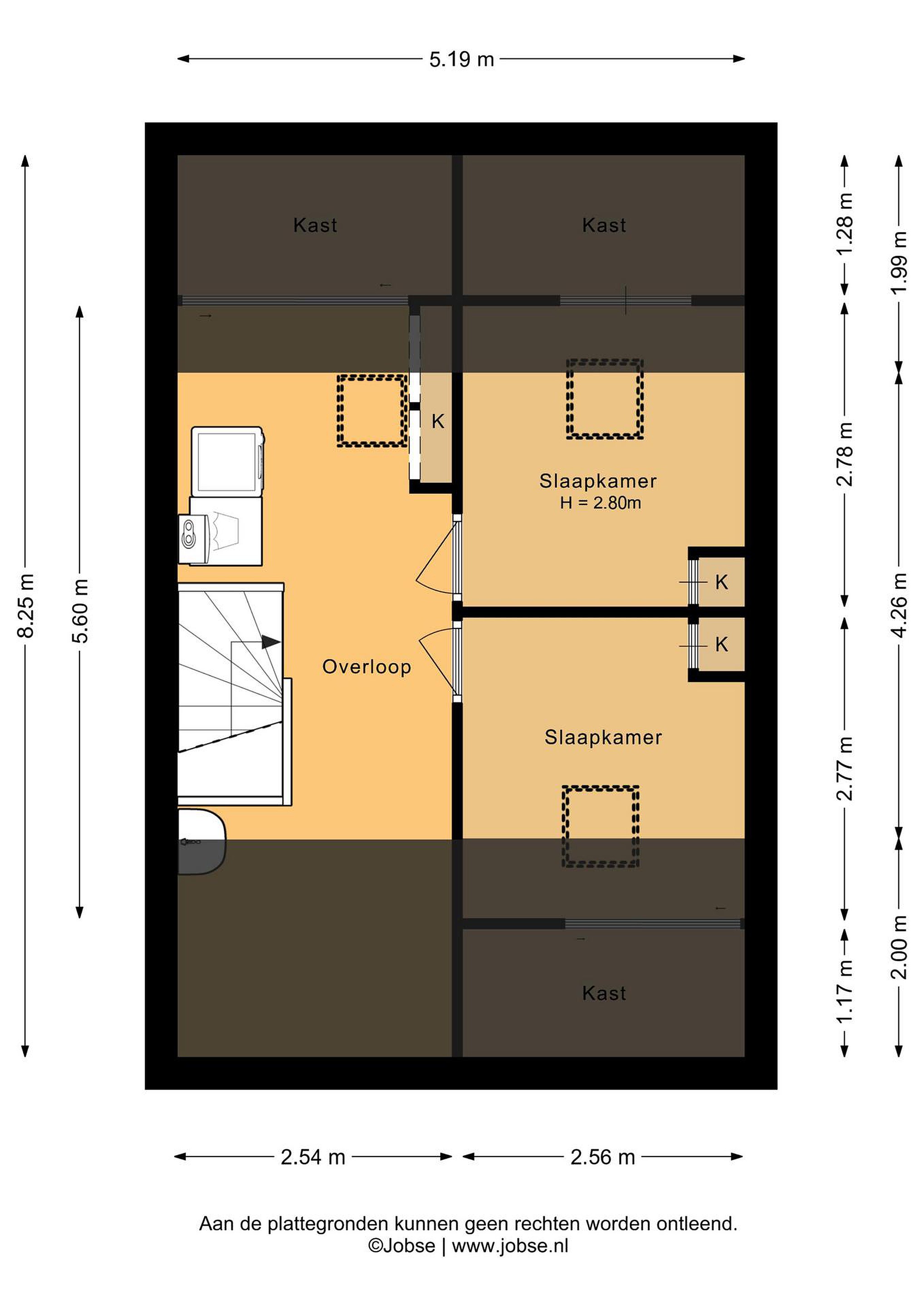 Tweede verdieping Via de overloop bereikt u de zolderverdieping, waar zich twee slaapkamers bevinden. Beide kamers zijn voorzien van bergruimte achter de knieschotten, wat zorgt voor praktische opbergmogelijkheden.