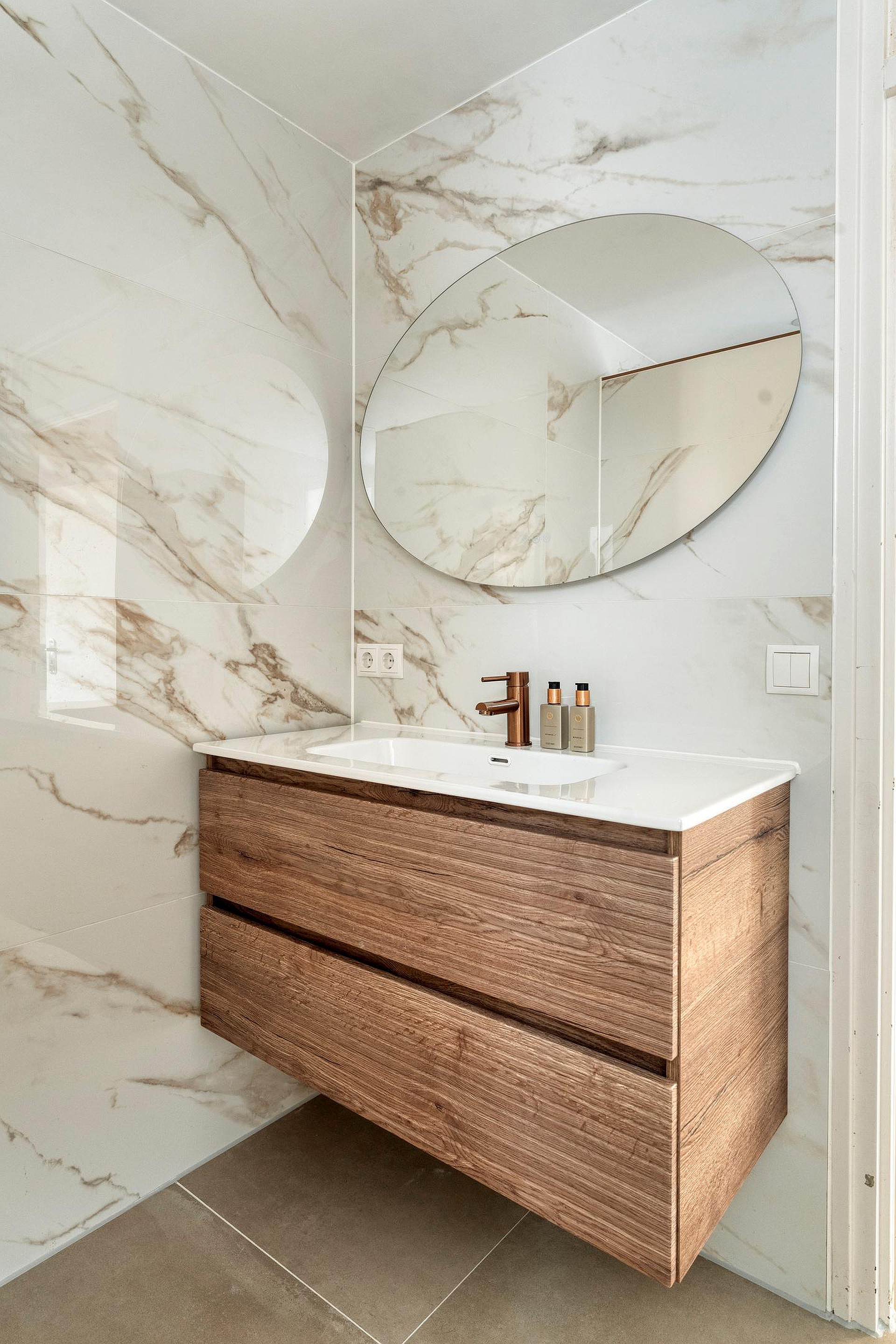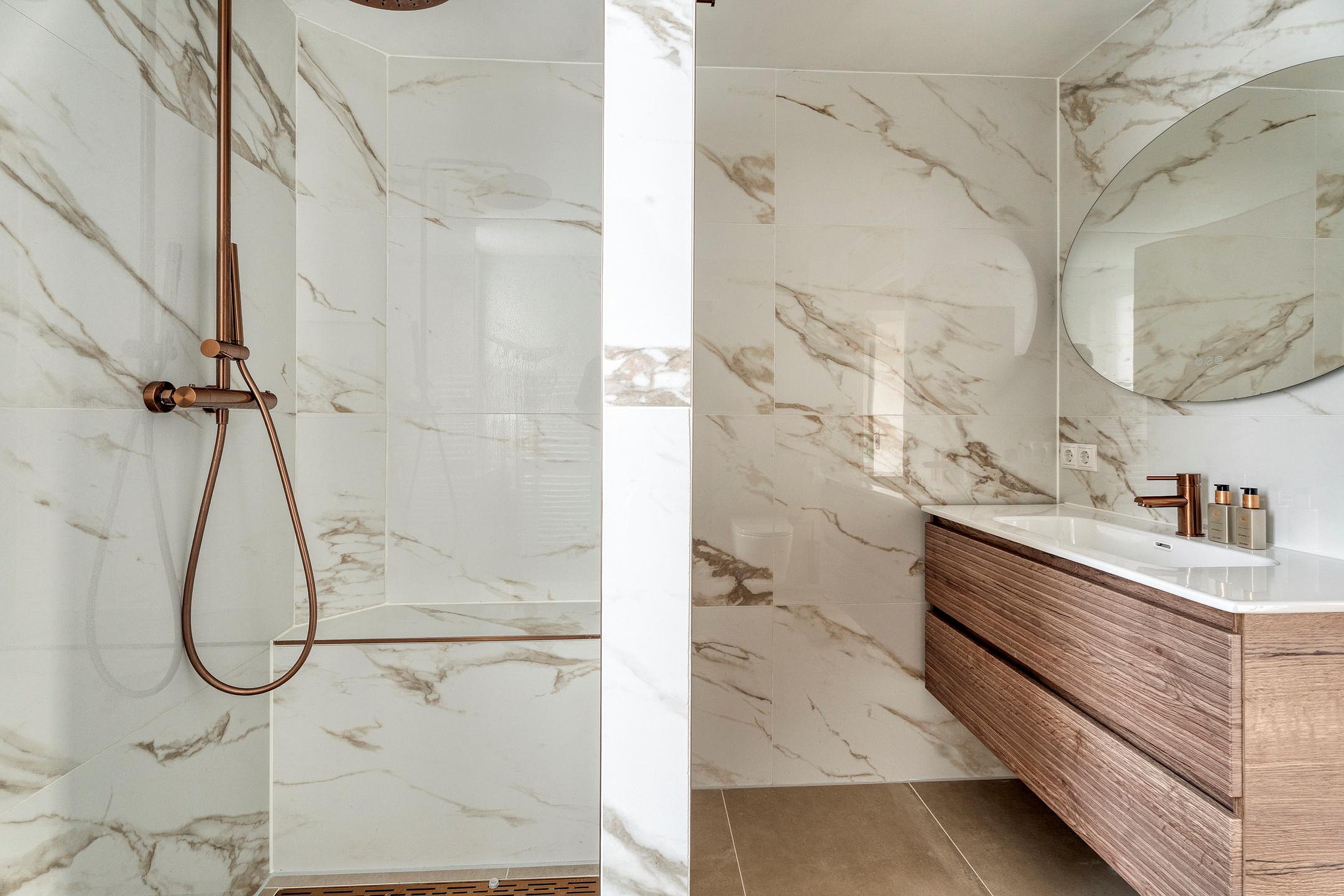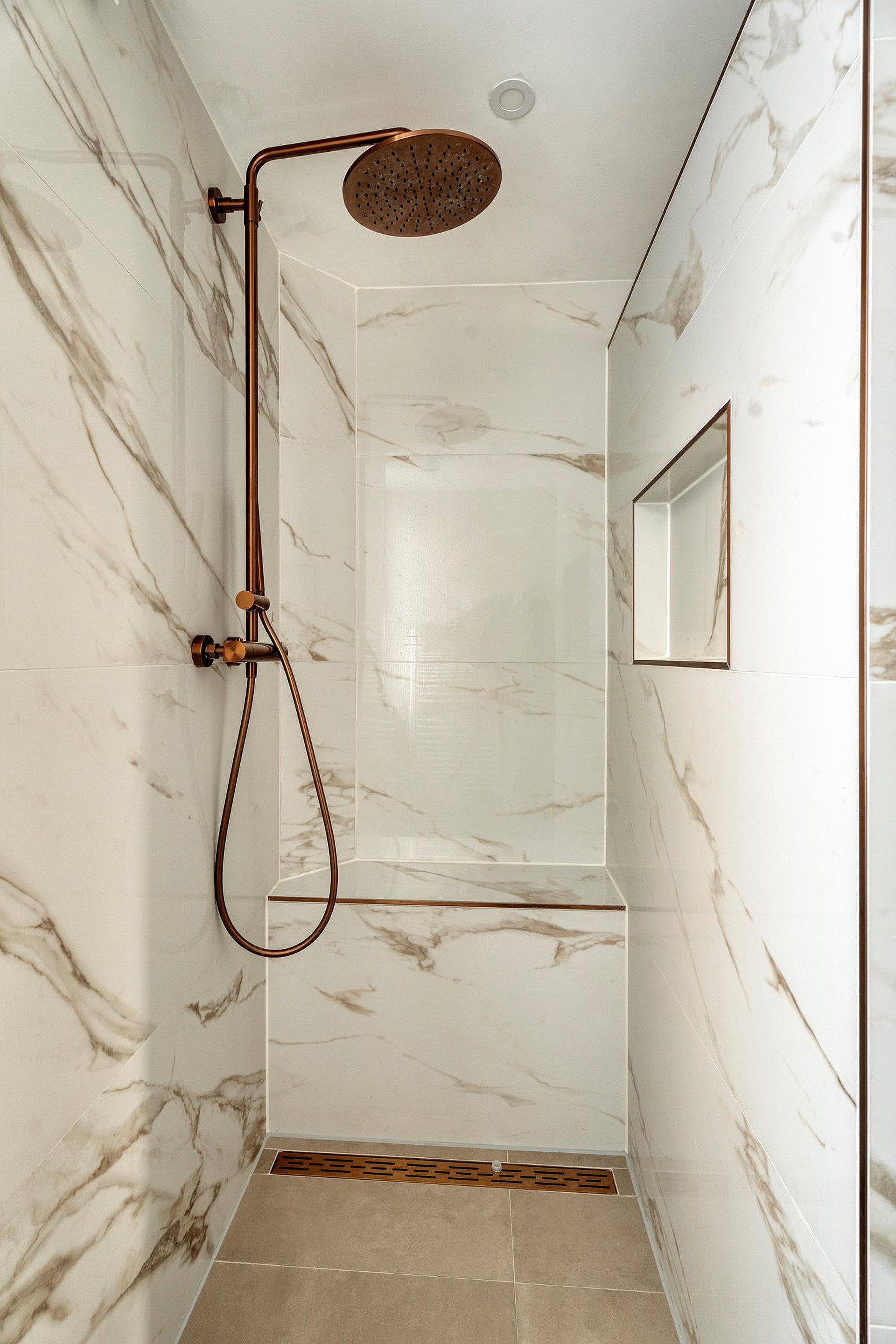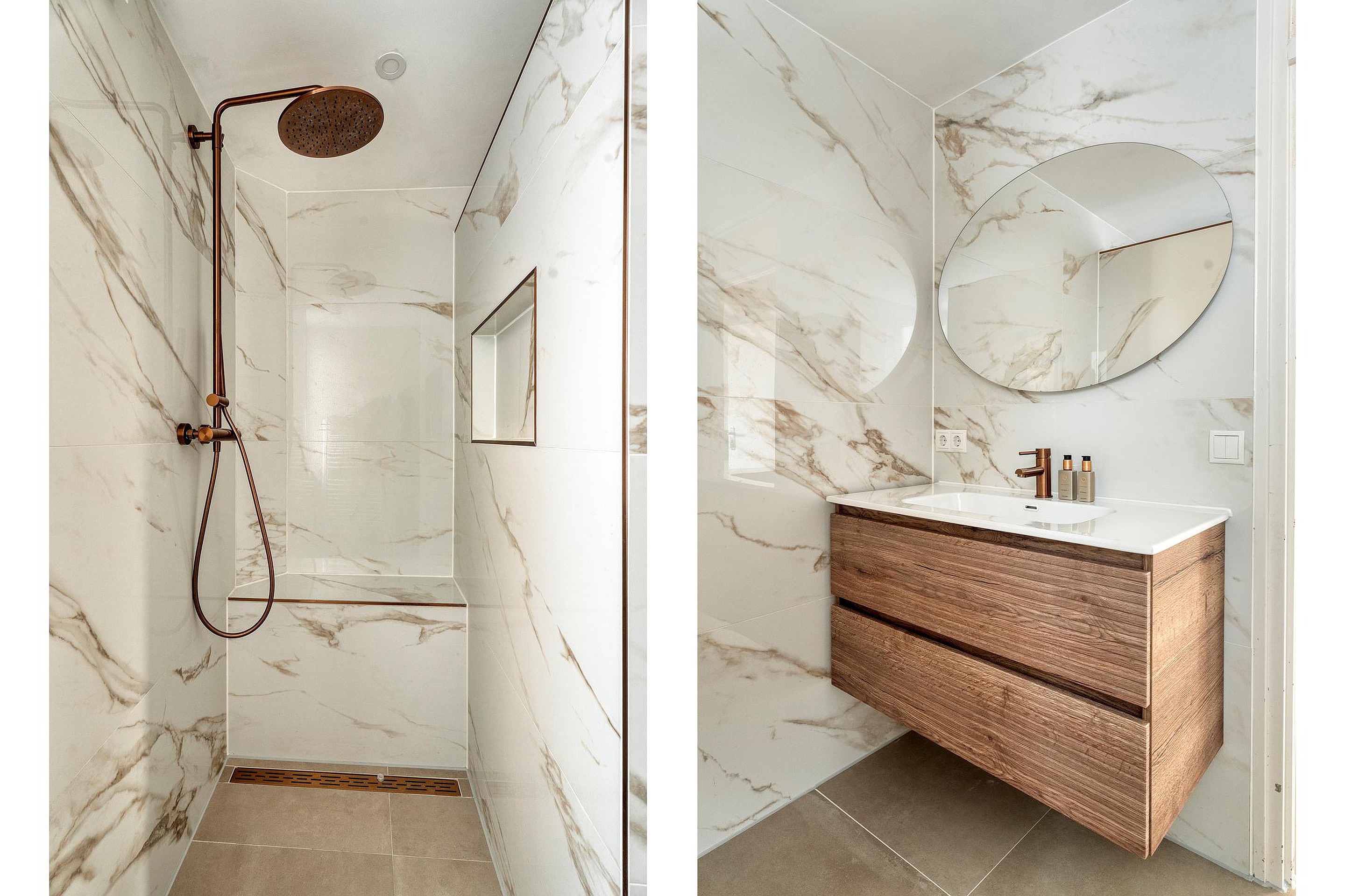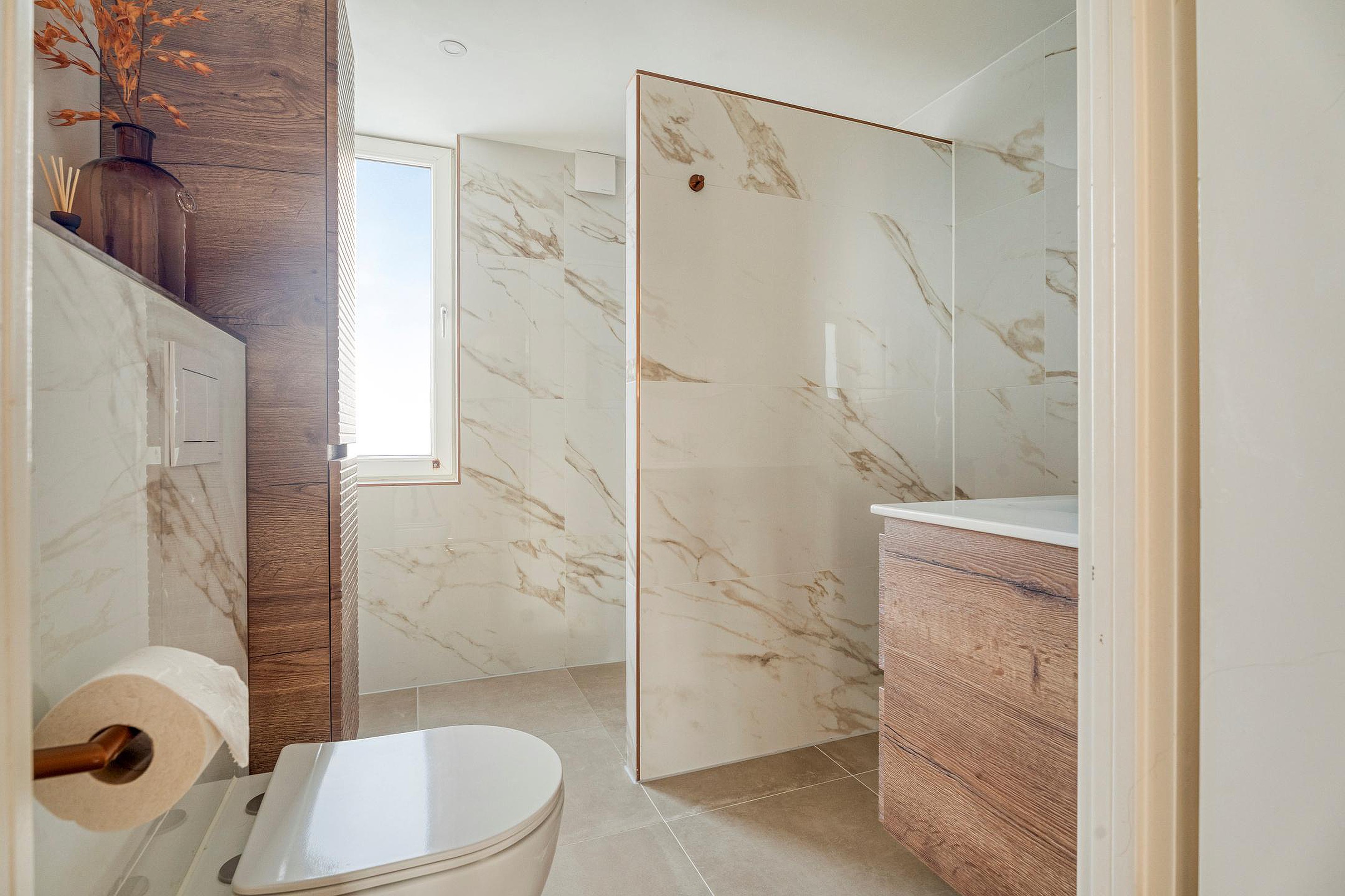 De badkamer is compleet uitgevoerd met een inloopdouche, wastafel, toilet en vloerverwarming.