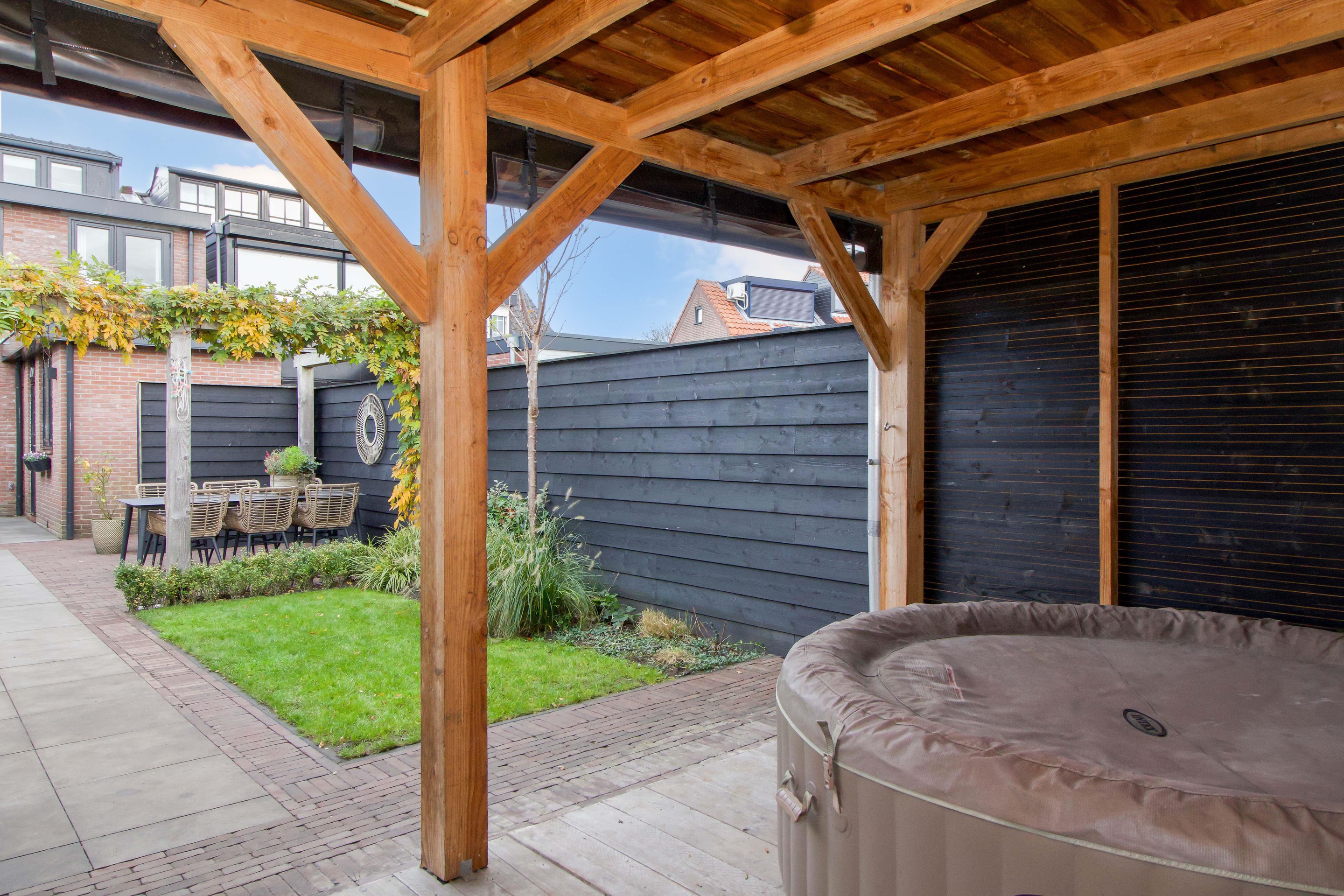 Achter in de tuin staat een royale overkapping met houten constructie. Deze sfeervolle plek biedt het hele jaar door de mogelijkheid om beschut te zitten. De tuin wordt omgeven door een combinatie van een gemetselde muur en zwarte houten schuttingen, wat niet alleen privacy biedt maar ook zorgt voor een strak en modern geheel.