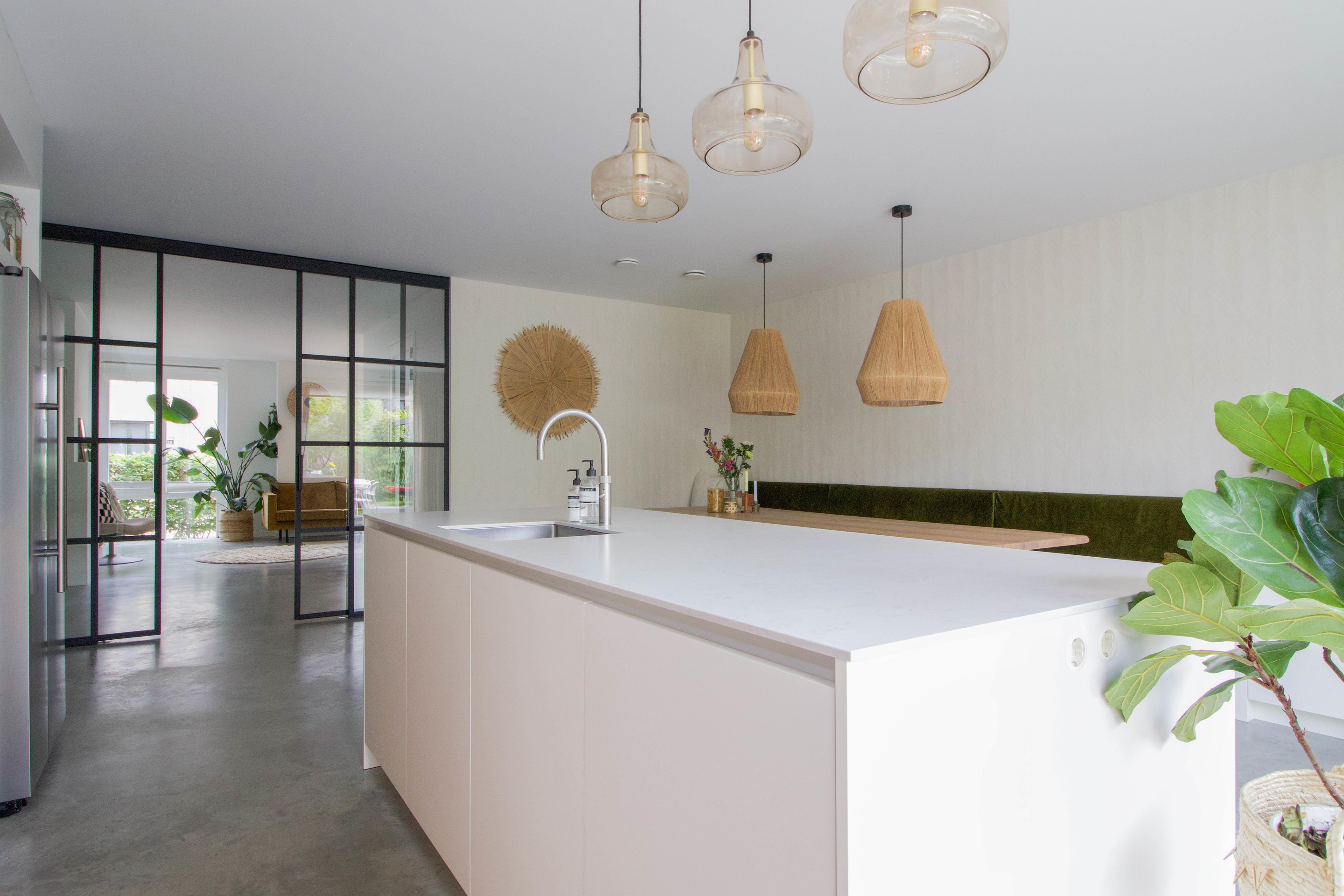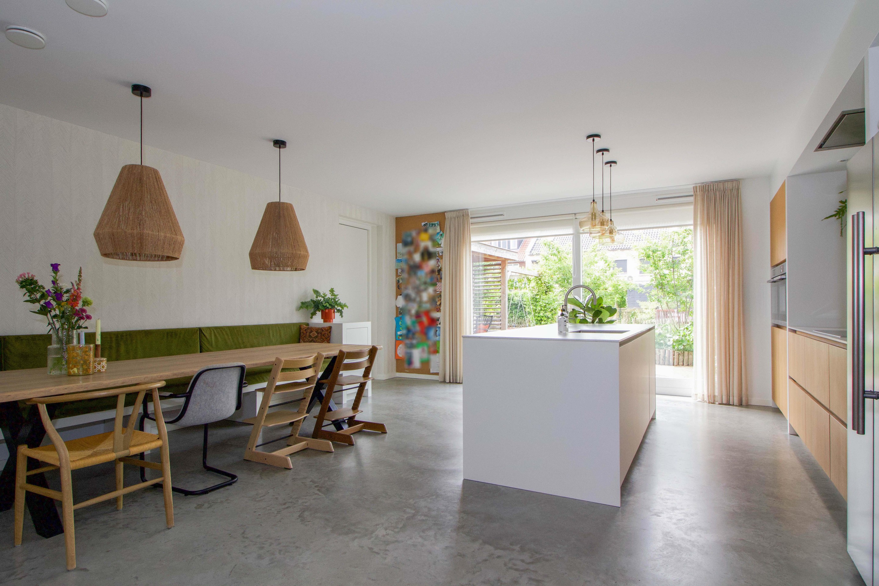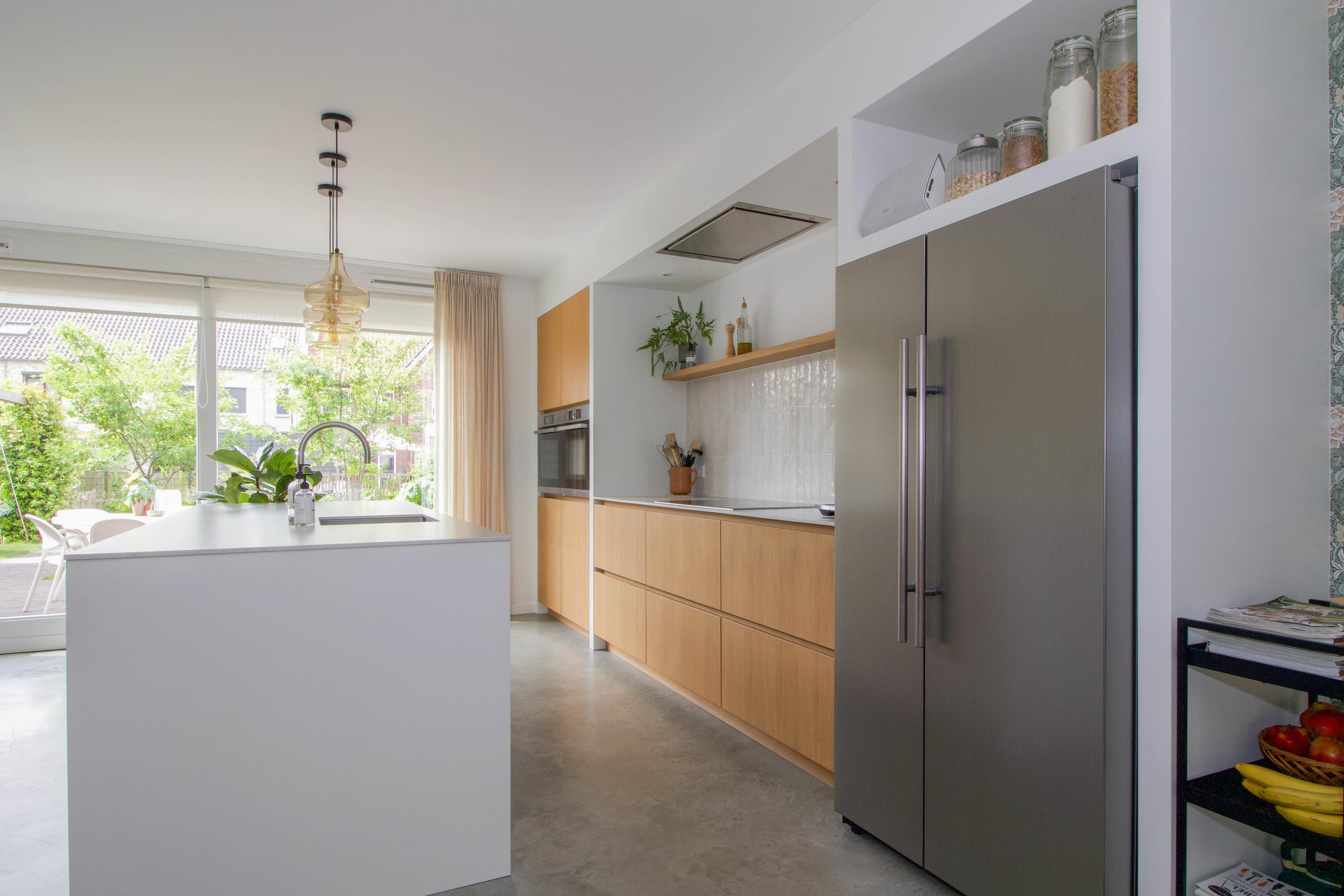 De keuken staat in prettige verbinding met de woonkamer, die door de L-vorm knus aanvoelt en tegelijkertijd verrassend ruim is. Zo heb je het beste van twee werelden: openheid én geborgenheid.