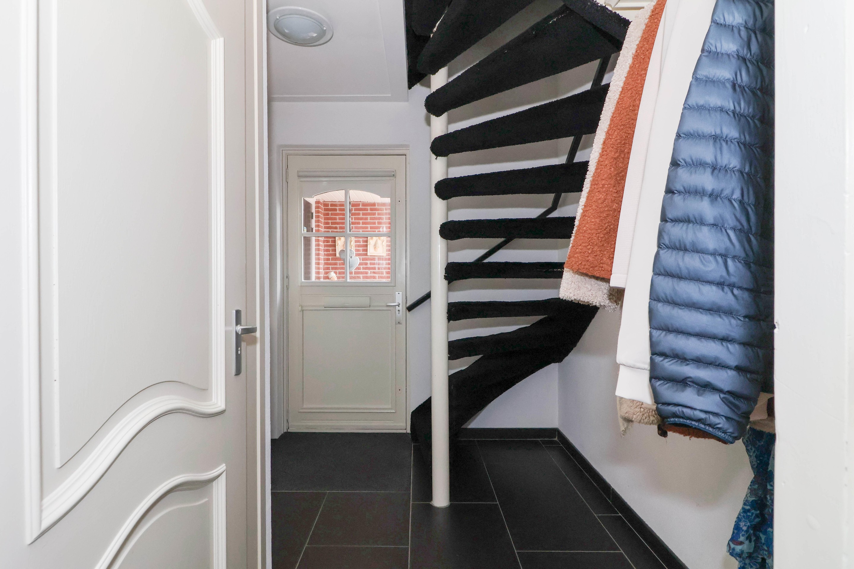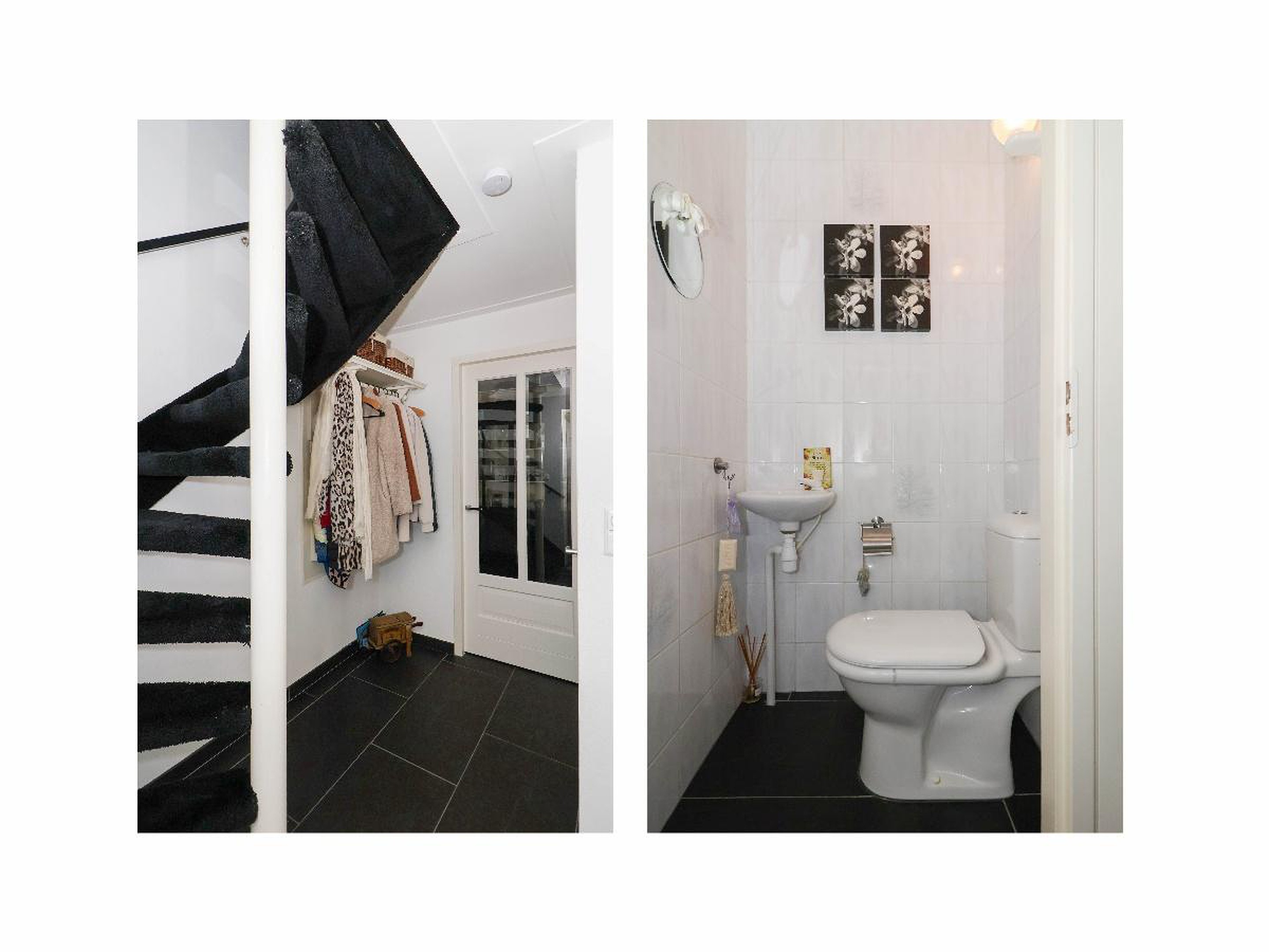 Hal met toilet, trapopgang naar de verdieping en toegang tot de woonkamer.