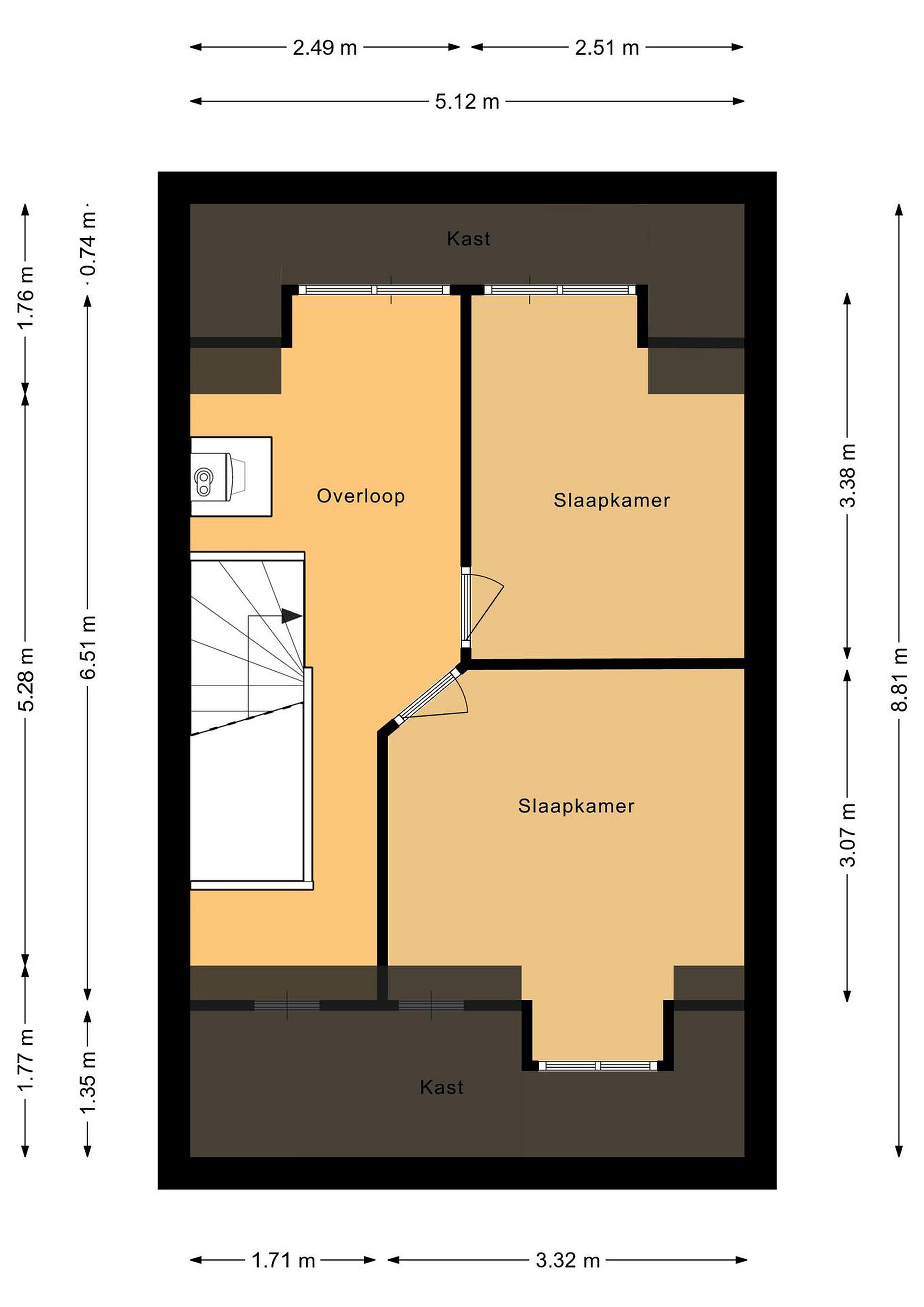 Daarnaast beschikt deze verdieping over extra bergruimte in de aanwezige inbouwkasten achter de knieschotten. Zo wordt de beschikbare ruimte optimaal benut zonder dat dit ten koste gaat van het wooncomfort.