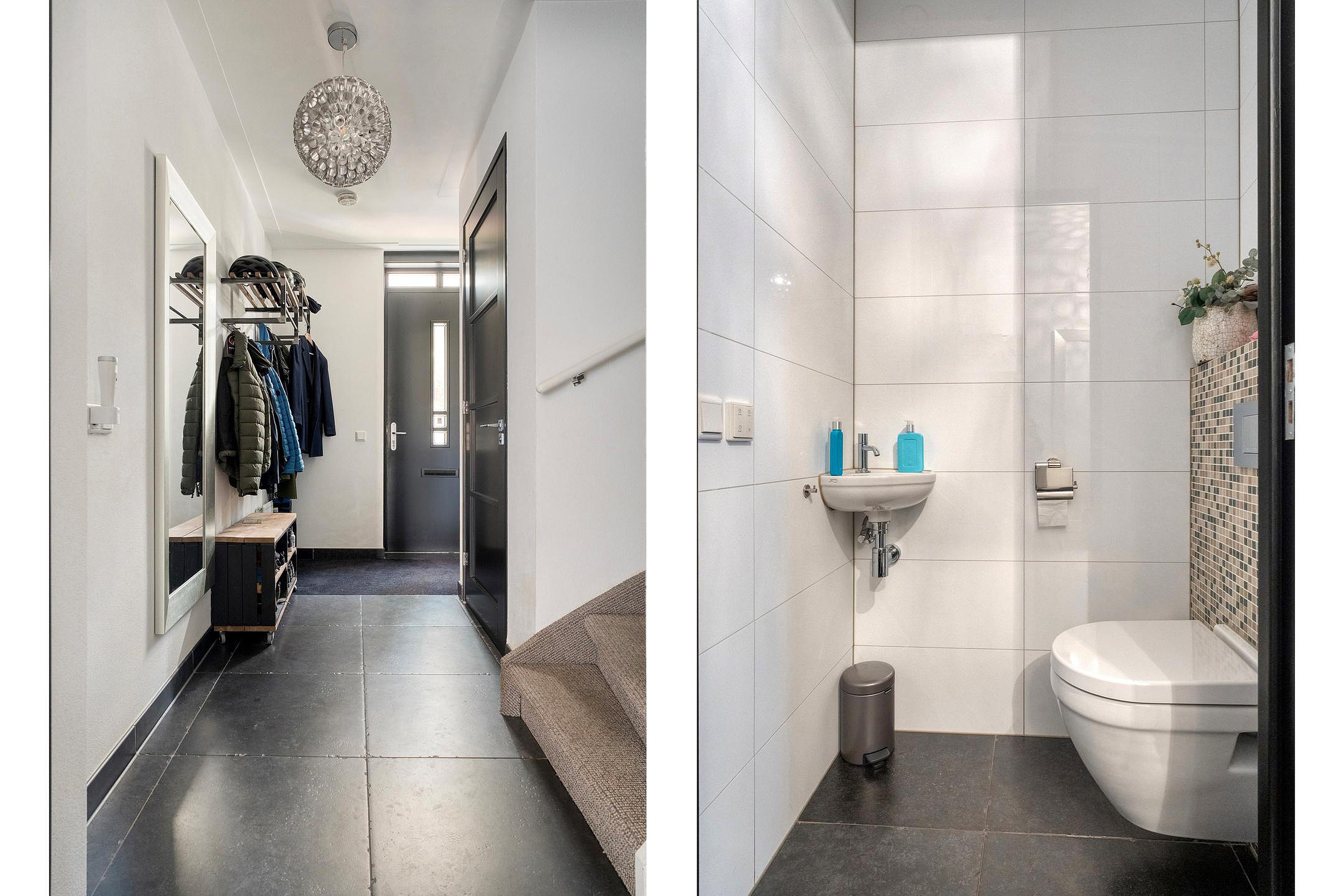 Begane grond Bij binnenkomst via de voordeur komt u in de entree met voldoende ruimte voor een kapstok of garderobe. Vanuit de entree heeft u toegang tot de meterkast (MK), het toilet met fonteintje, en de trapopgang naar de verdieping. Daarnaast is er onder de trap een praktische trapkast aanwezig, ideaal als berging.