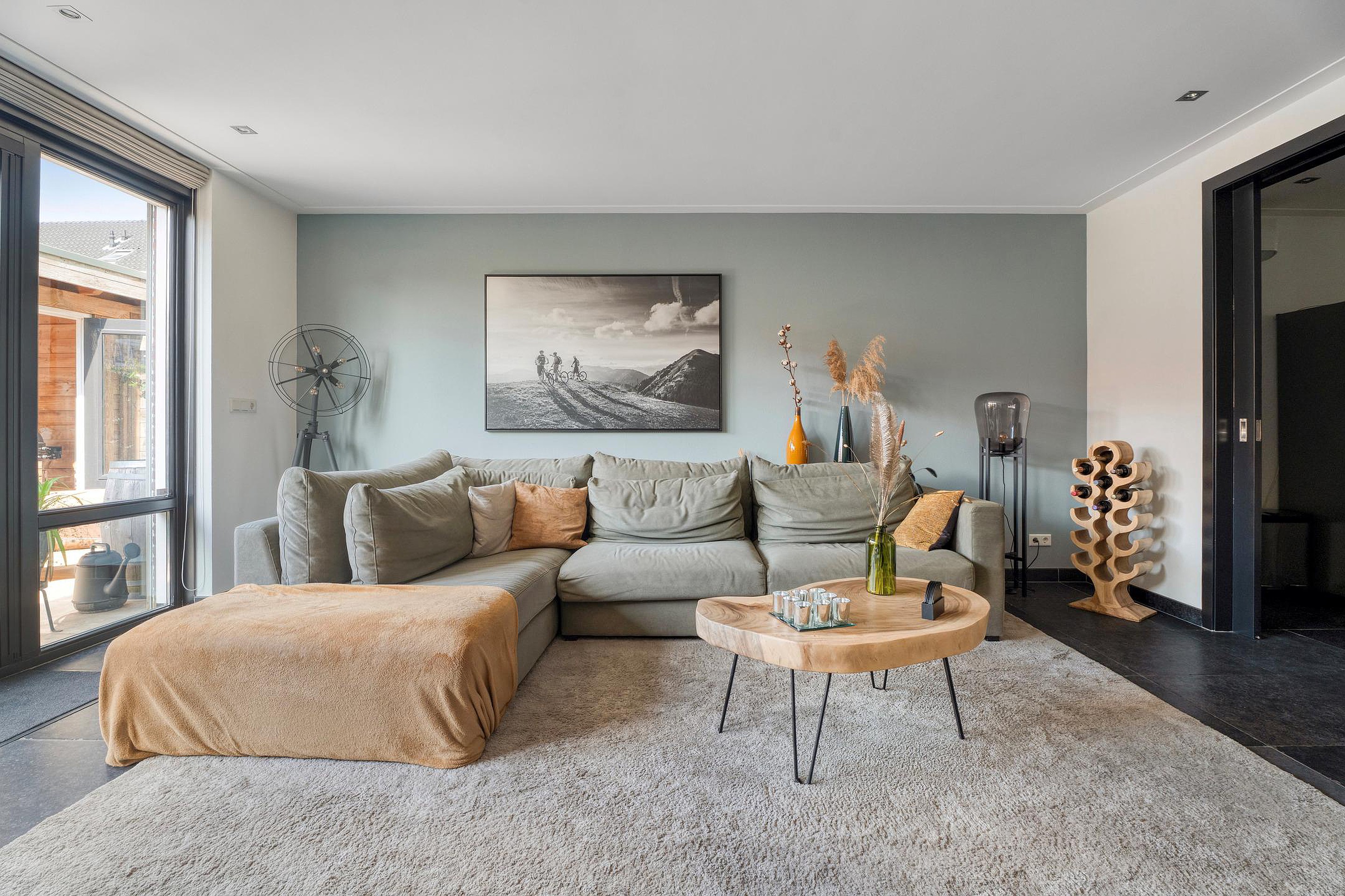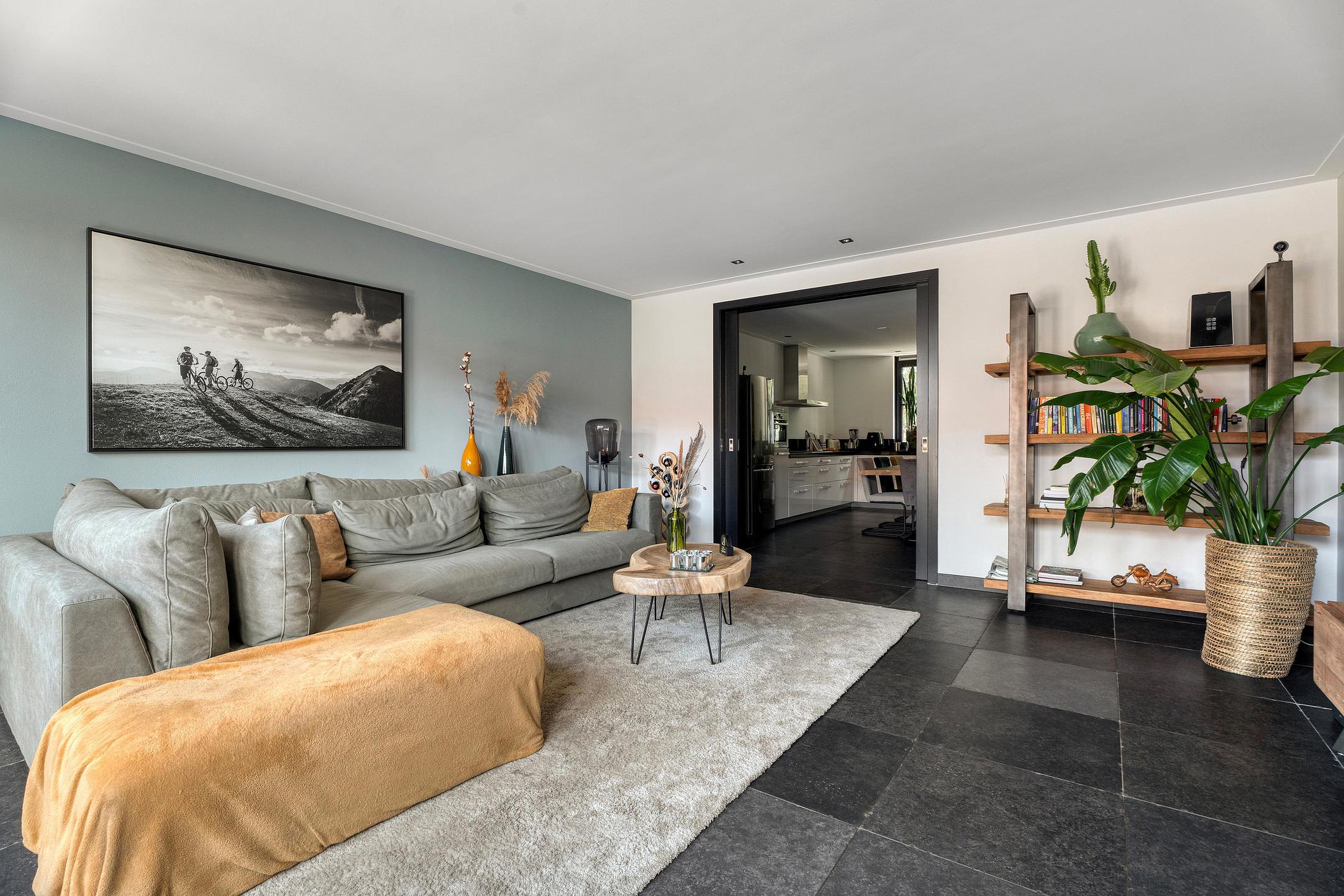 Binnen is de sfeer warm en uitnodigend. De woonkamer met vloerverwarming en openslaande deuren naar de tuin vormt het hart van het huis. Dankzij de klassieke ensuite-deuren is de keuken mooi afgescheiden, wat rust en karakter toevoegt aan het geheel.